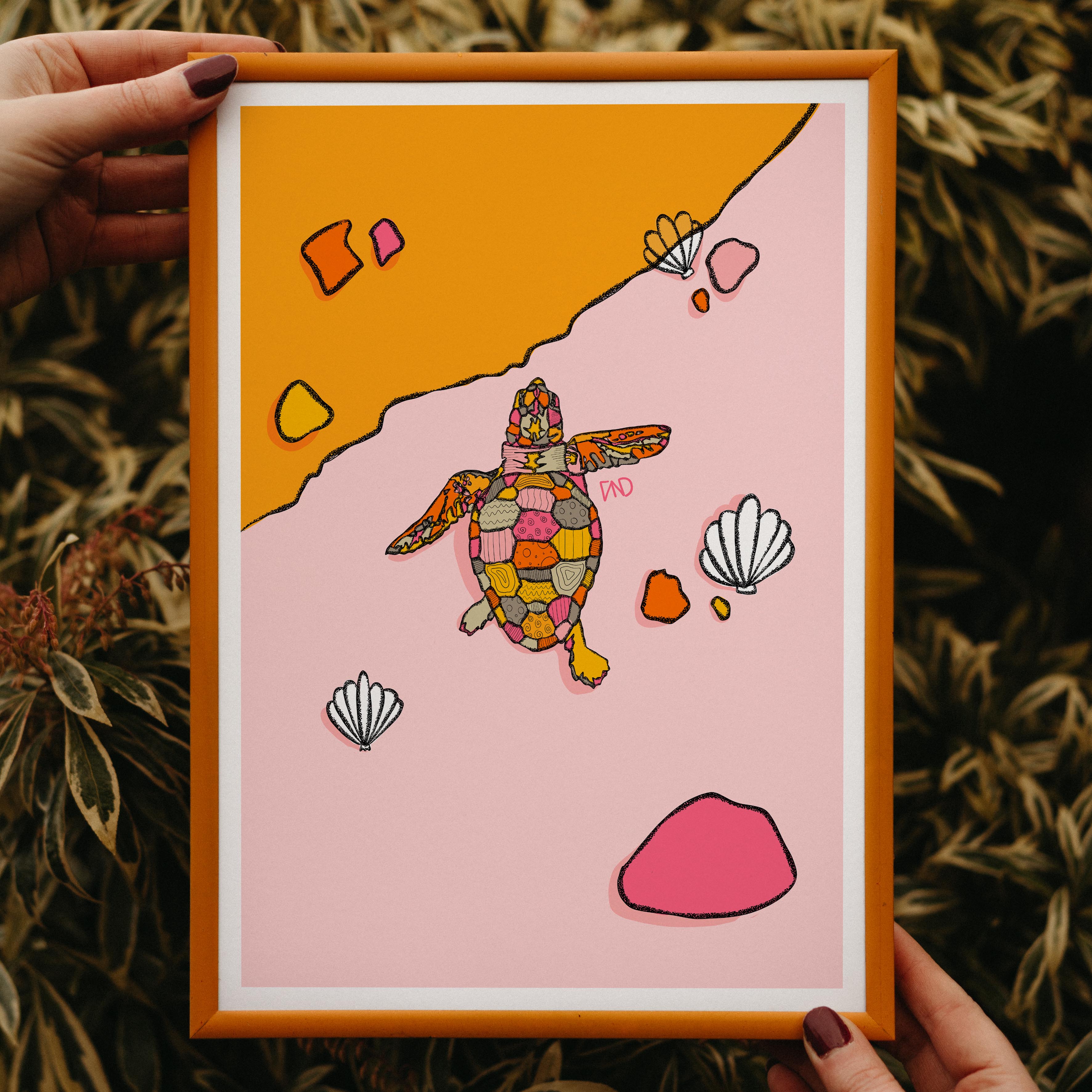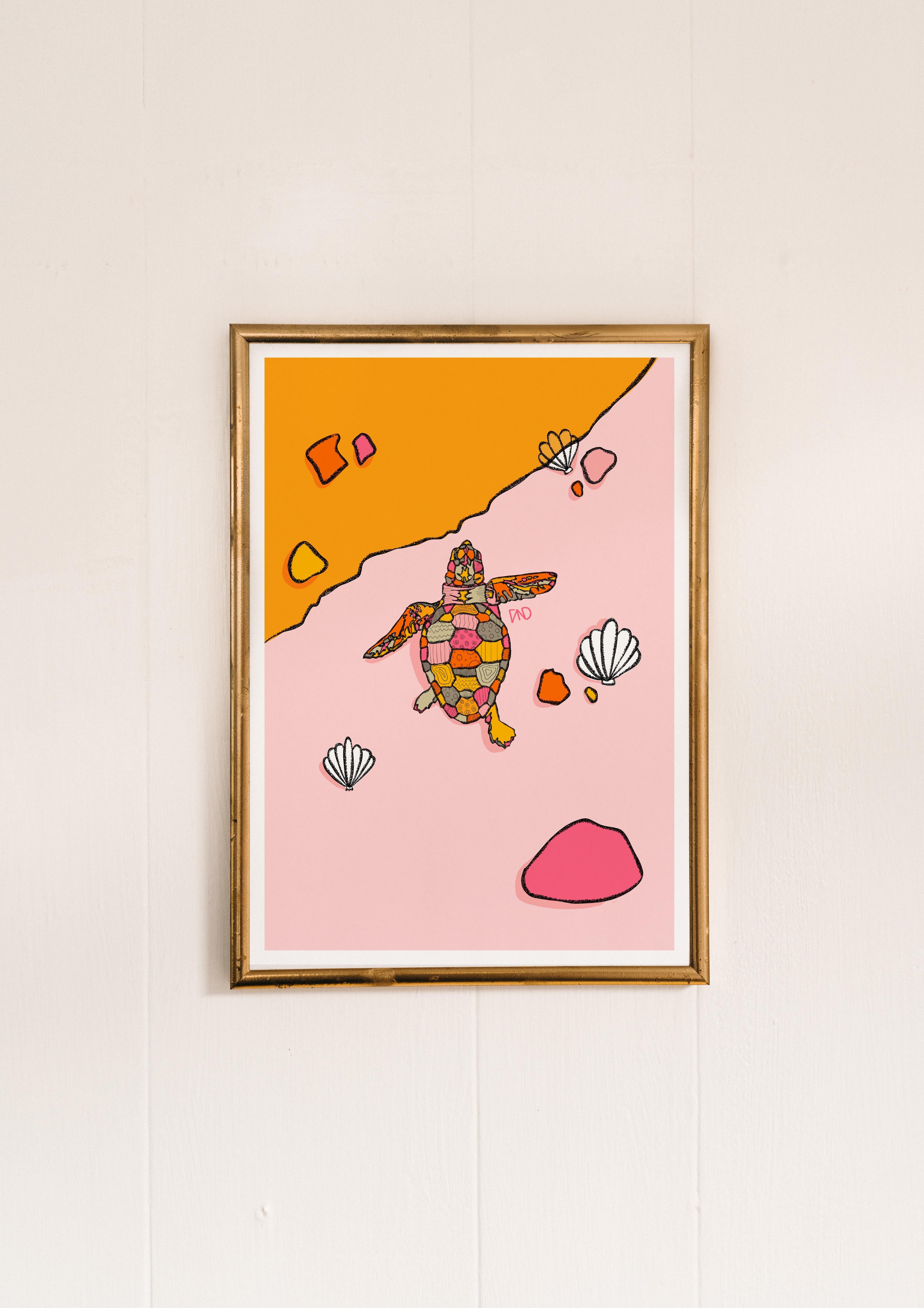 A vibrant art print of a turtle on the beach illustrated in pinks and oranges.