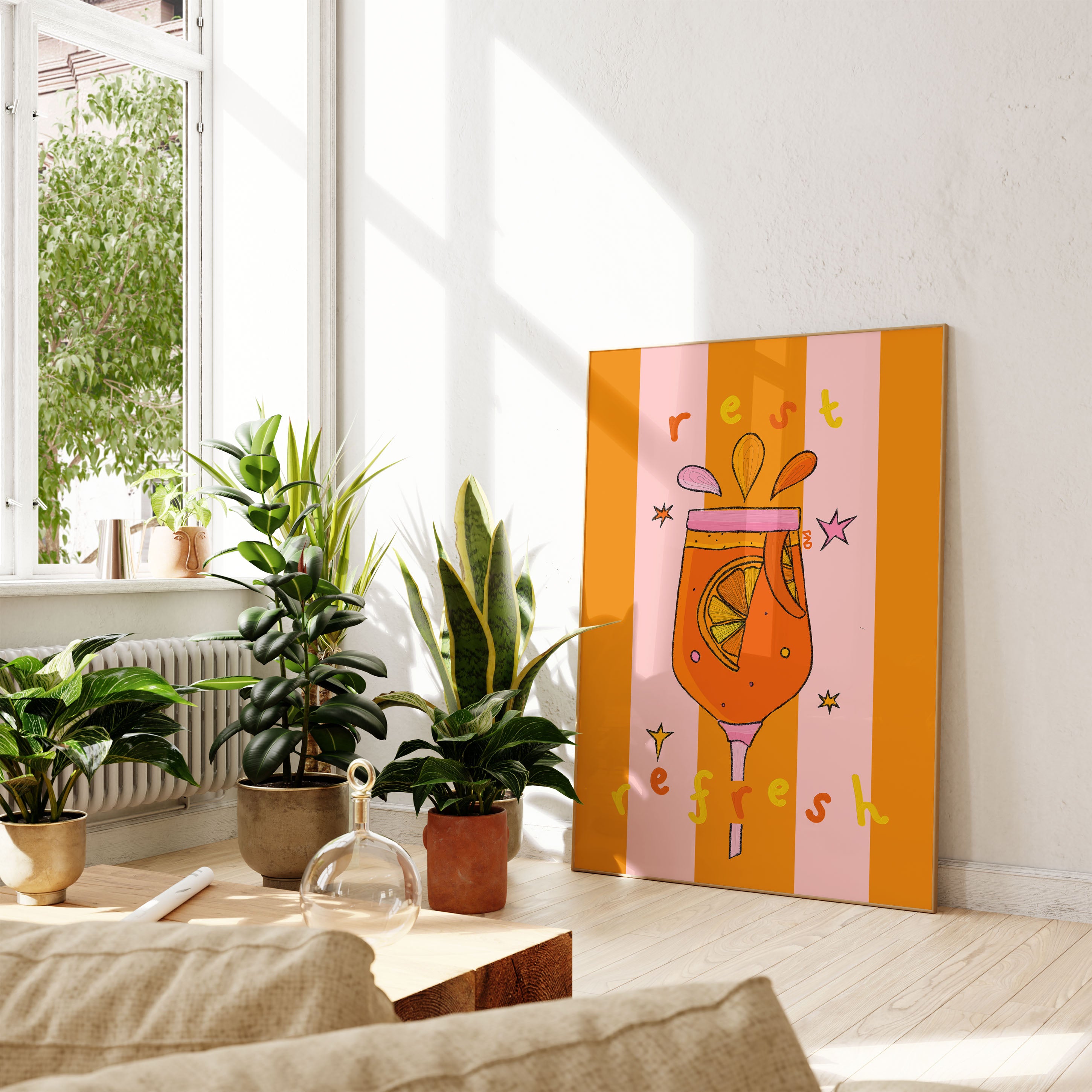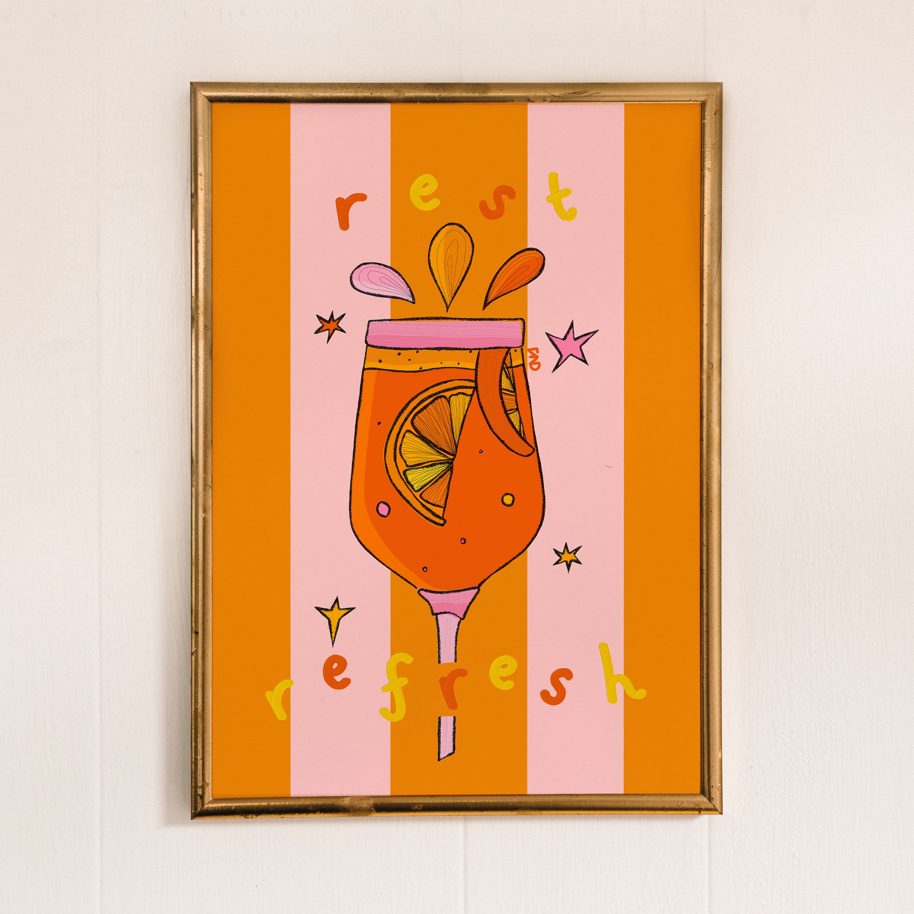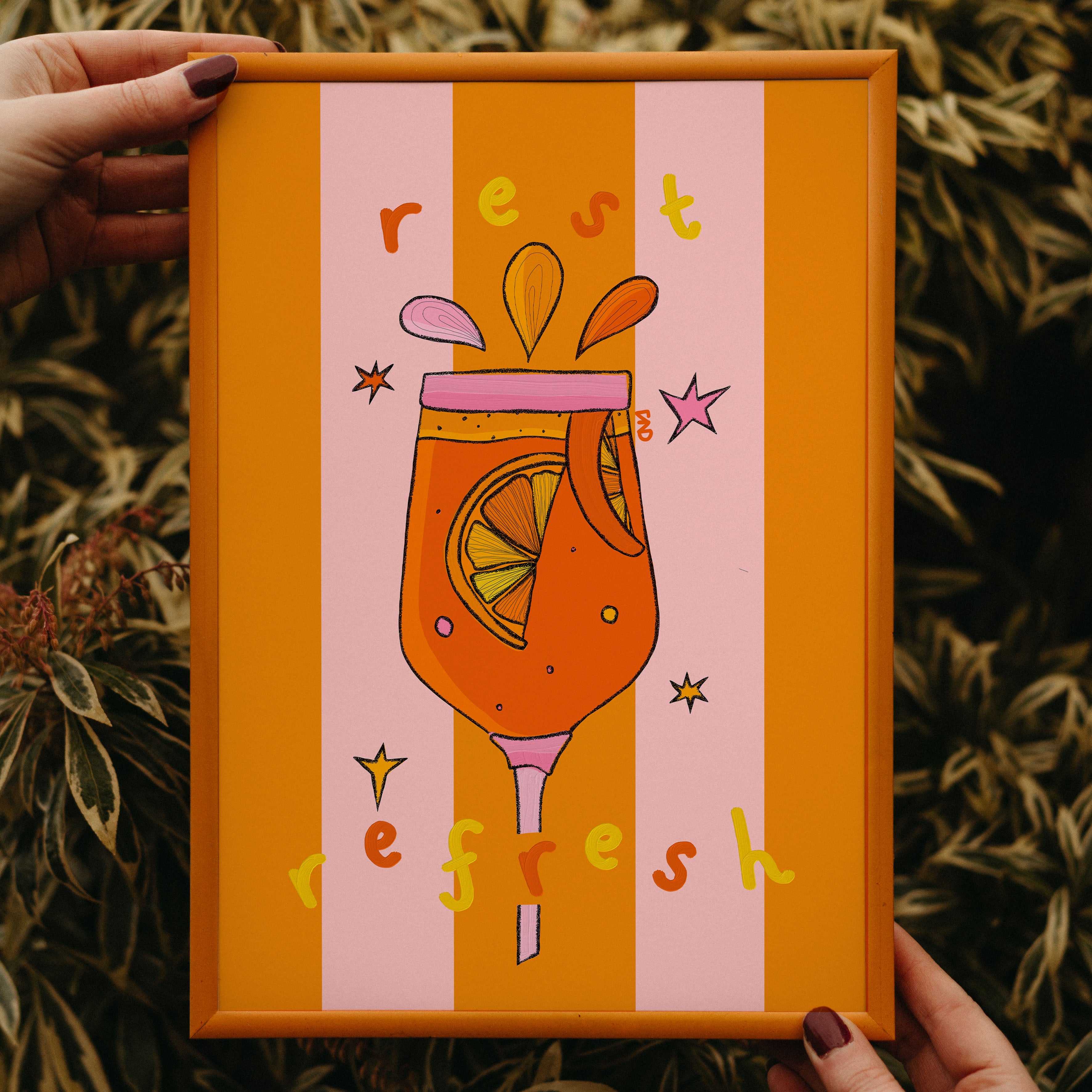 A vibrant art print of an aeporal spritz with hand-painted text 'rest refresh'. Illustrated in vibrant pink and orange.