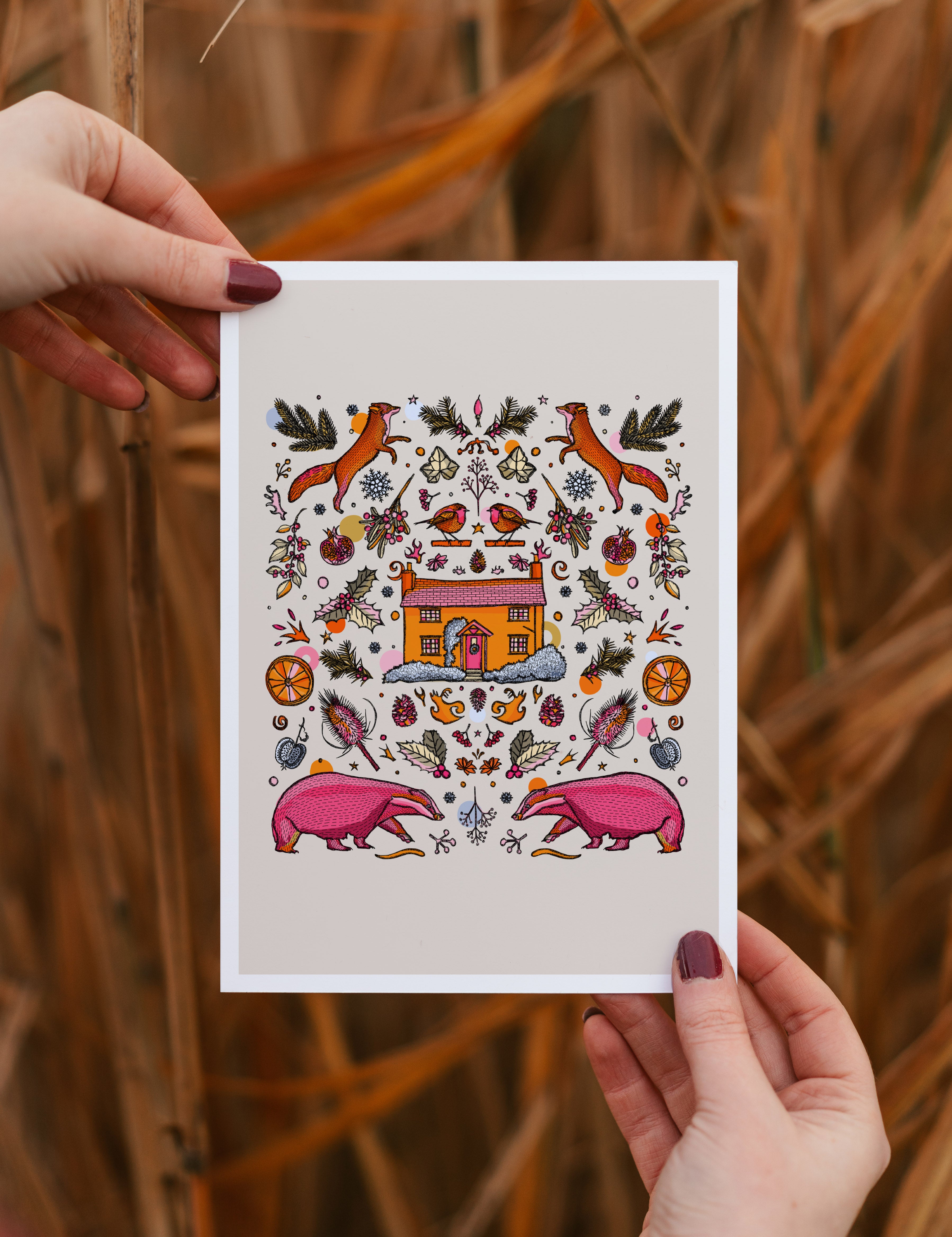 A vibrant Winter art print of foxes, badgers, robins, mistletoe, holly, and lots more British wildlife is illustrated in bright pink, orange, beige, yellow, and blue.