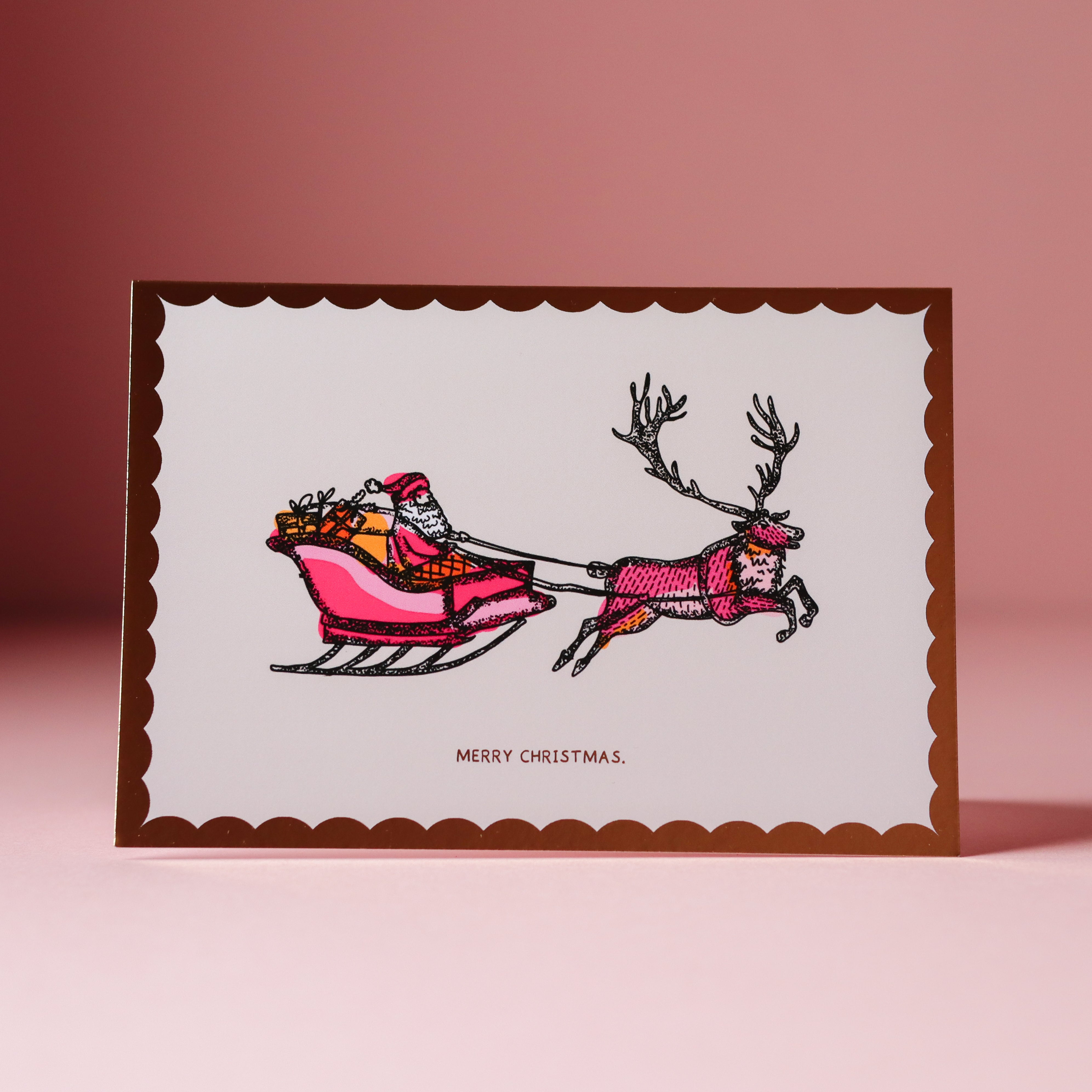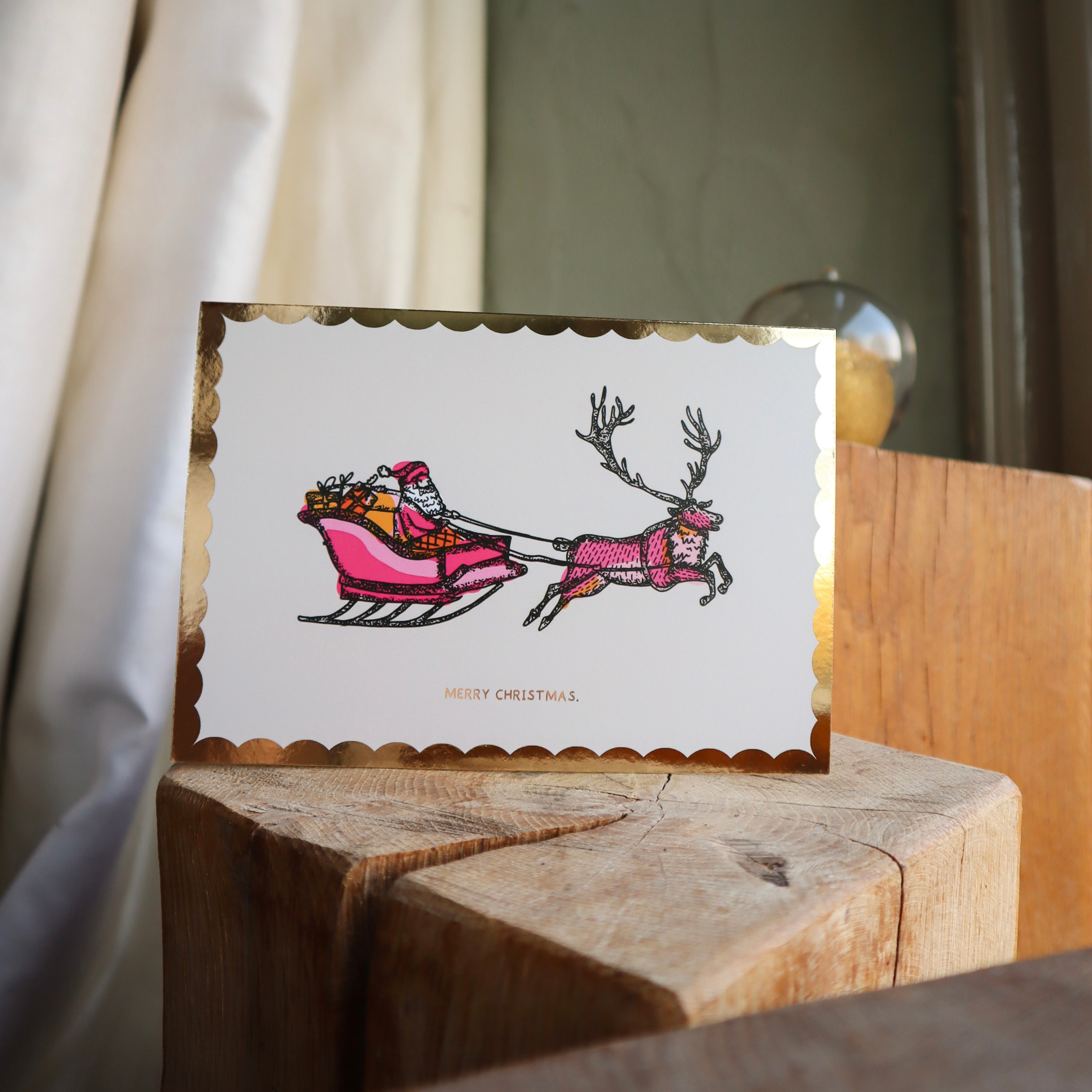 This colourful greeting card features my original artwork of Father Christmas on his sleigh. Illustrated in pink and beige with a gold foil scalloped border and text.