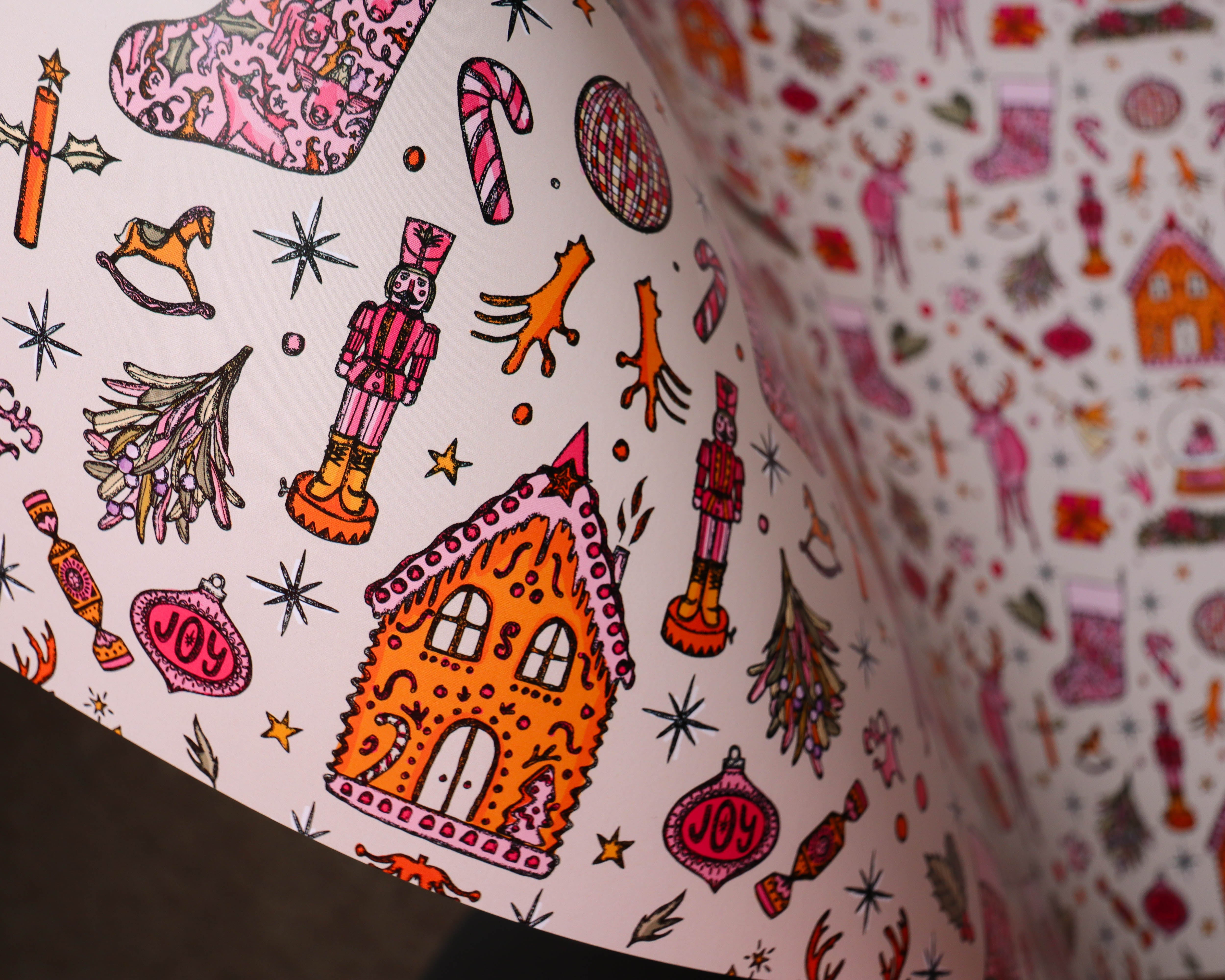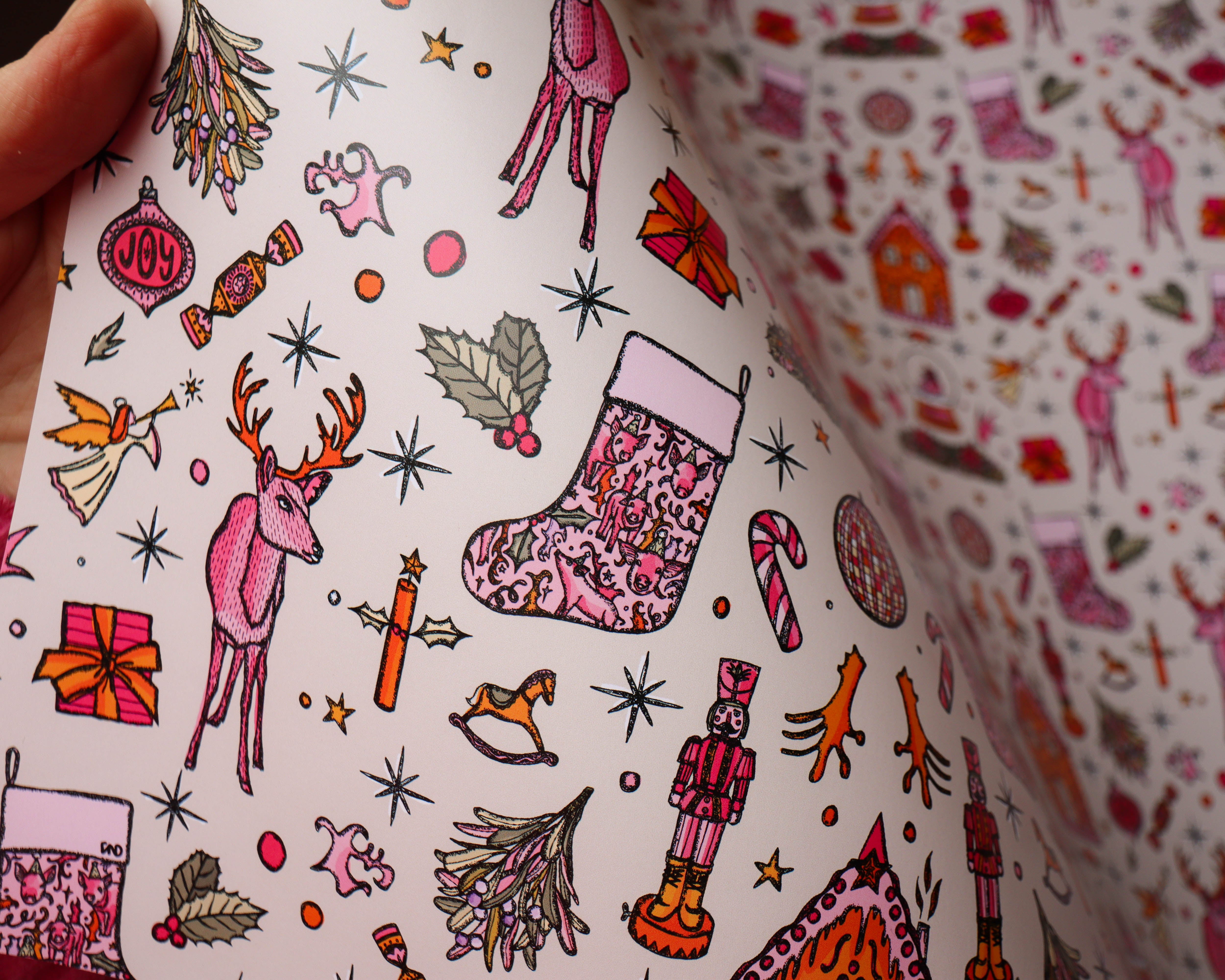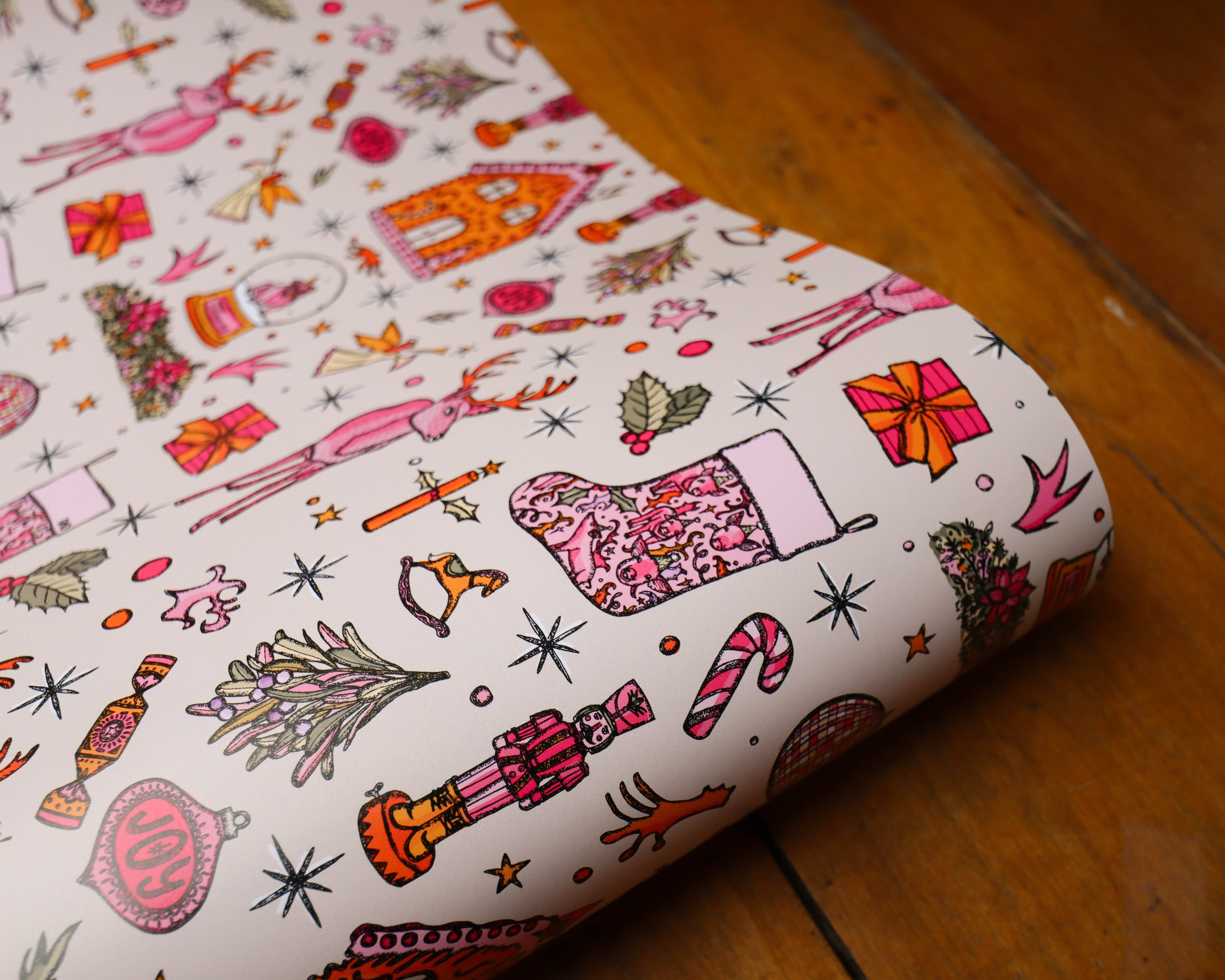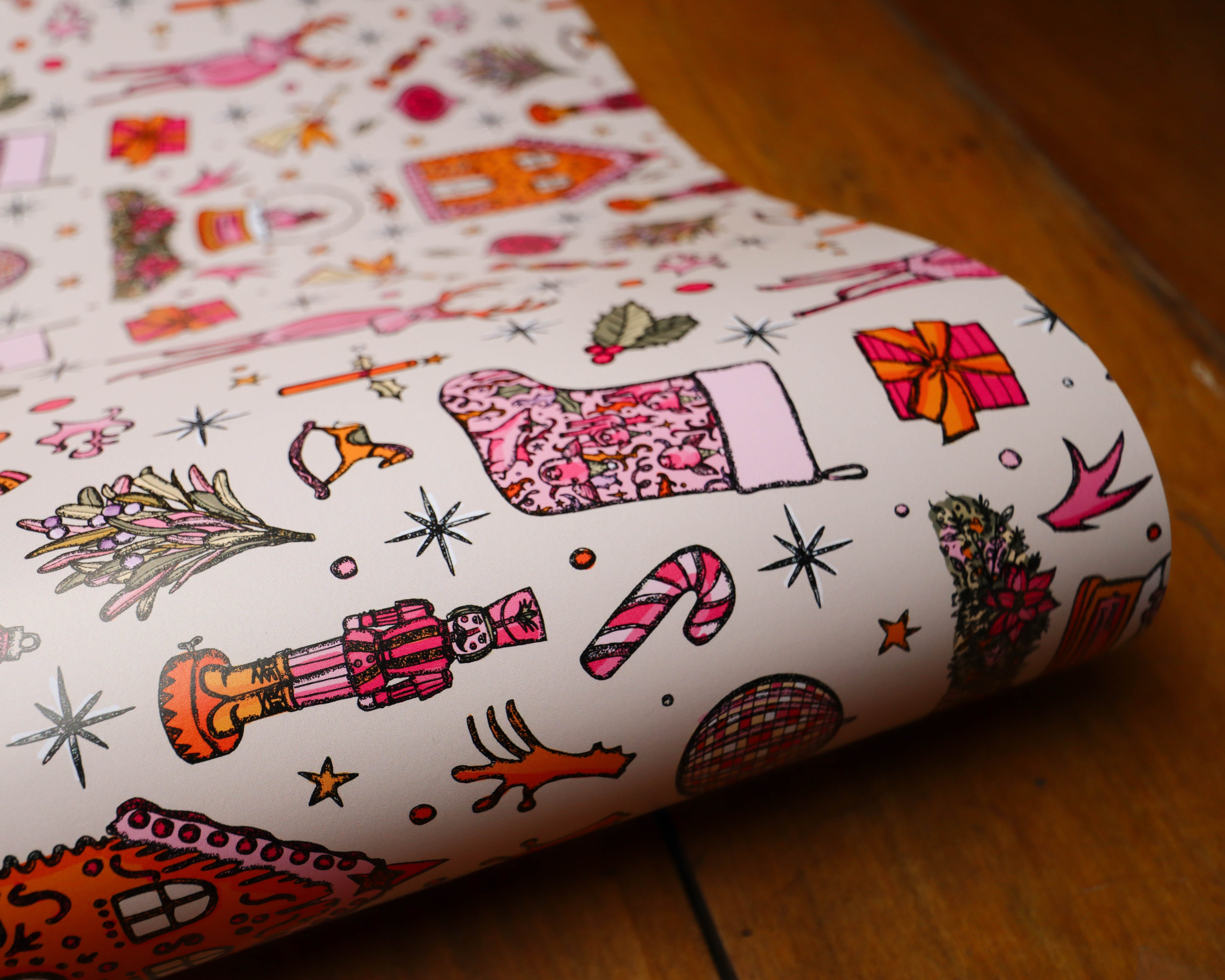 This elegant wrapping paper features my original pattern for Christmas with gingerbread houses, nutcrackers, piglet stockings, mistletoe, baubles, candy canes, reindeer, and angels. Illustrated in beige, orange, pink, green, brown, and yellow.