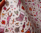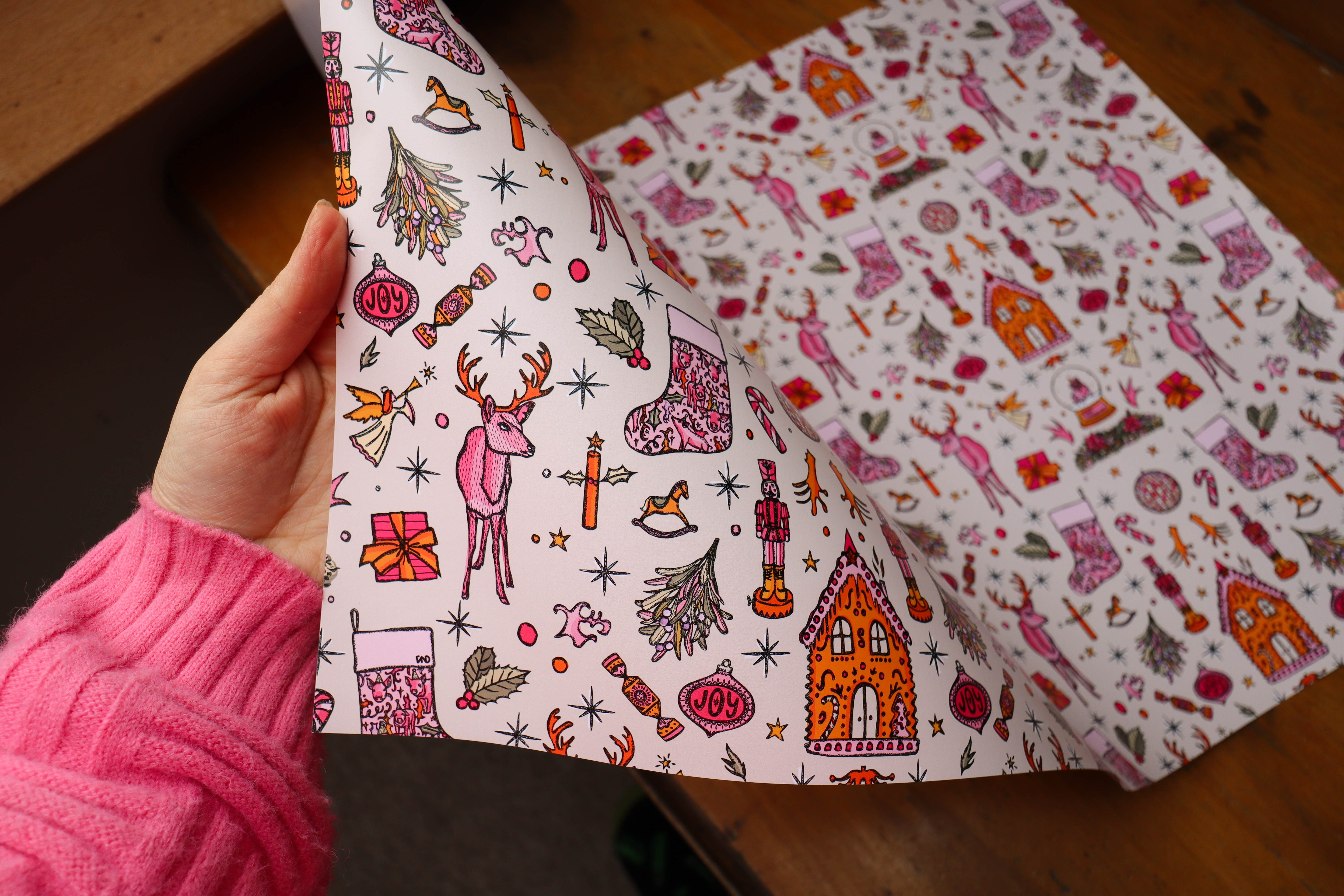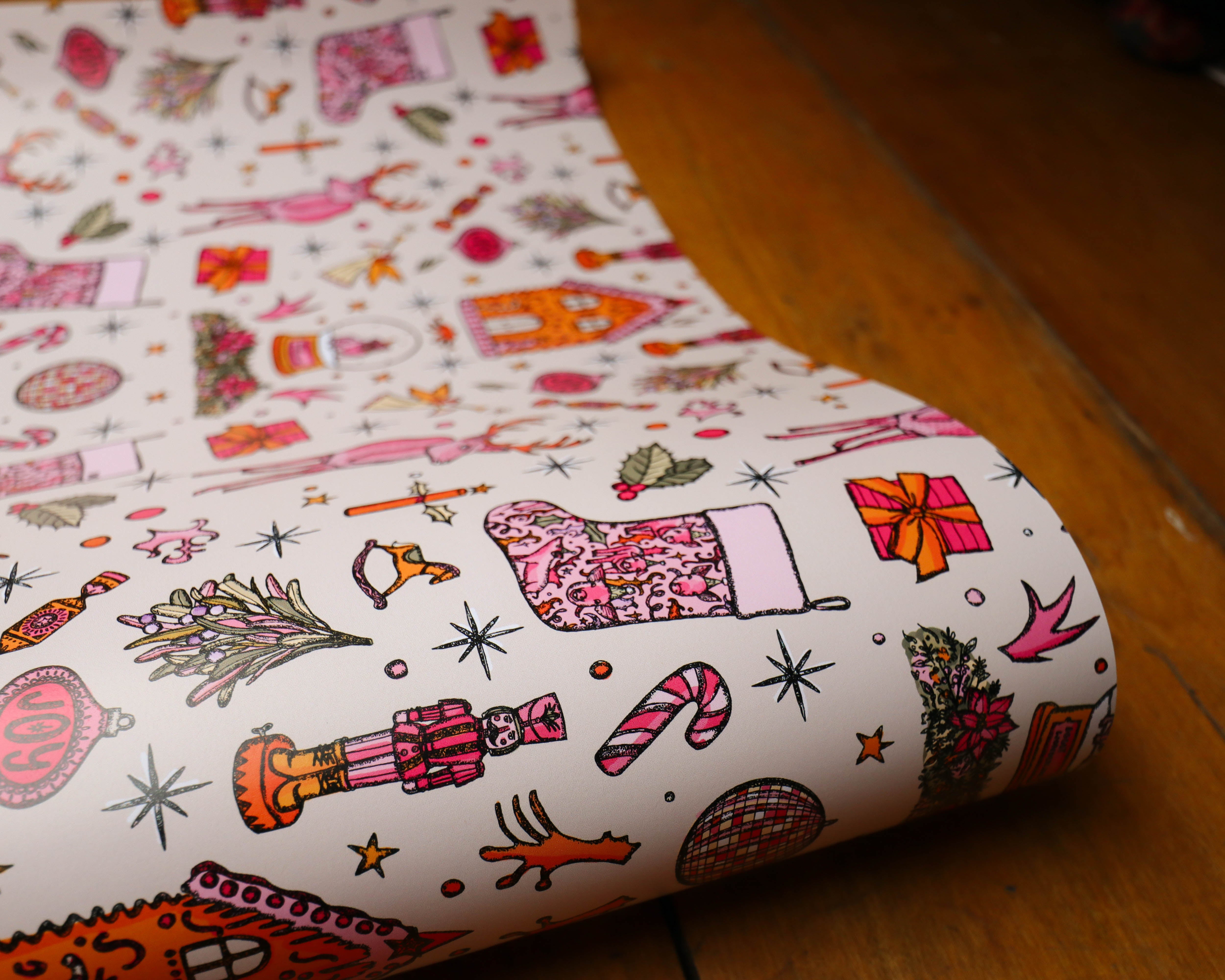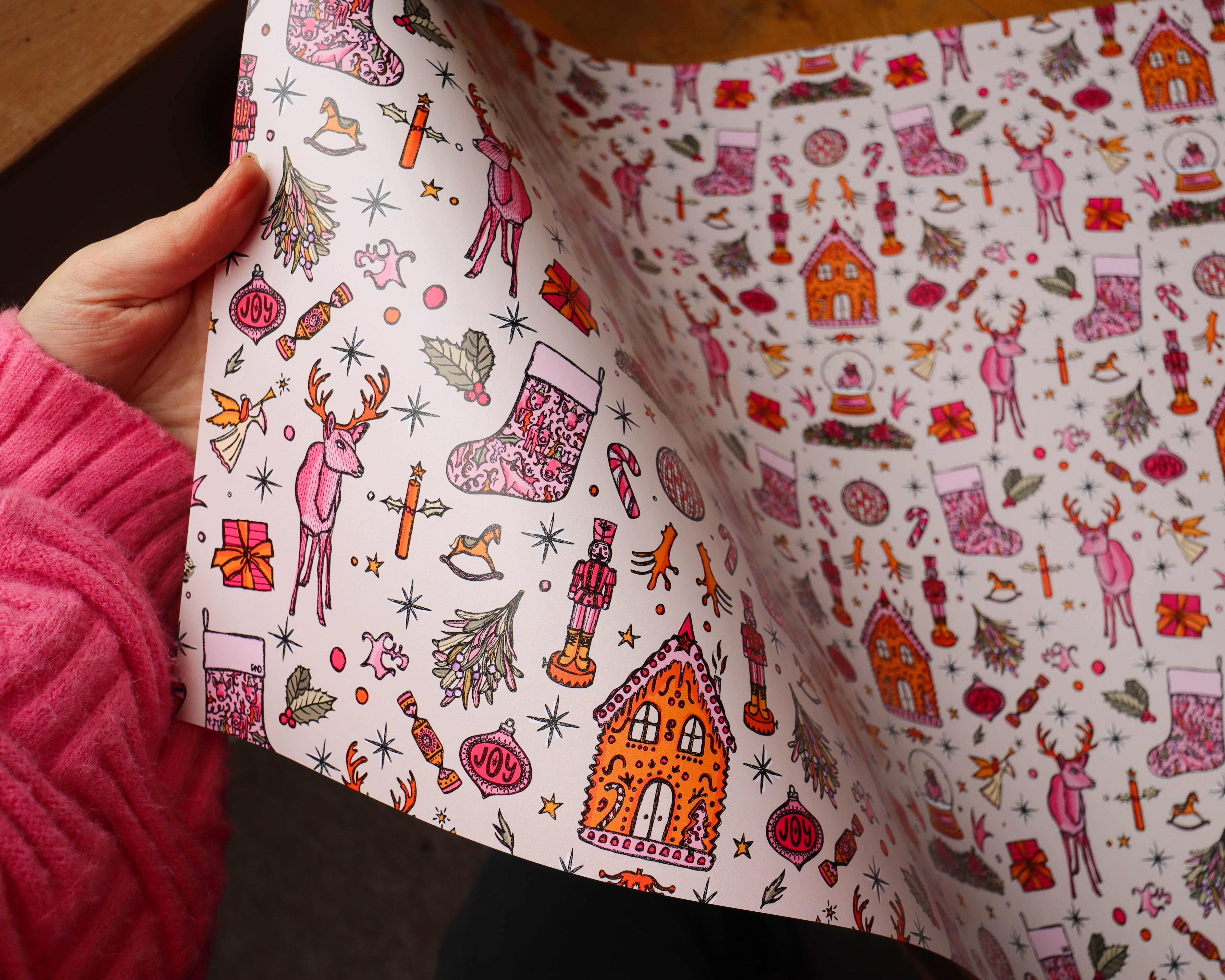 This elegant wrapping paper features my original pattern for Christmas with gingerbread houses, nutcrackers, piglet stockings, mistletoe, baubles, candy canes, reindeer, and angels. Illustrated in beige, orange, pink, green, brown, and yellow.
