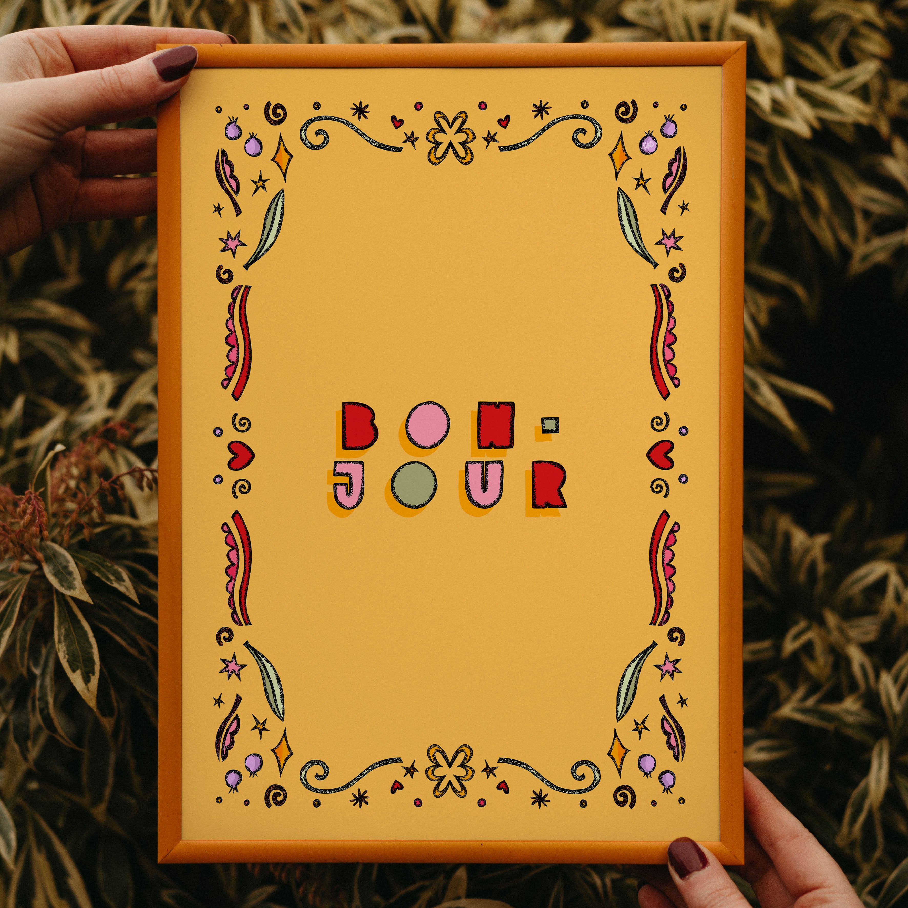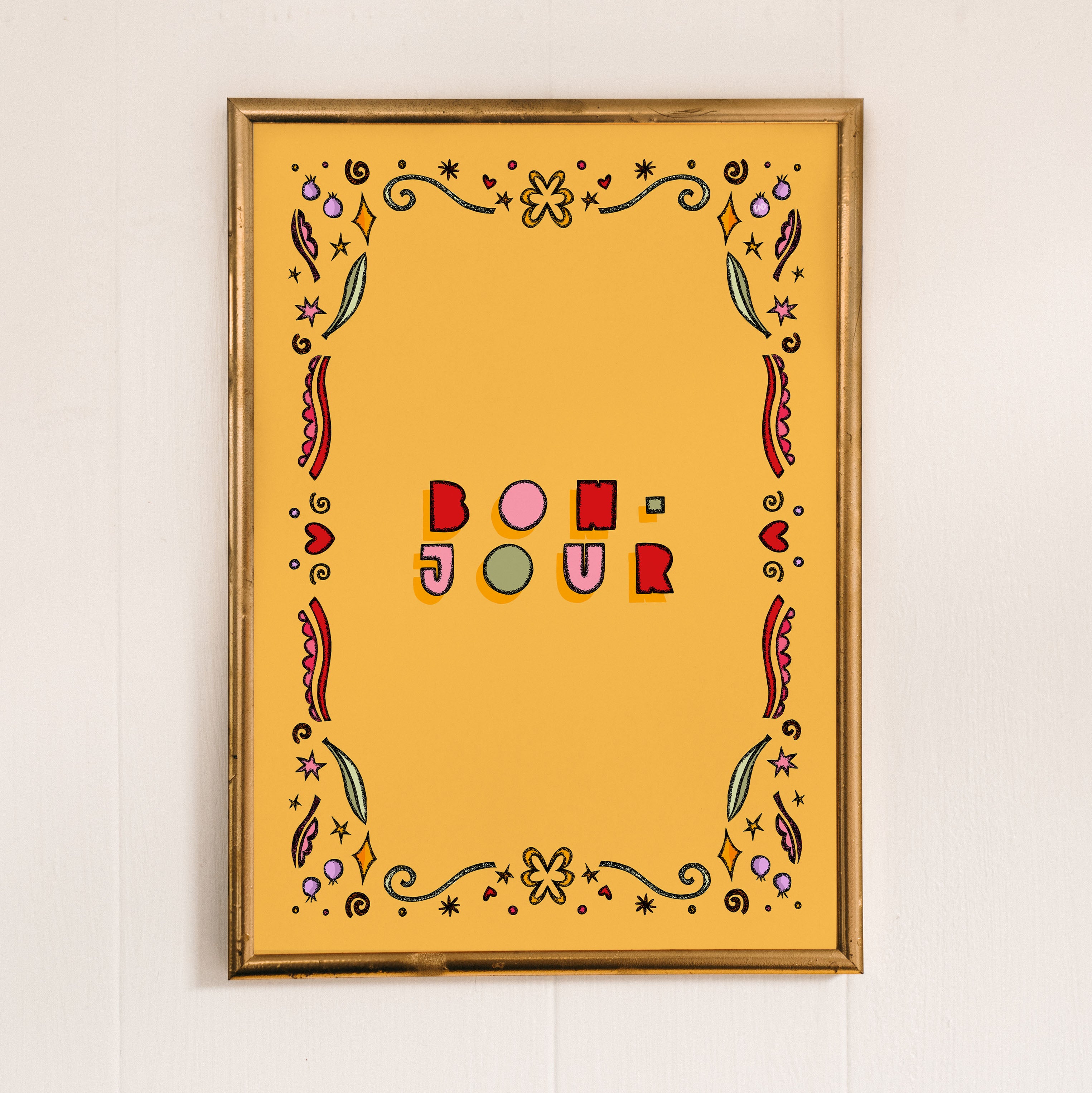An original Parisian inspired yellow art print of the word 'bonjour' with an illustrated border.