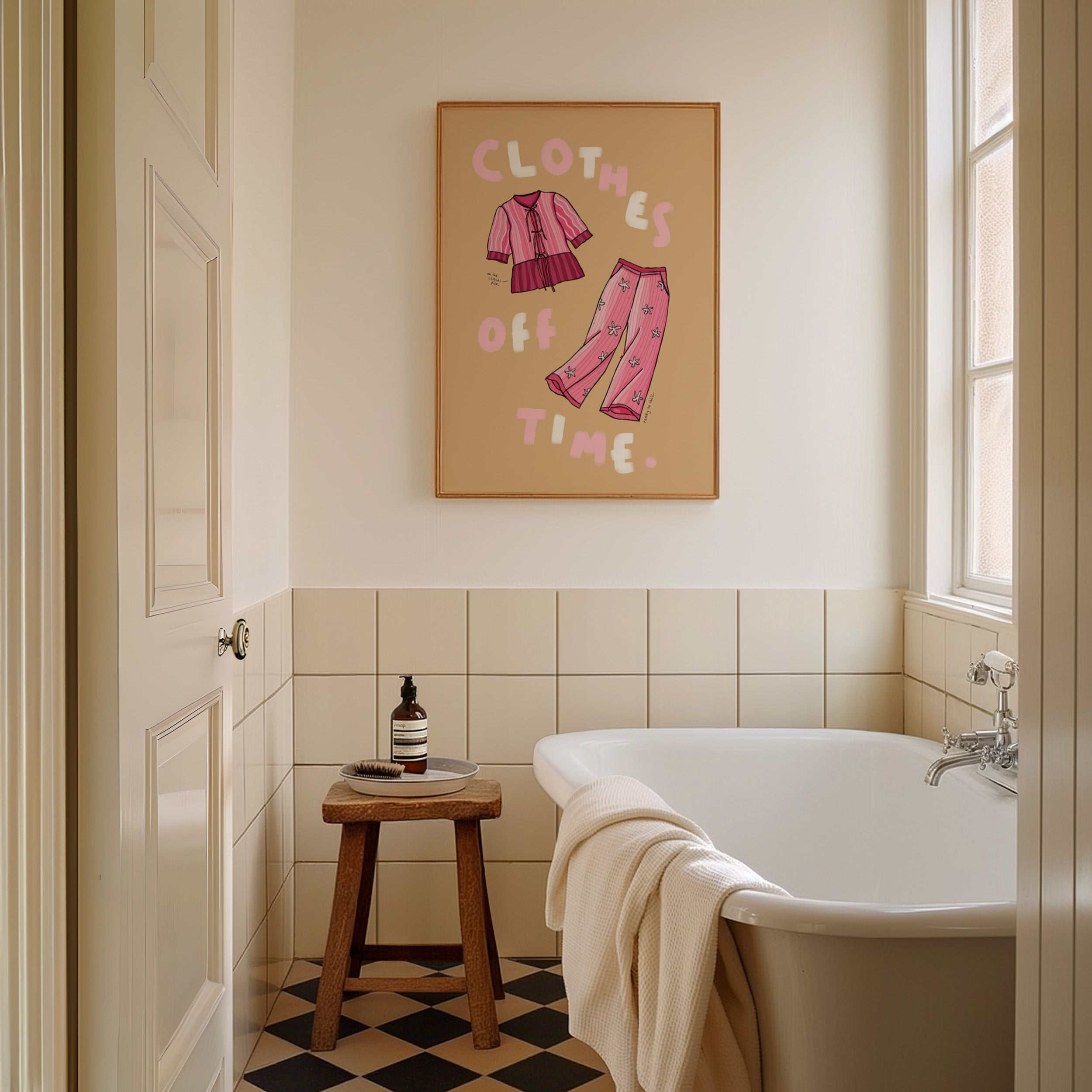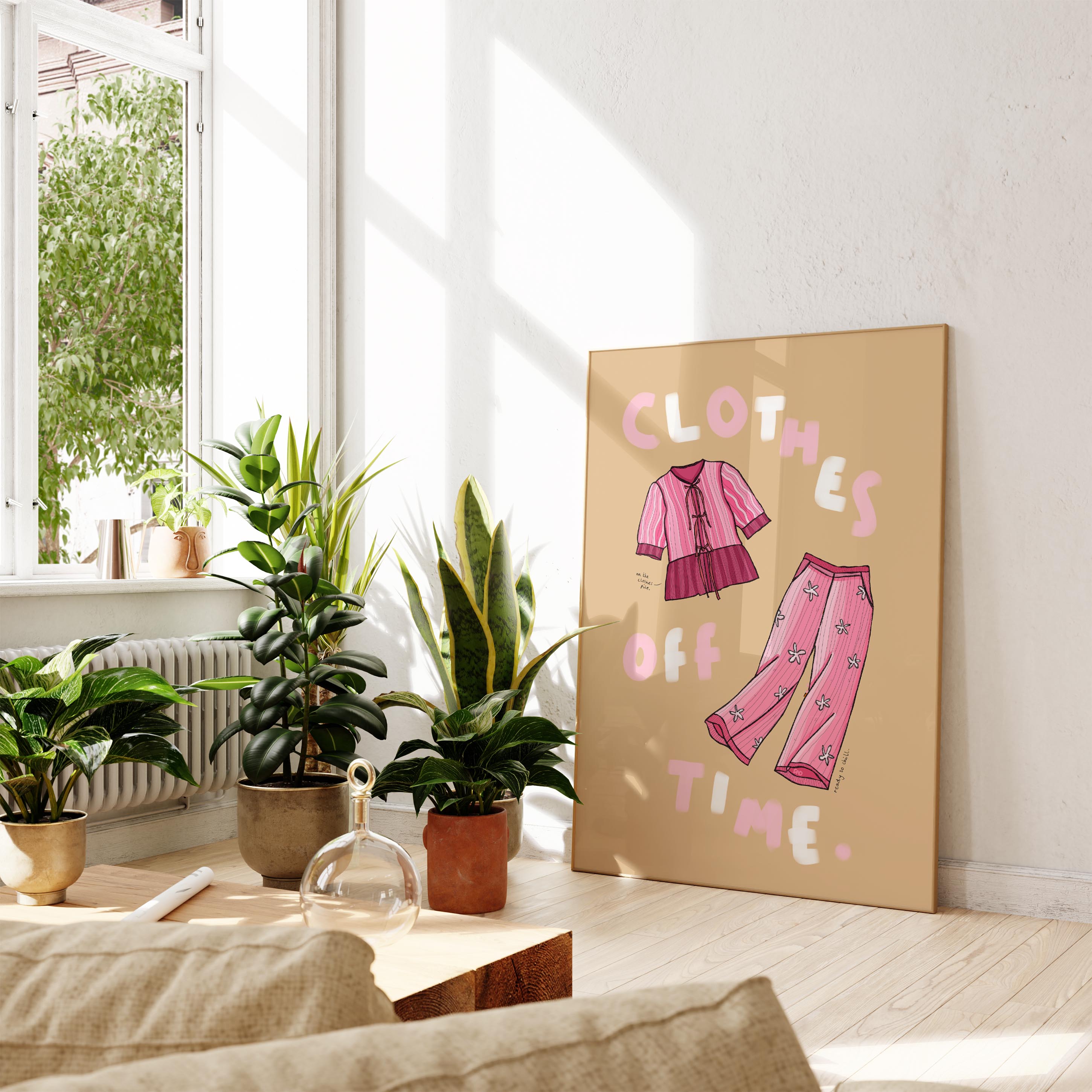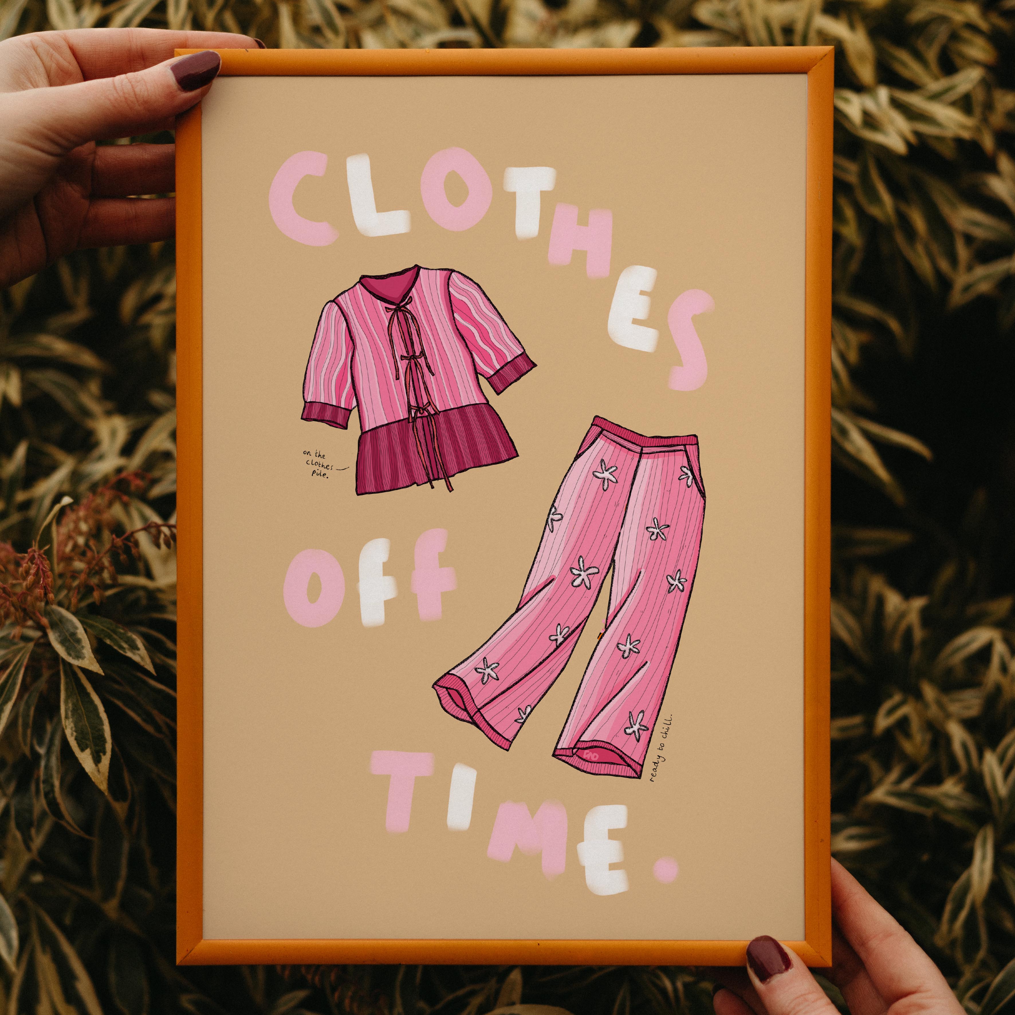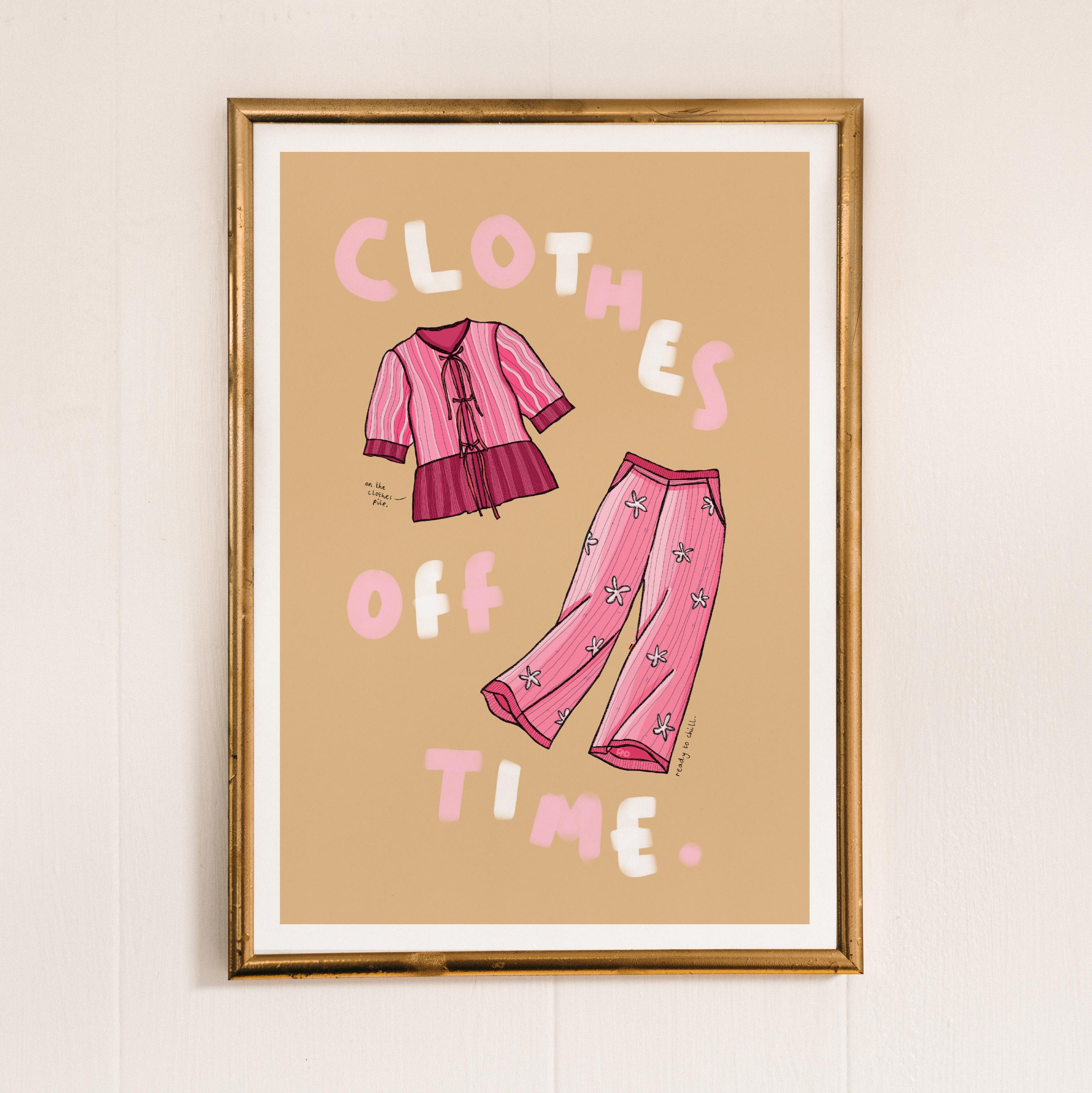 A vibrant lifestyle art print of a pink linen co-ord with the quote 'clothes off time' painted around.