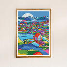 A vibrant art print of the beautiful Greenland illustrated in bright blues, reds, yellows, greens, purples, and oranges.