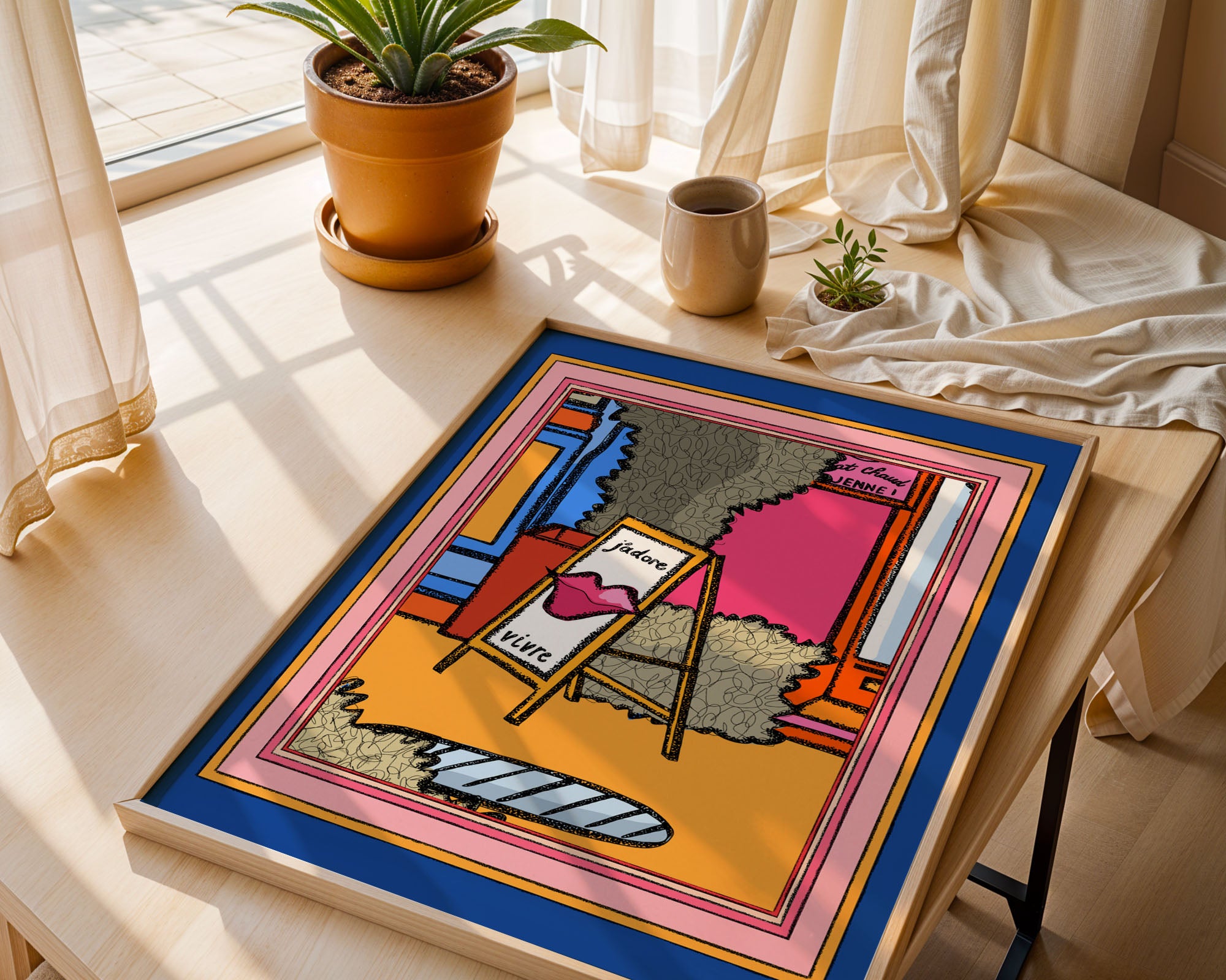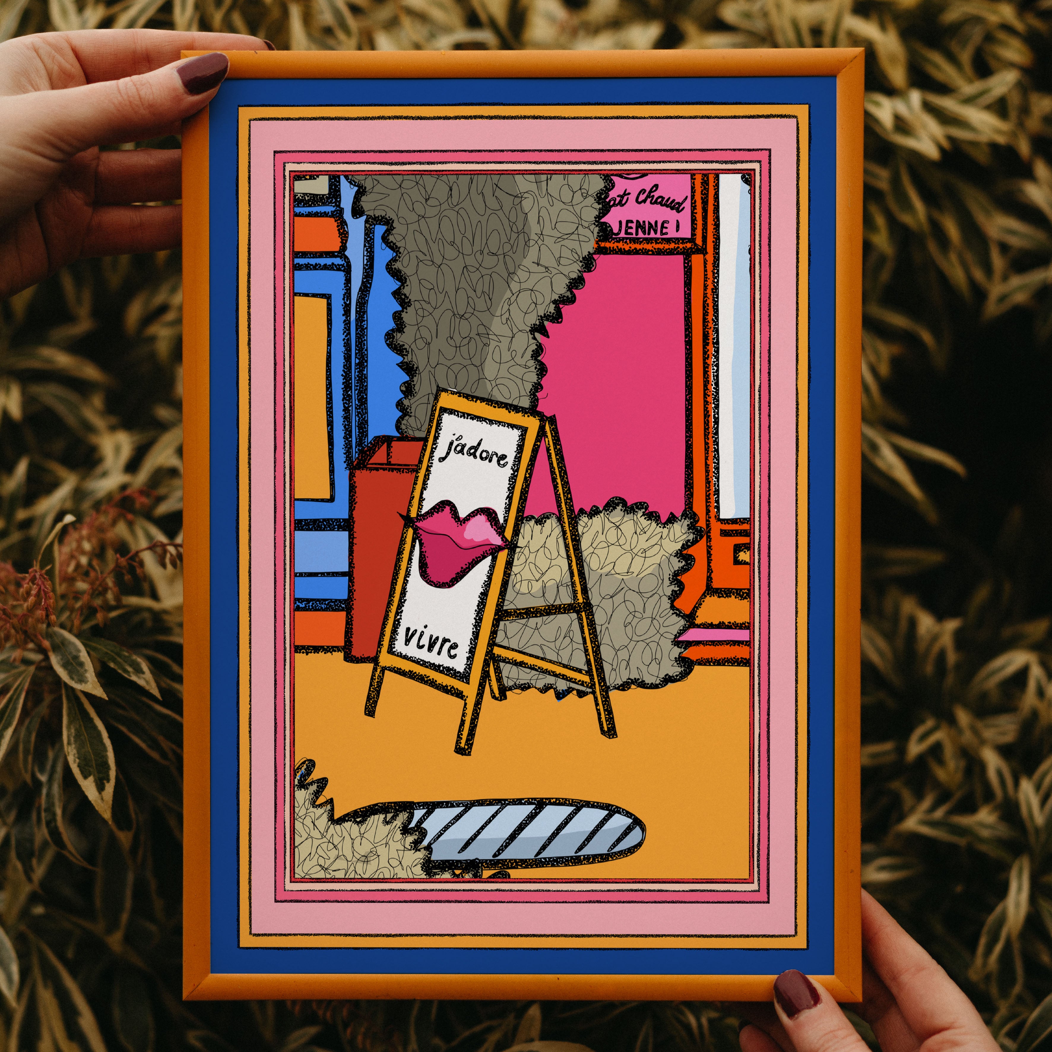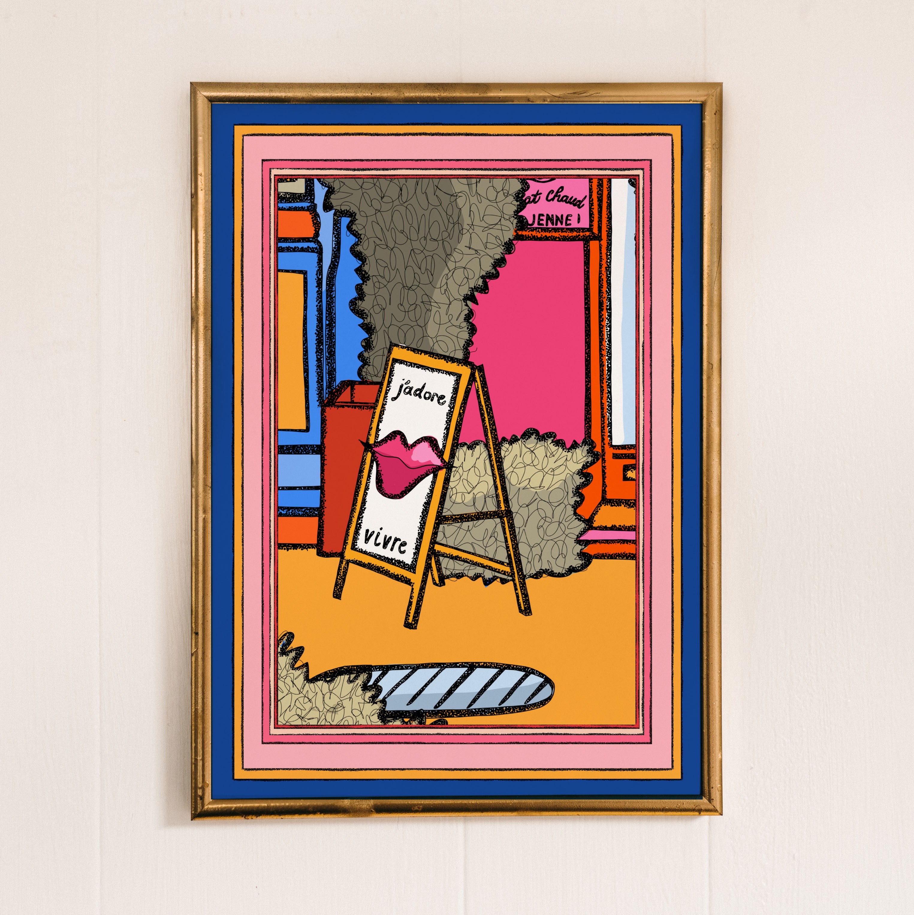 An original Parisian inspired print of a pair of juicy lips on a sign reading 'j'adore vivre' translated to I love life. Illustrated in bright pinks, greens, blues, and yellows.