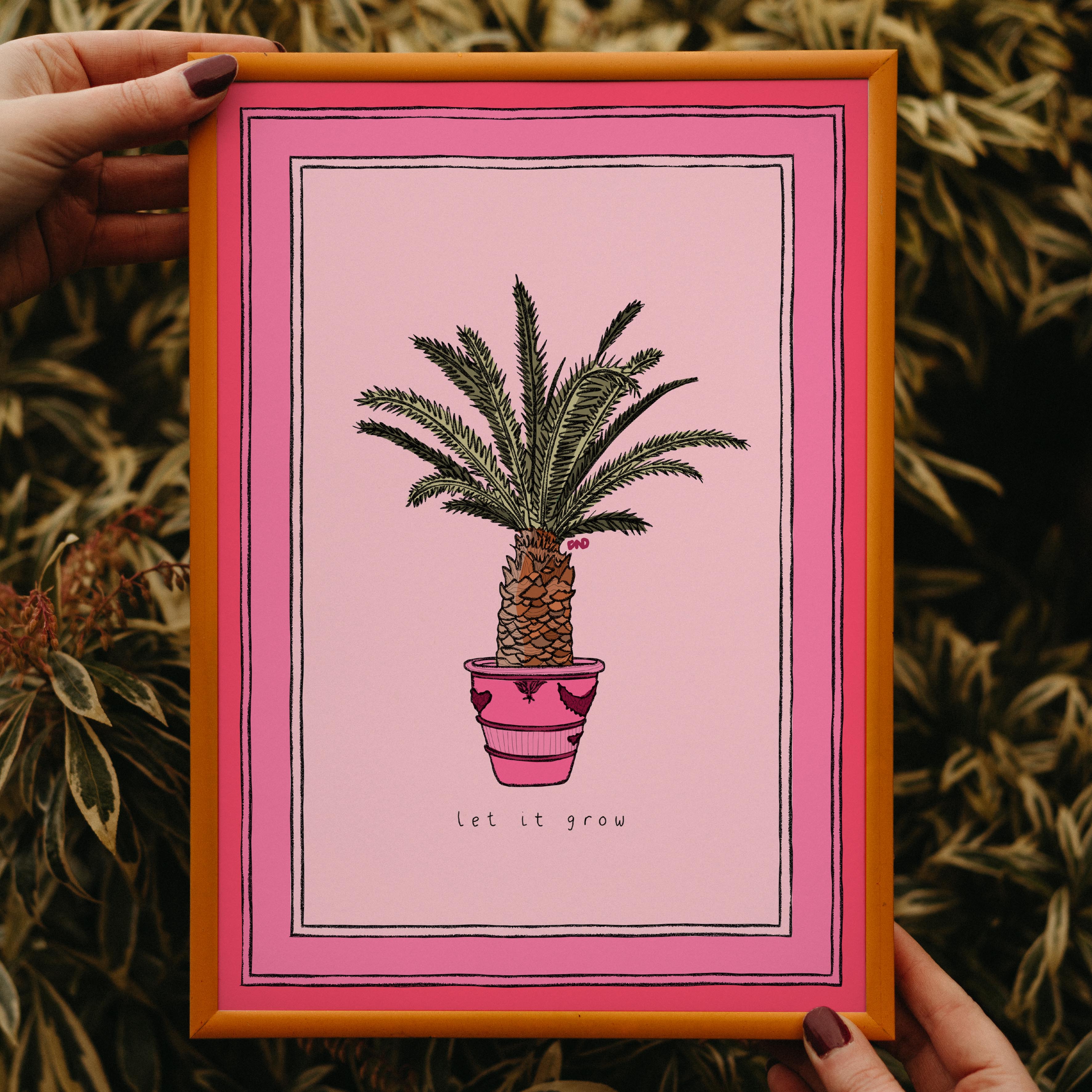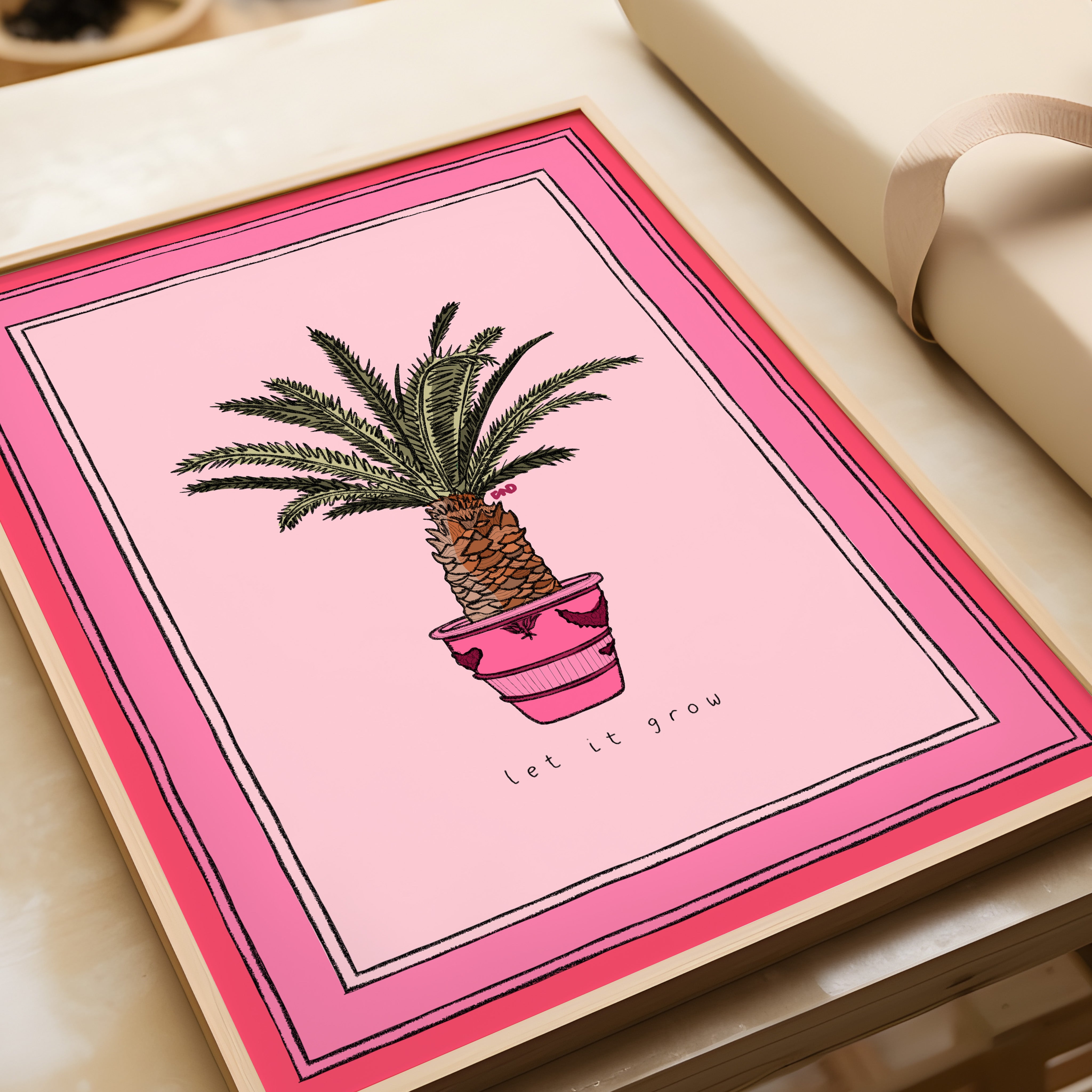 A vibrant pink art print of a potted palm tree with the quote 'let it grow'.