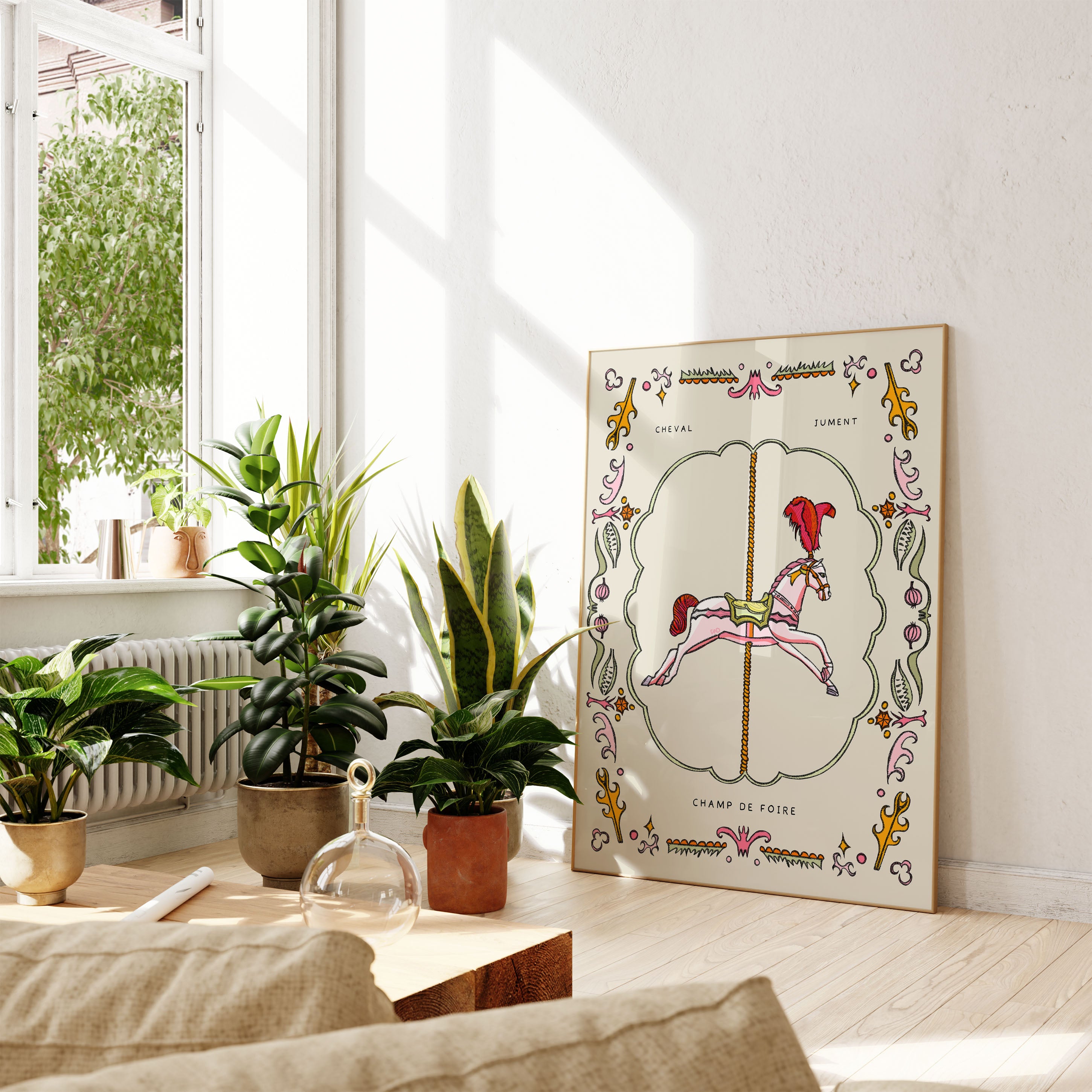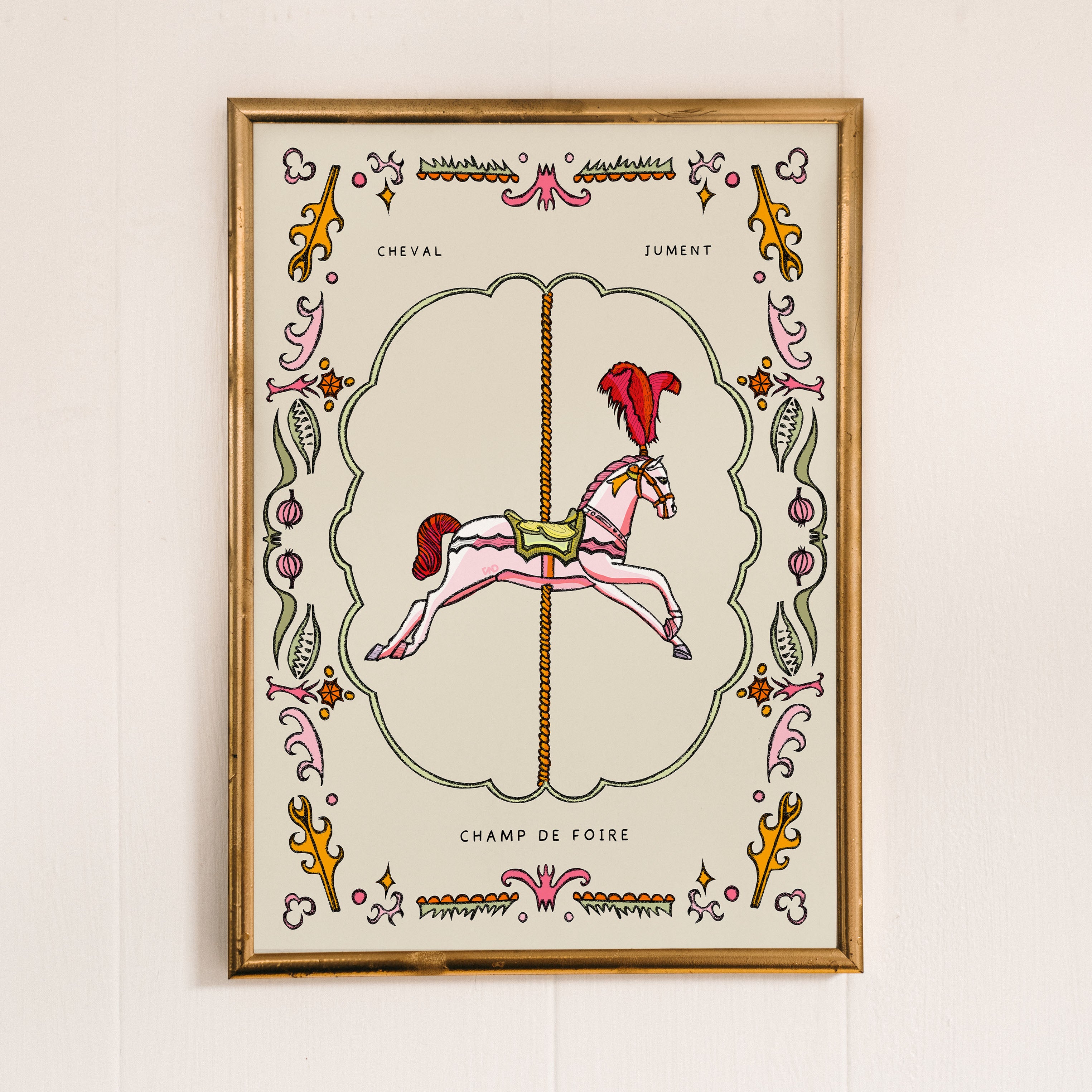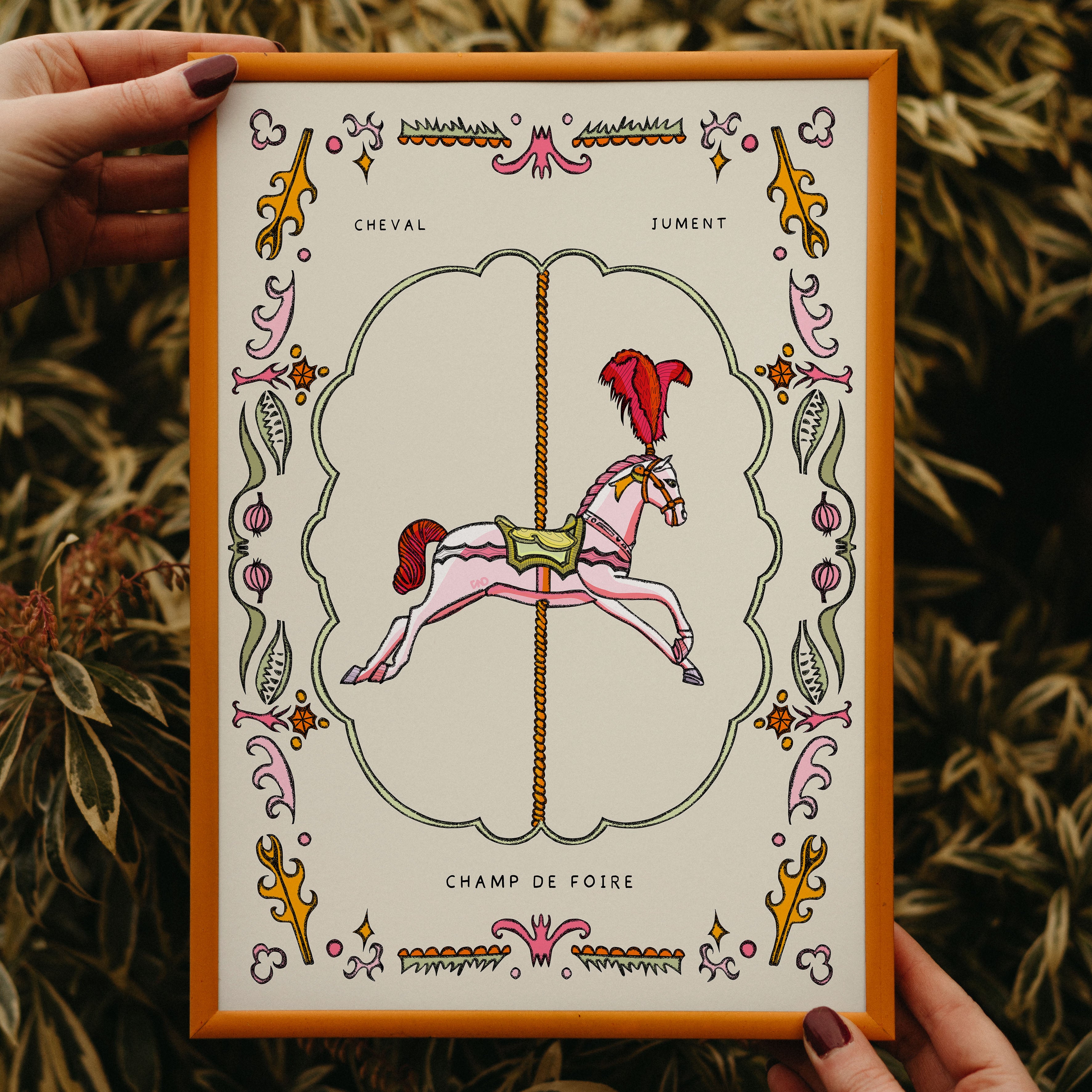 A hand-illustrated art print of a carousel horse with a botanical border with the text ' cheval' the French word for horse (masculine), 'jument' French word for horse (feminine) and 'champ de foire' French phrase for fairground. Illustrated in creamy pastel pinks, beige, green, and orange.