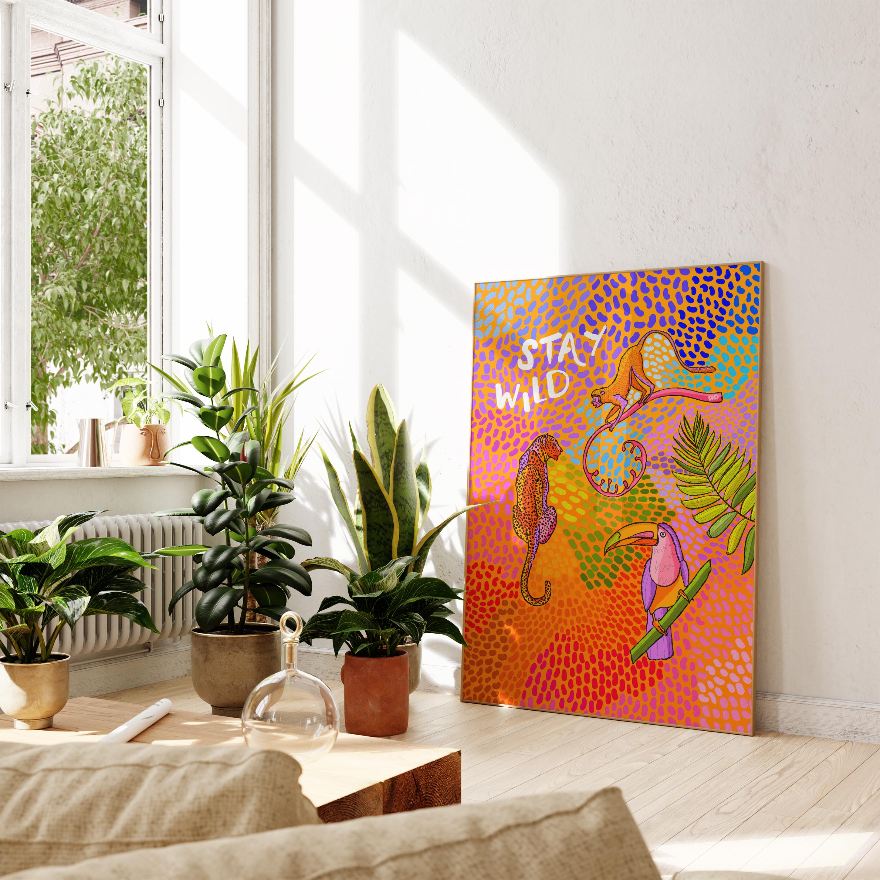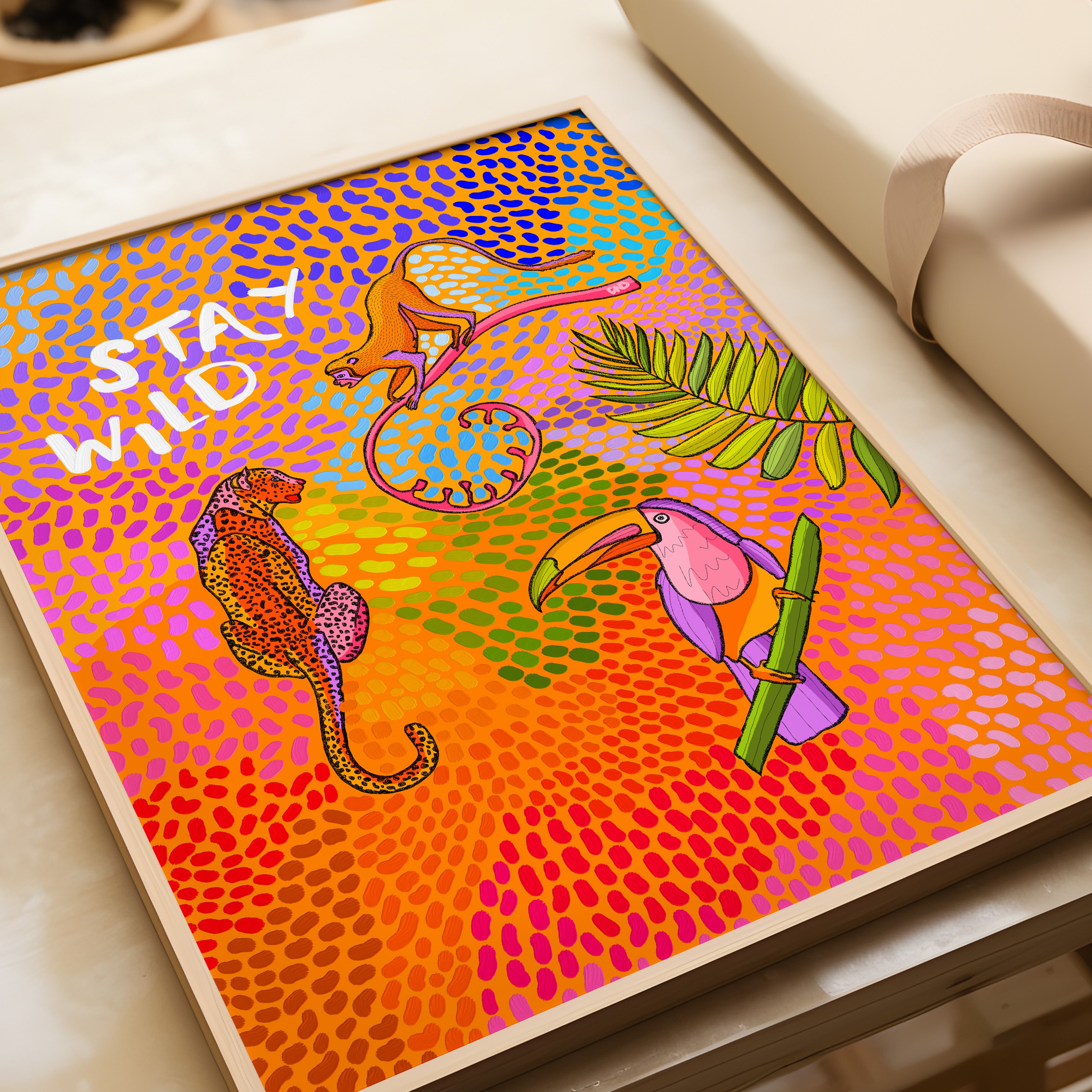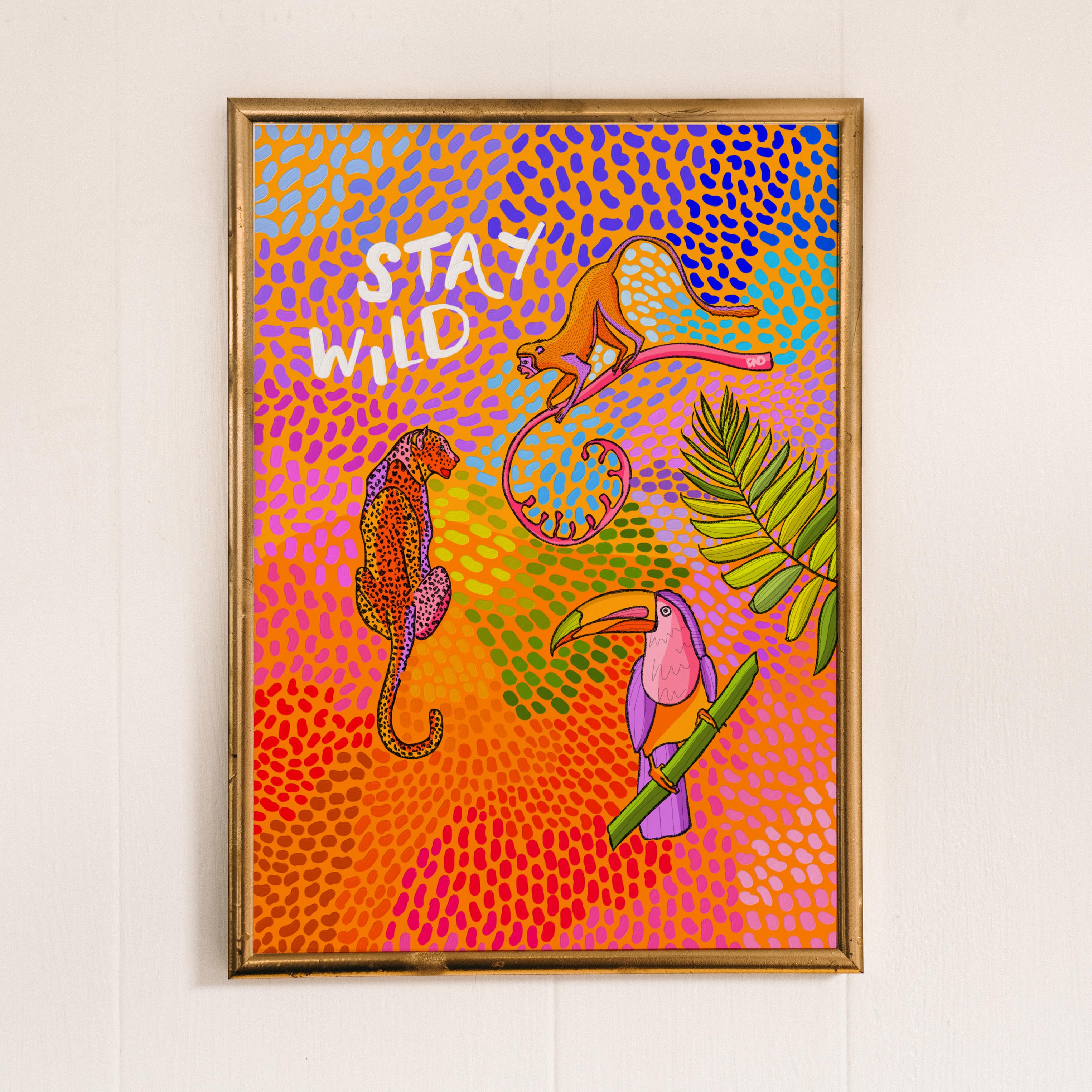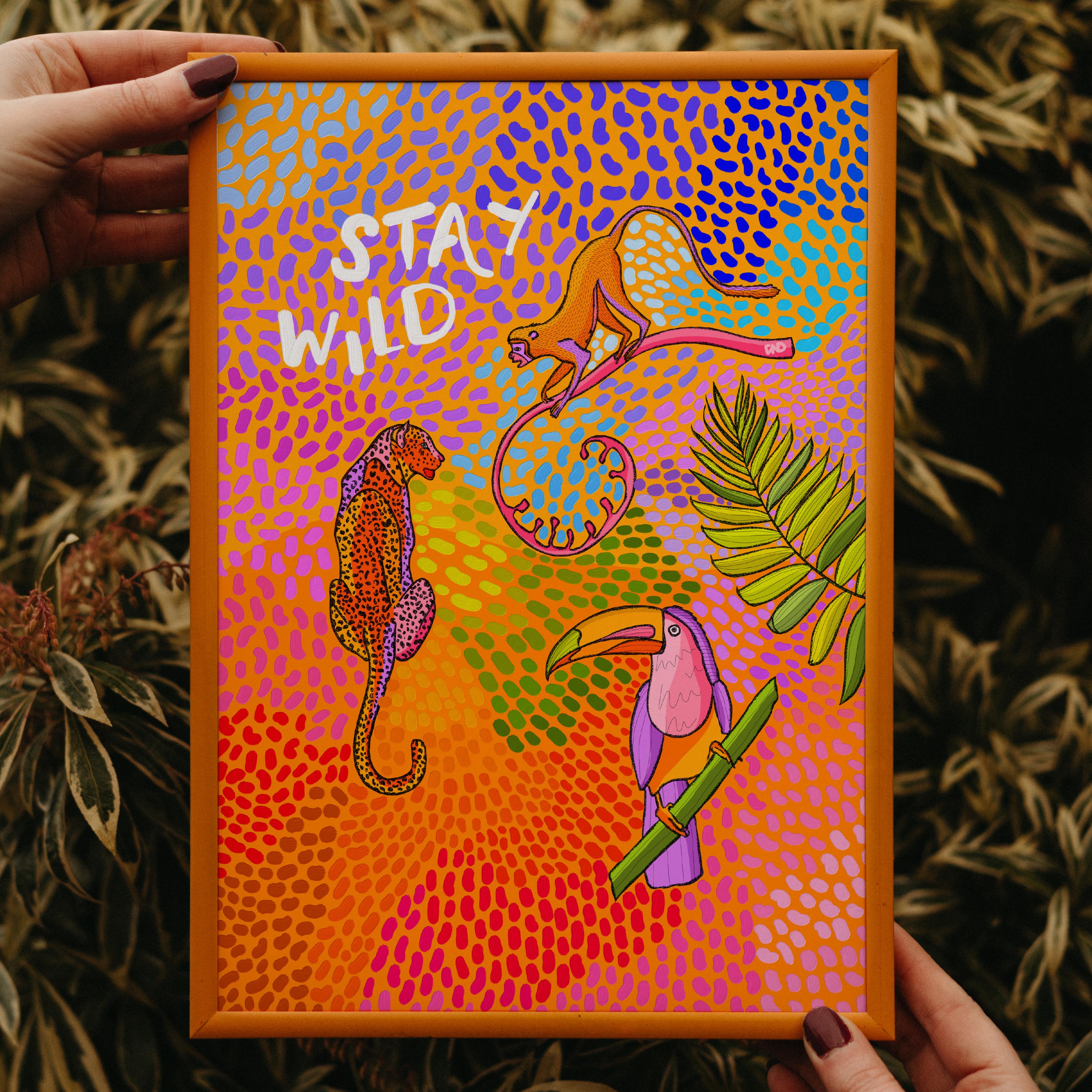 A vibrant art print of a monkey, toucan, and leopard surrounded by flowers, leaves, and multi-coloured paint strokes and the quote 'stay wild'.