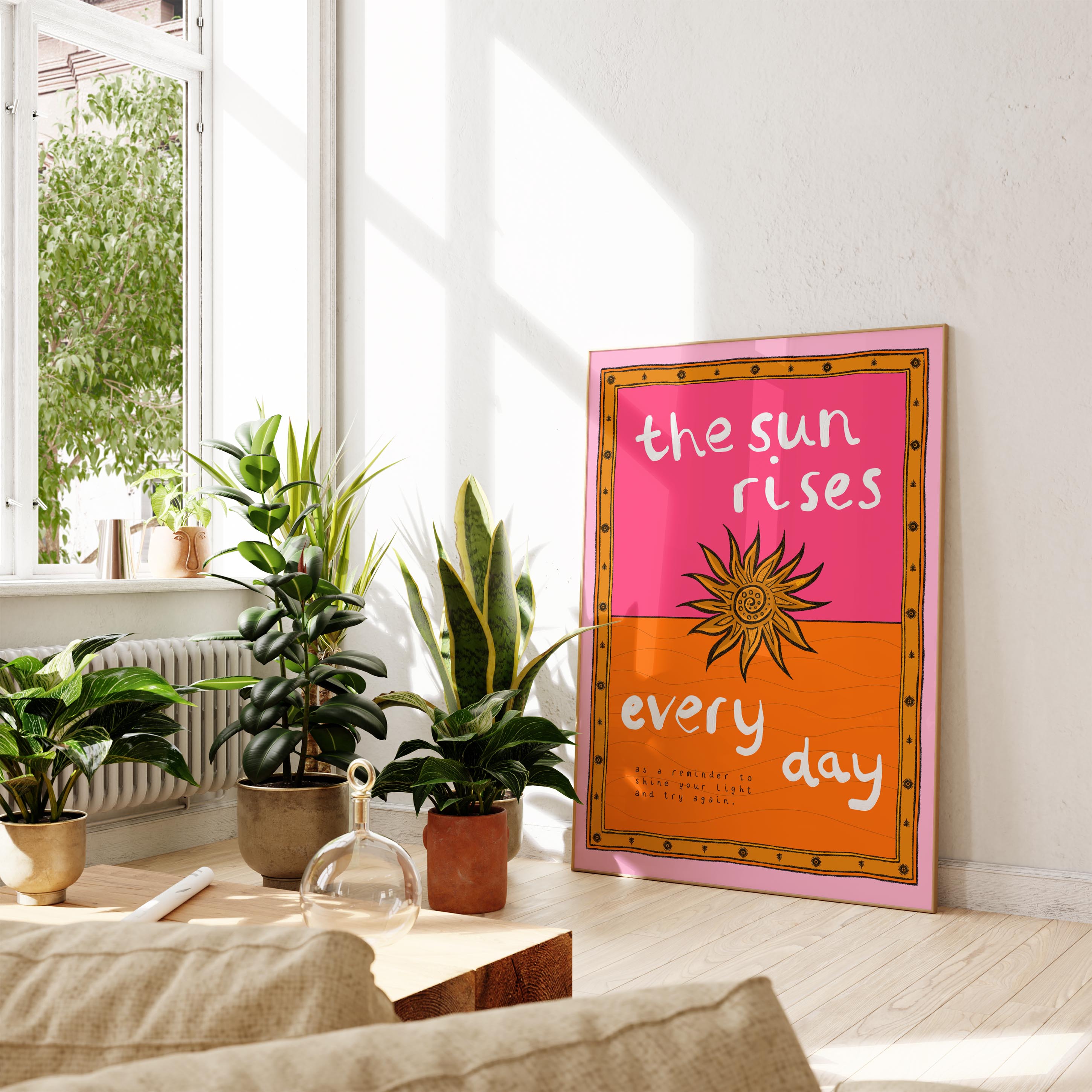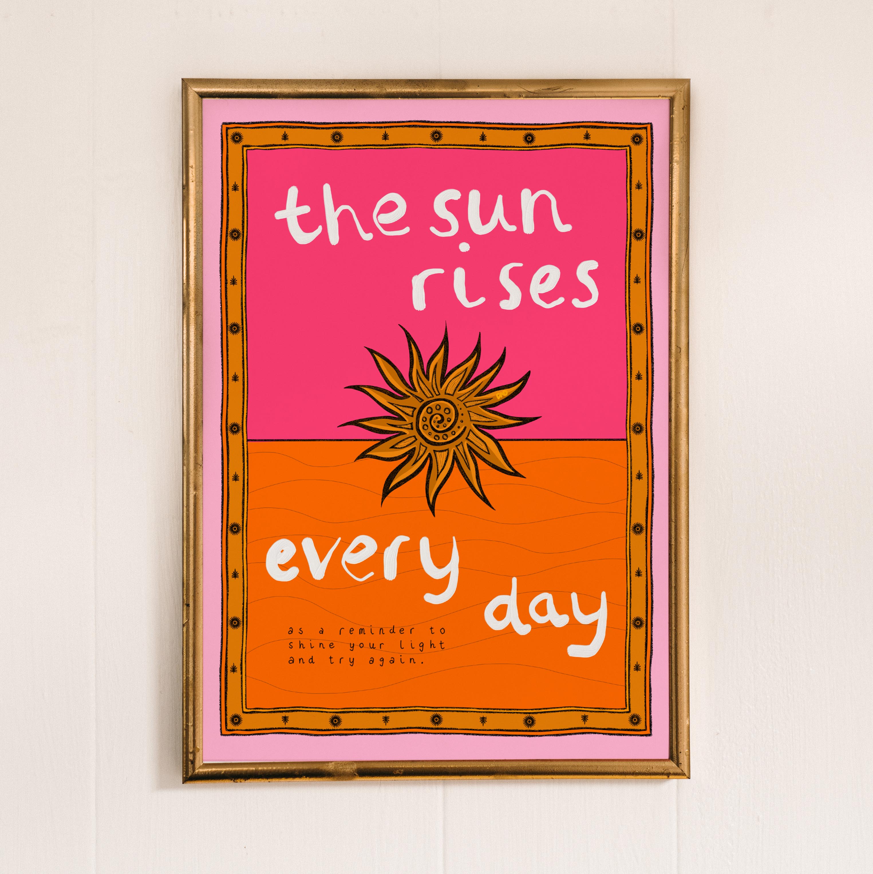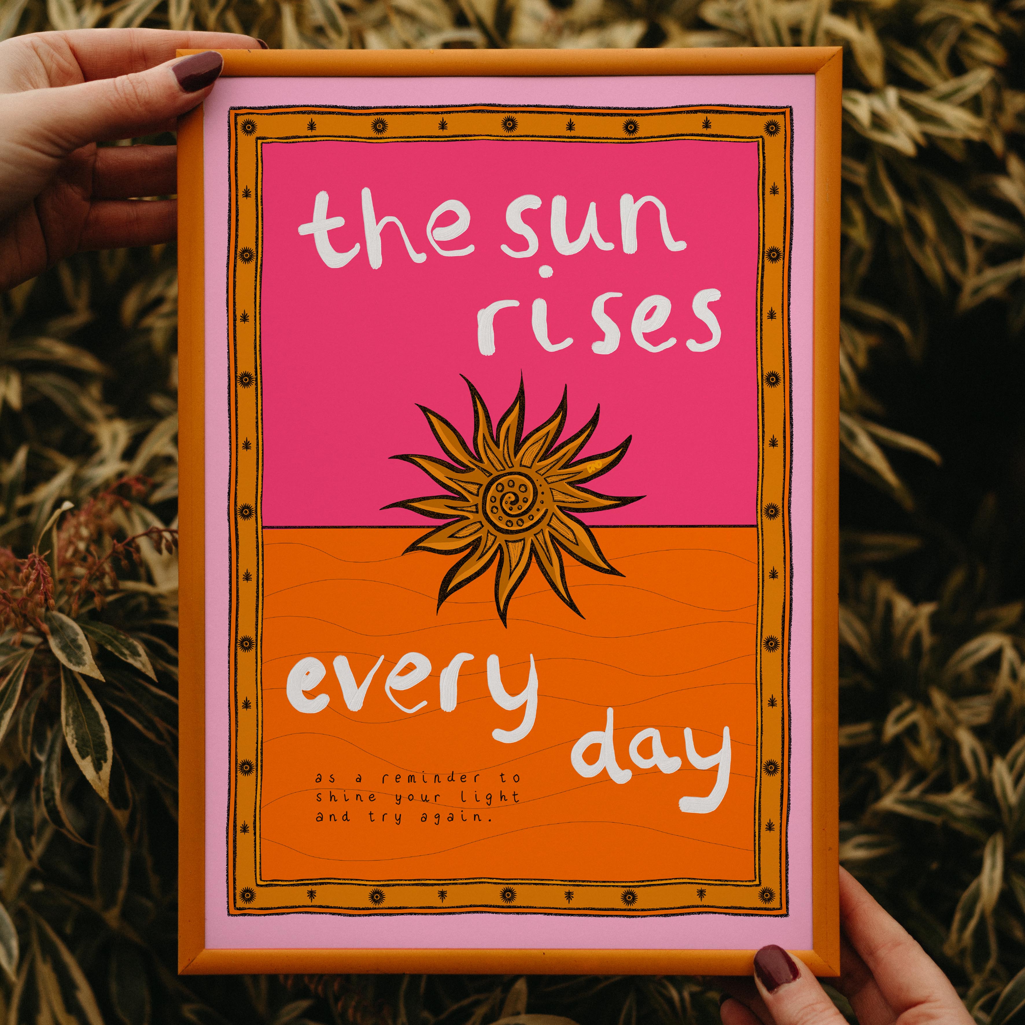 A vibrant lifestyle art print of a stylised sunset with the quote 'the sun rises every day as a reminder to shine your light and try again' painted around. Illustrated in pink and orange with a hand-drawn border.