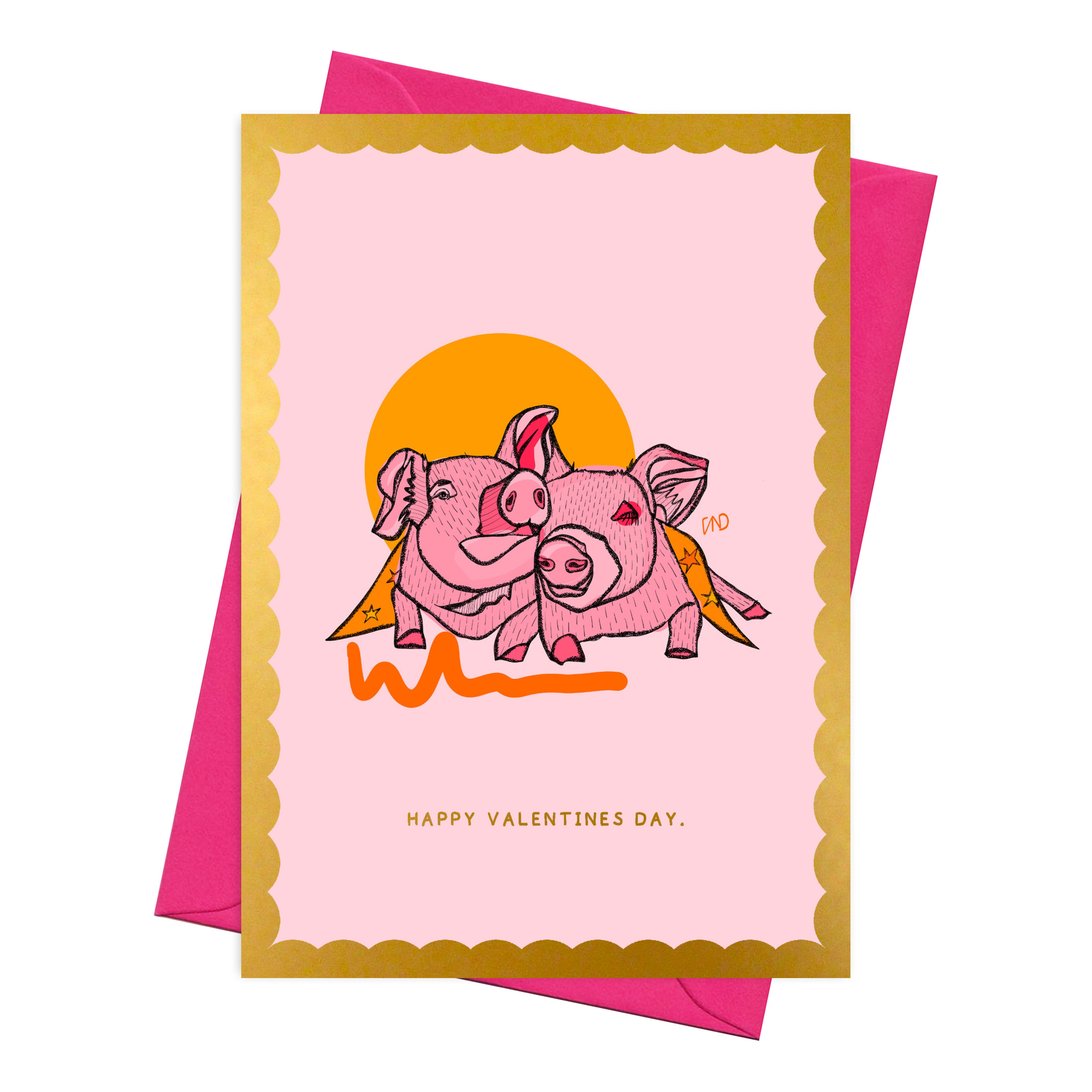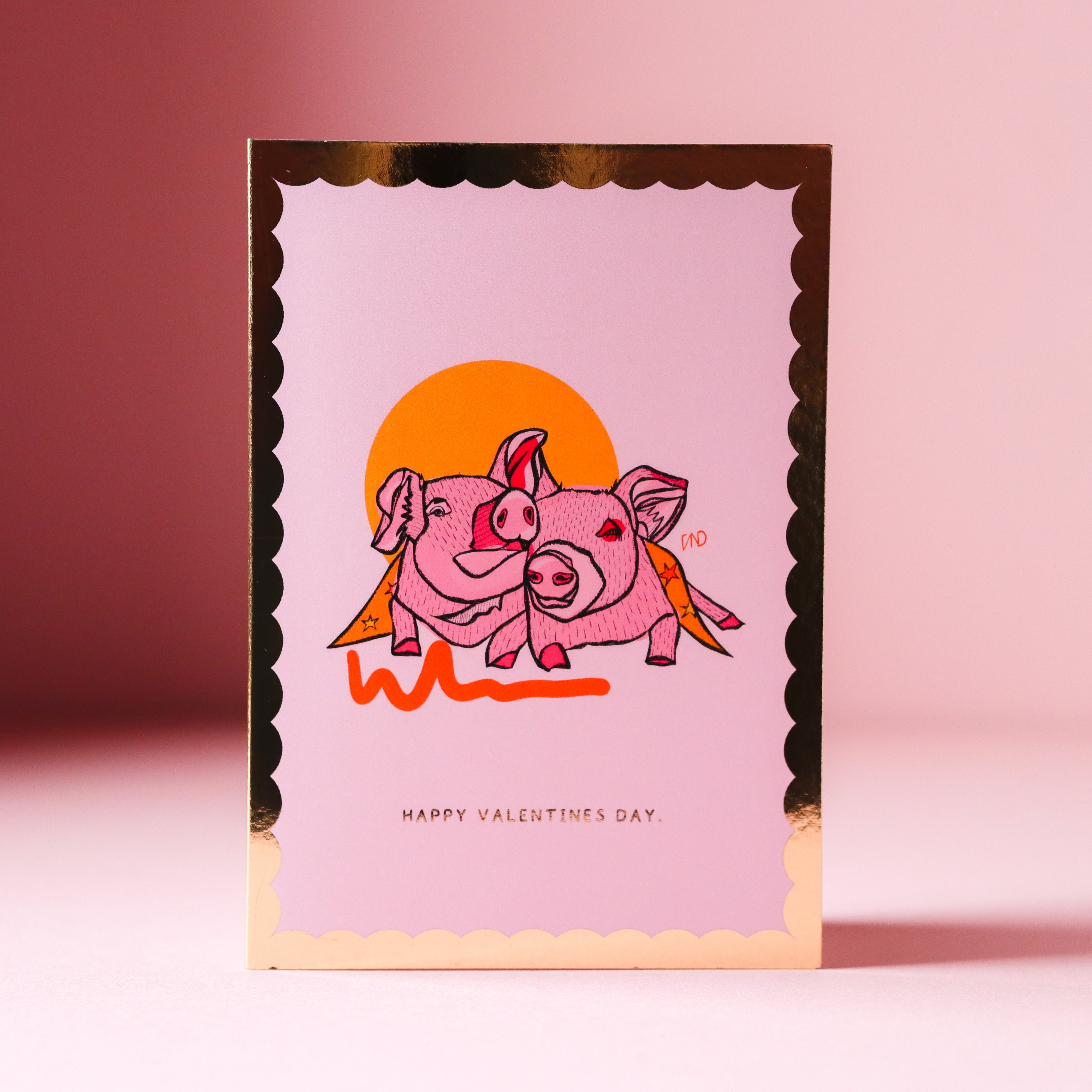 This colourful greeting card features my original artwork of a pair of piggys. Illustrated in pink and orange with a gold foil scalloped border and text.
