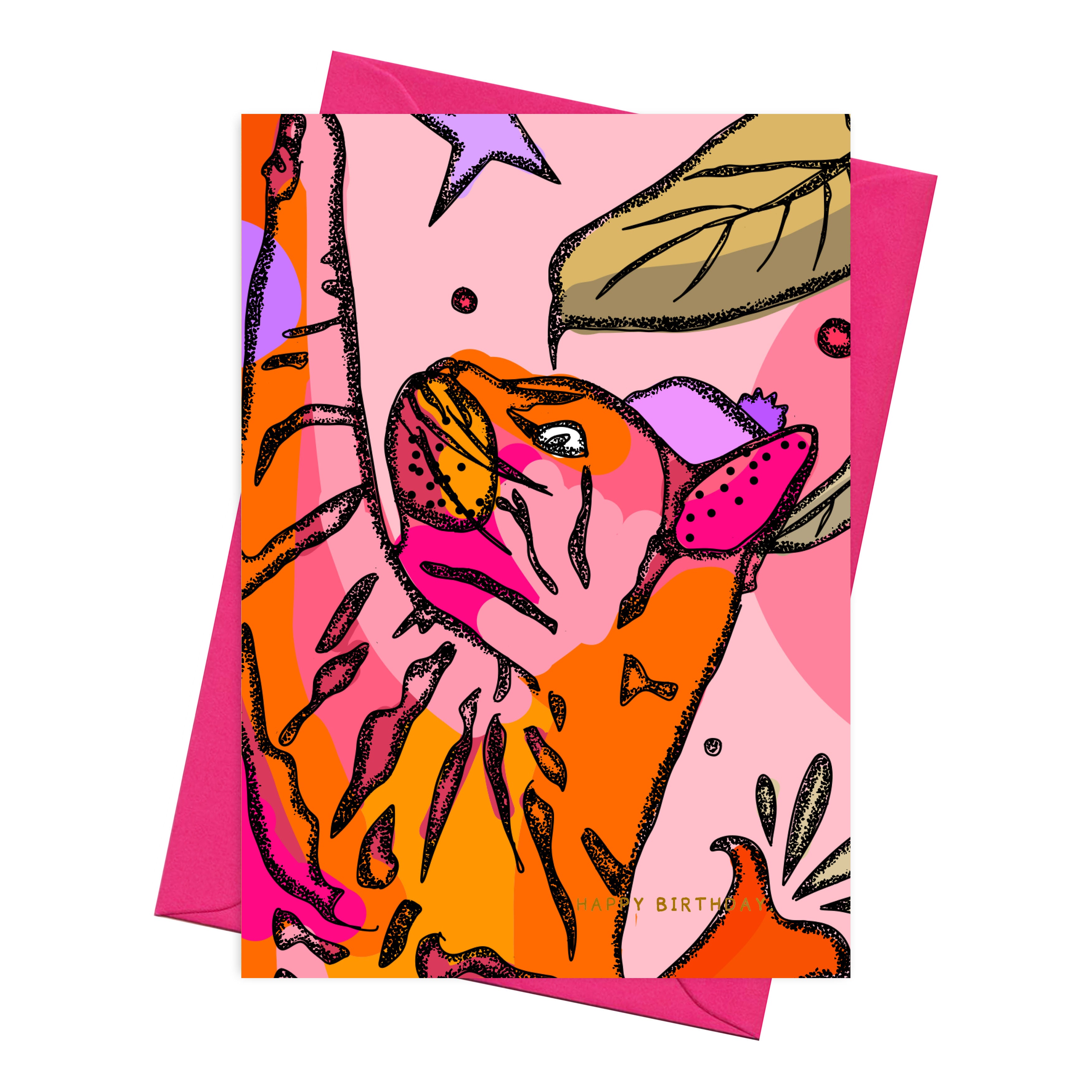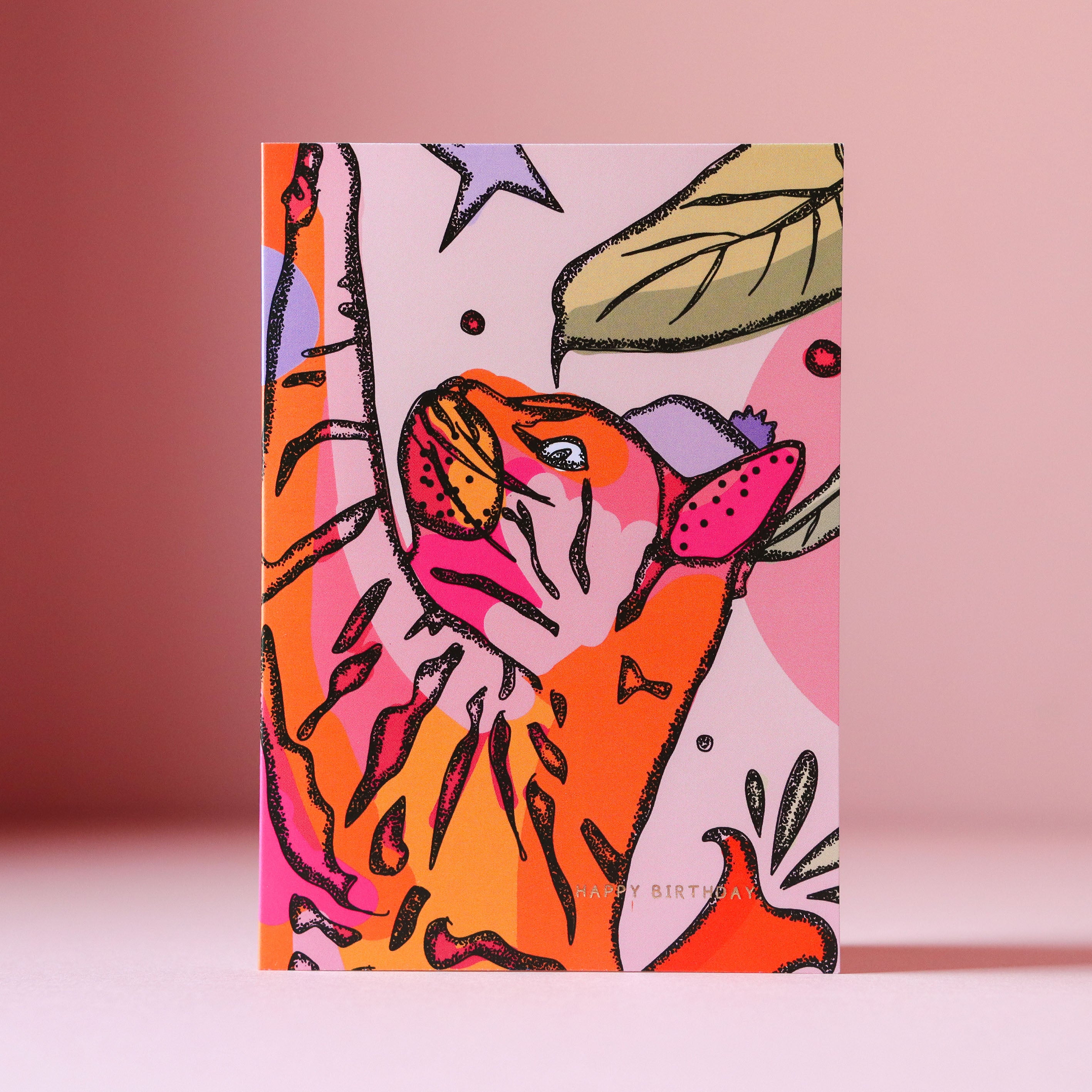 This colourful greeting card features my original artwork of a cat. Illustrated in pink, orange, green, and purple with gold foil text 'Happy Birthday.' in the bottom right corner.