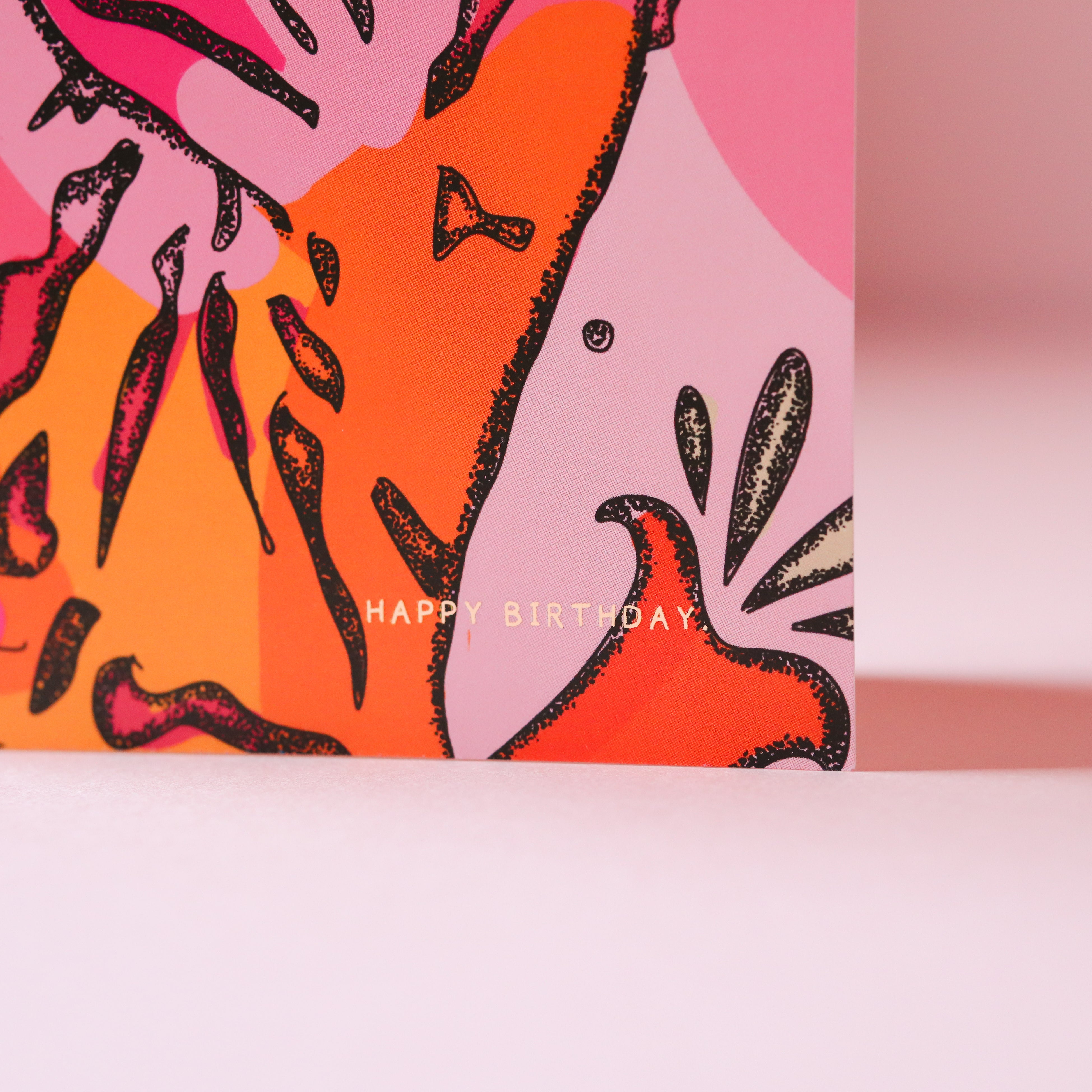 The card folds to A6 printed onto high-quality 300gsm FSC-approved mixed board with a silk finish. Packed in biodegradable cello with a fuschia pink envelope. Blank inside.