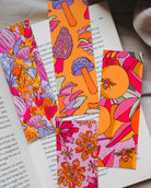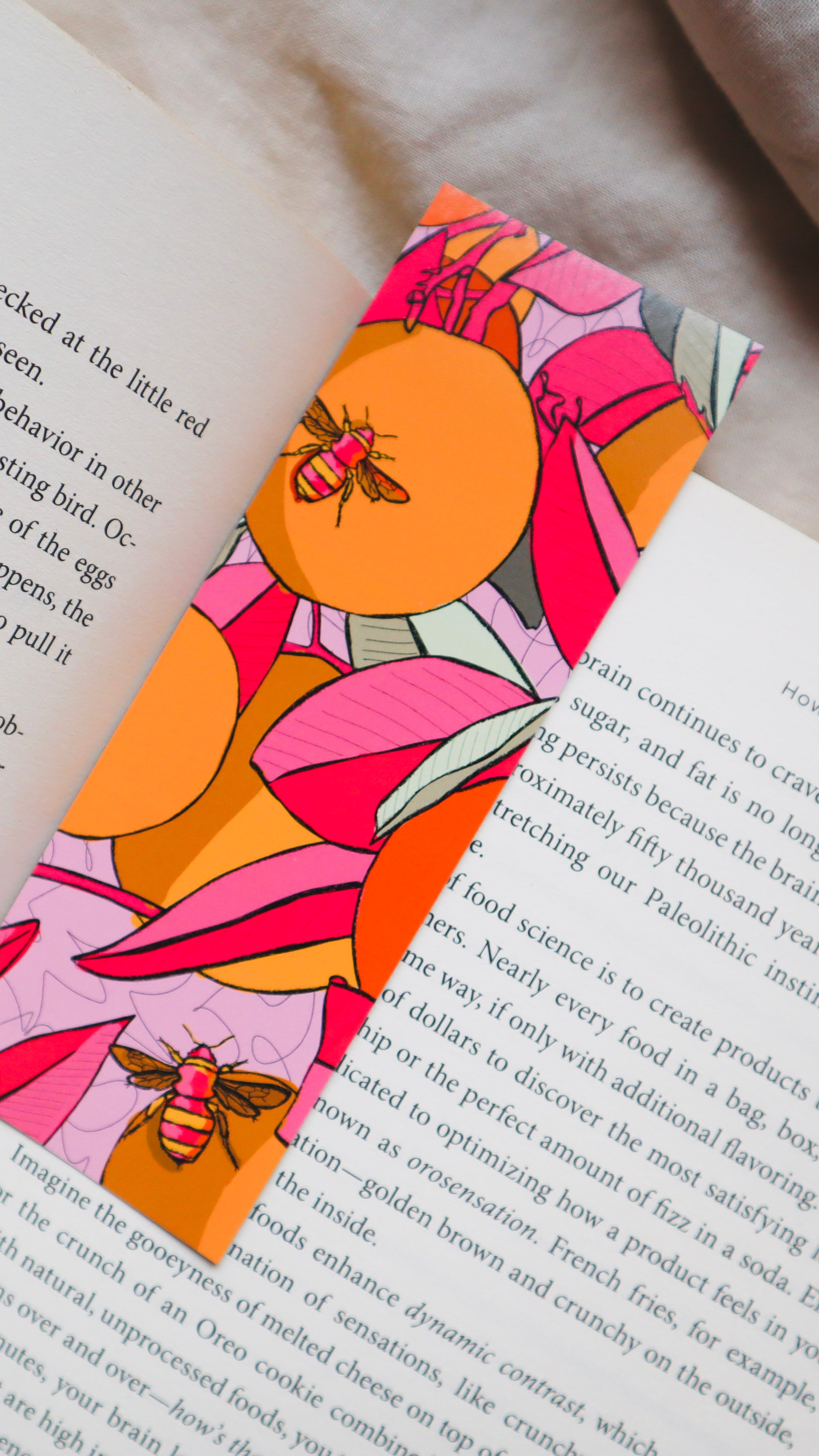 Oranges and Bees bookmark illustrated in bright pink, orange, green, and yellow.