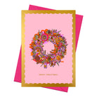 This colourful greeting card features my original artwork of a bauble wreath. Illustrated in pink and green, purple, and yellow with a gold foil scalloped border and text.