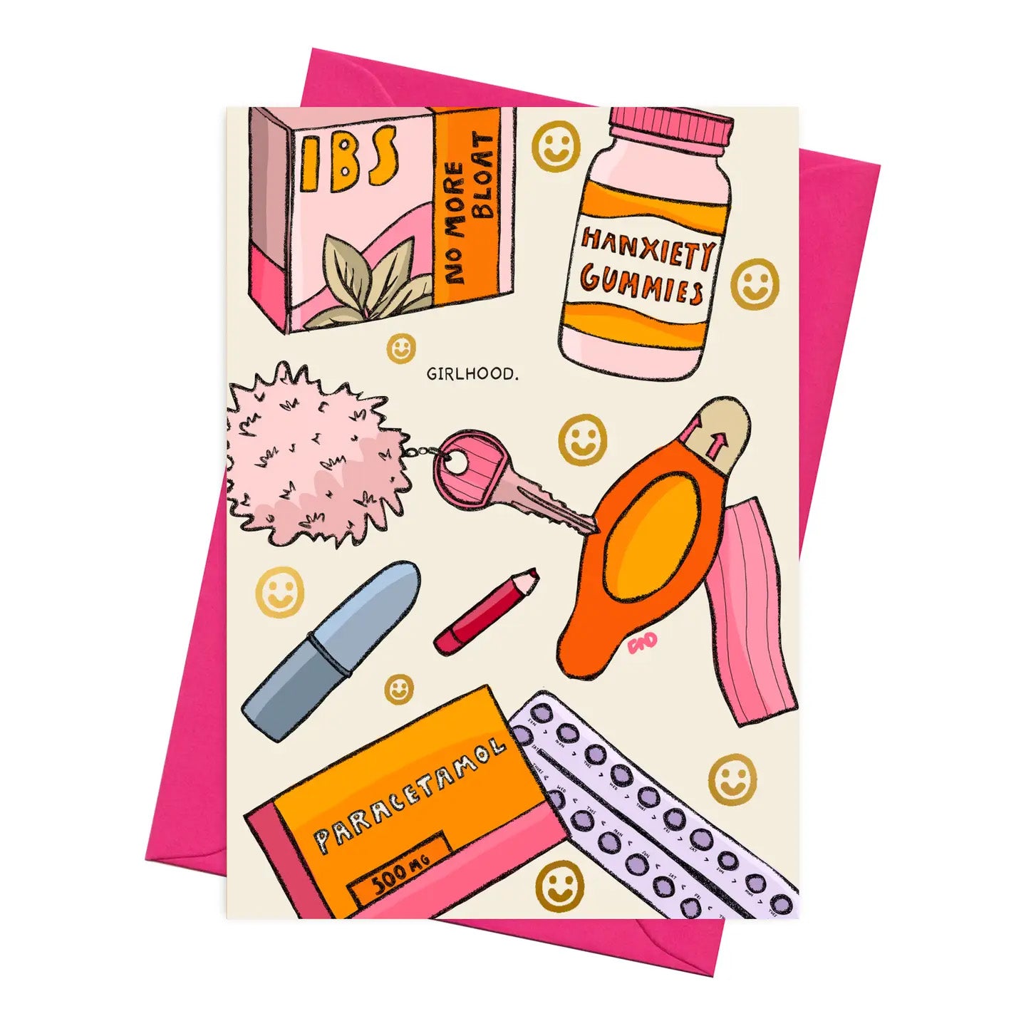 This colourful greeting card features my original artwork of Girlhood, a realistic 'what's in my bag' including anti-bloat medicine, a blunt lip liner, and hanxiety gummies. Illustrated in pink with gold foil smiley faces to add a little luxury.