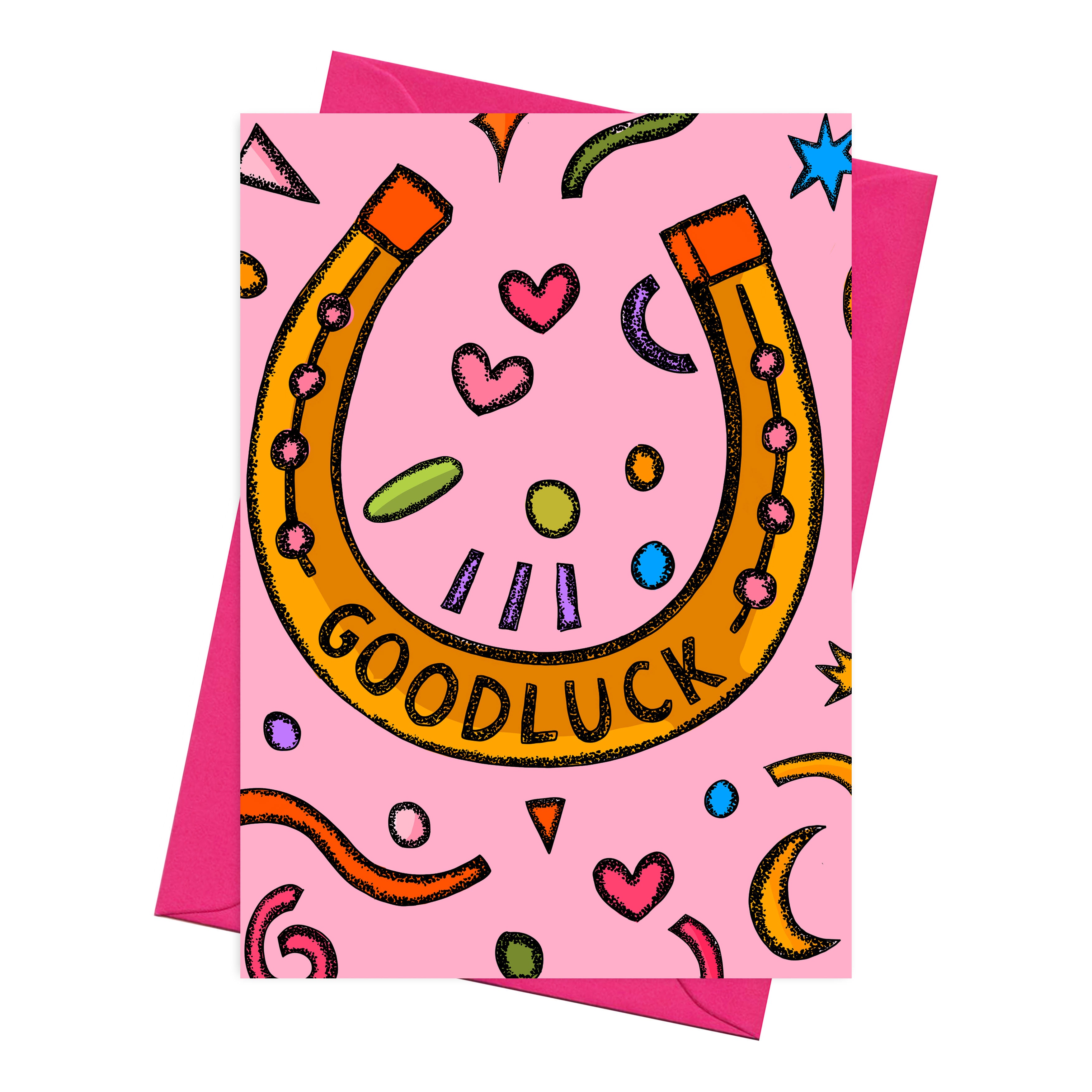 This colourful greeting card features my original artwork of a horseshoe for good luck. Illustrated in pink, yellow, green, and blue.