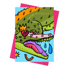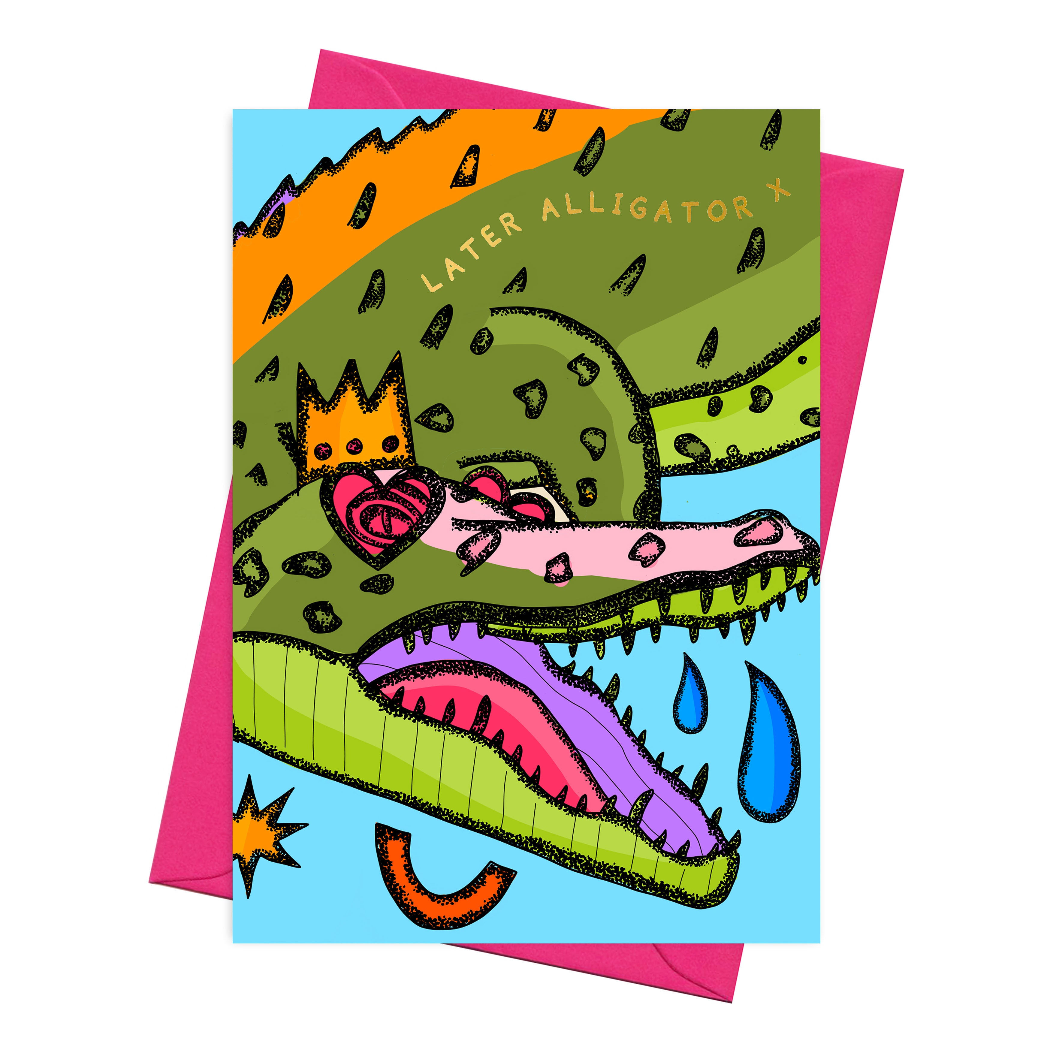 This colourful greeting card features my original artwork of an alligator. Illustrated in green, blue, pink, and yellow with gold foil text.