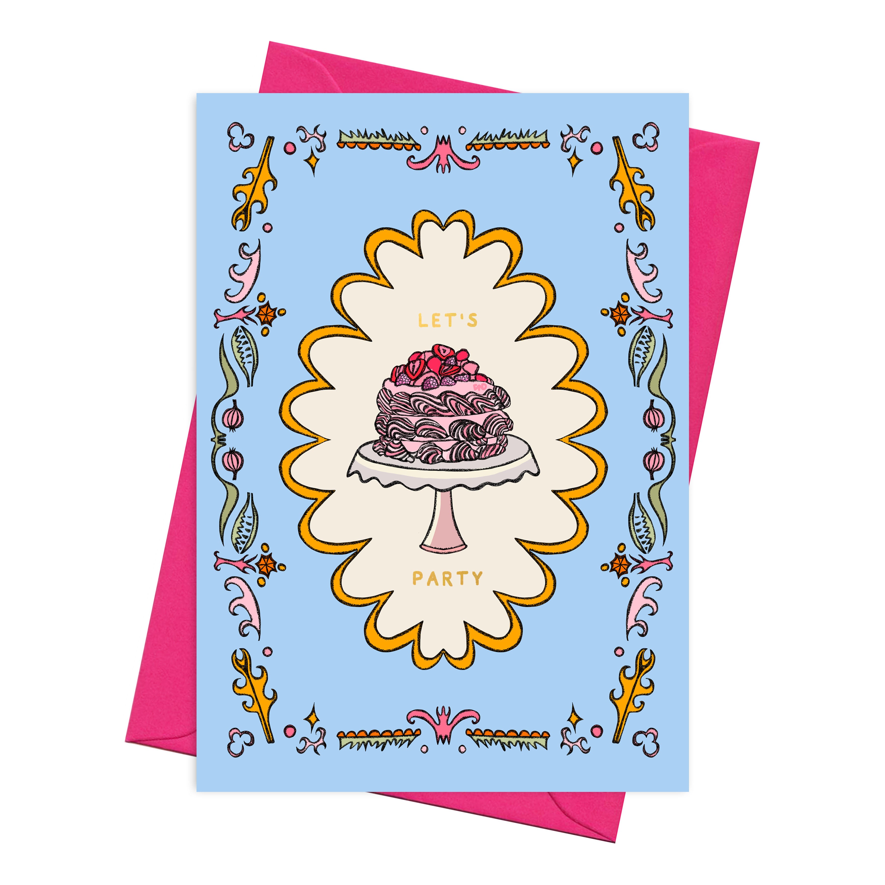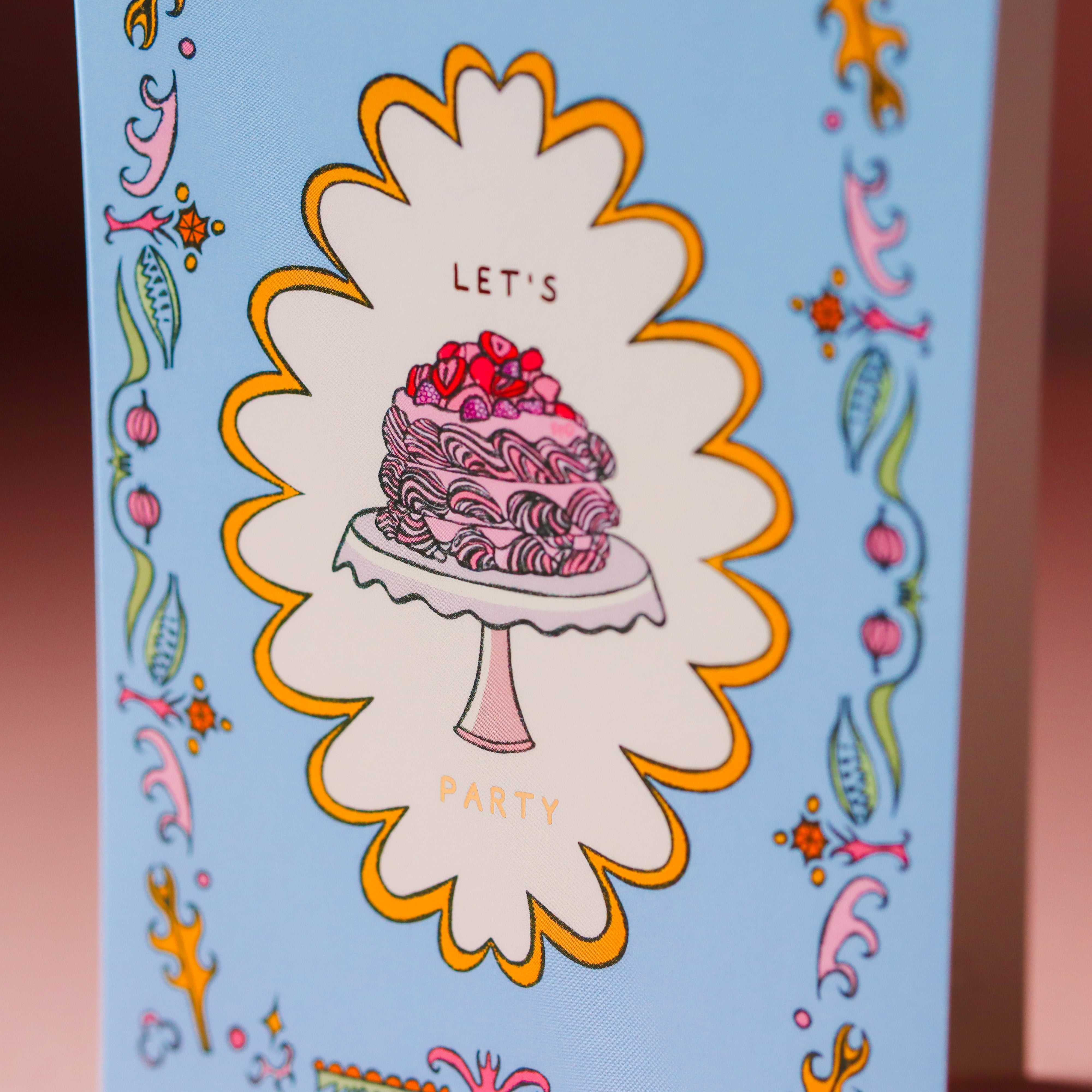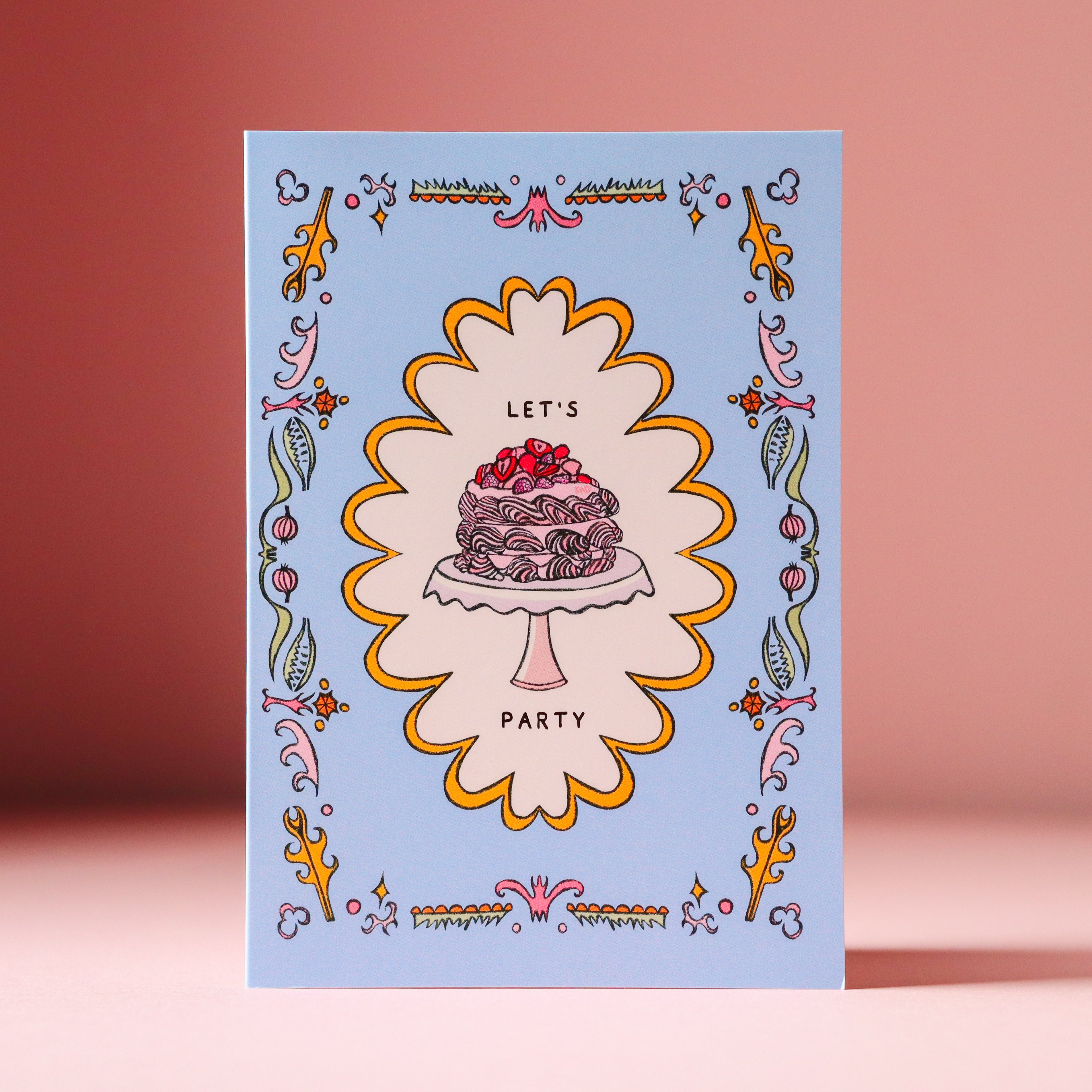 This stylish baby blue card features an illustration of a fruit pavlova with the text 'Let's party'.