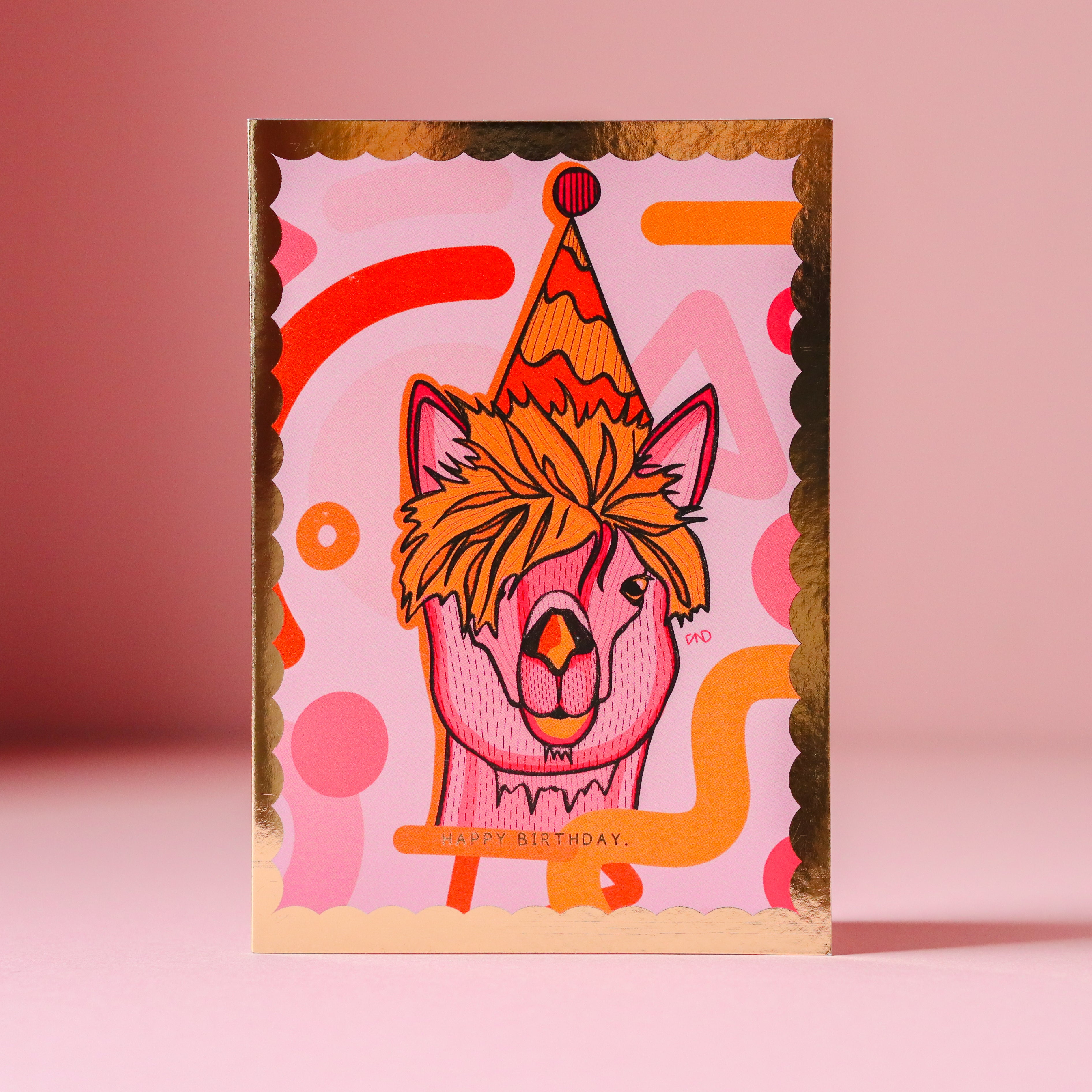 This colourful birthday card features my original artwork of a party alpaca. Illustrated in pink, yellow, and orange with a gold foil scalloped border and text.
