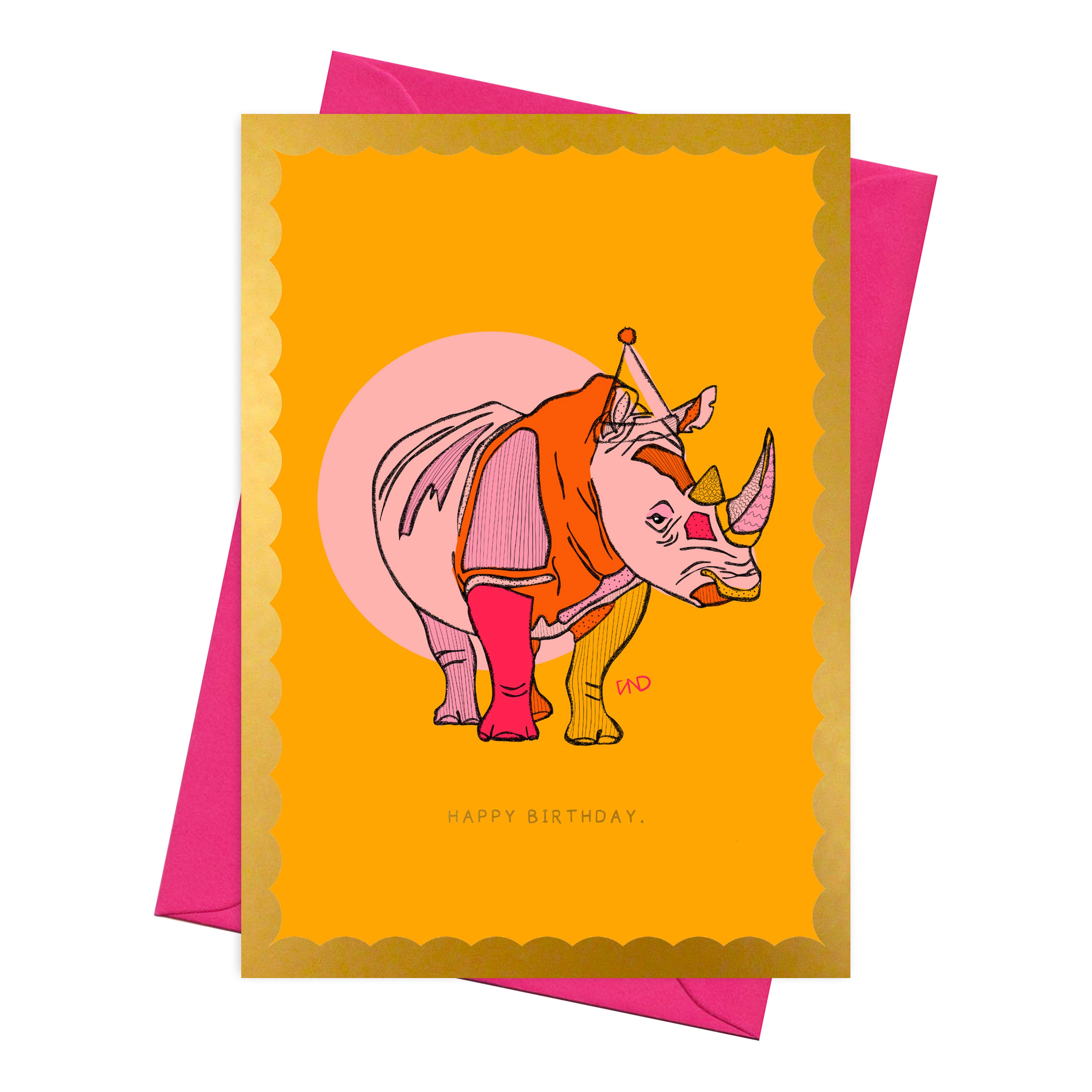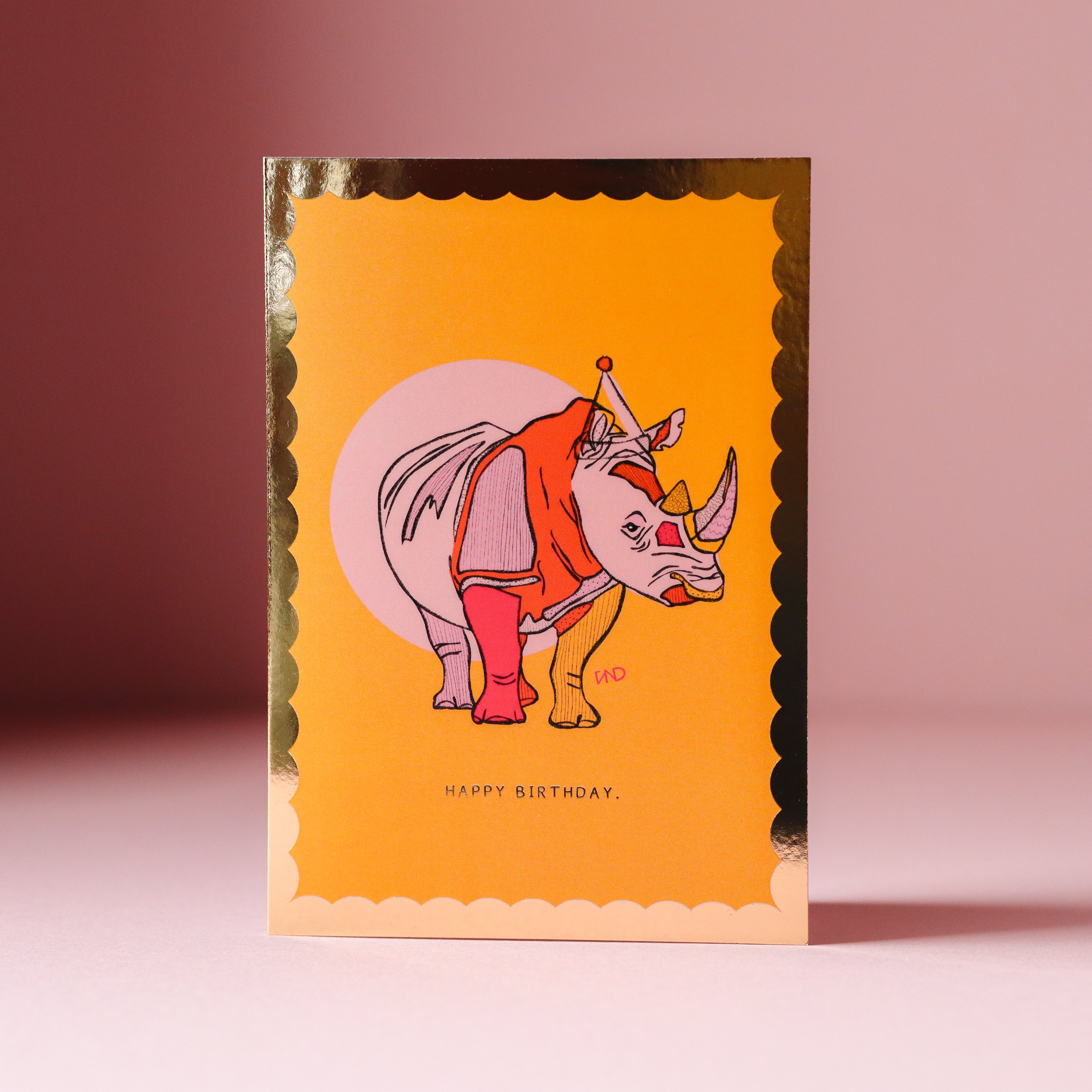 This colourful birthday card features my original artwork of a party rhino. Illustrated in pink, yellow, and orange with a gold foil scalloped border and text.