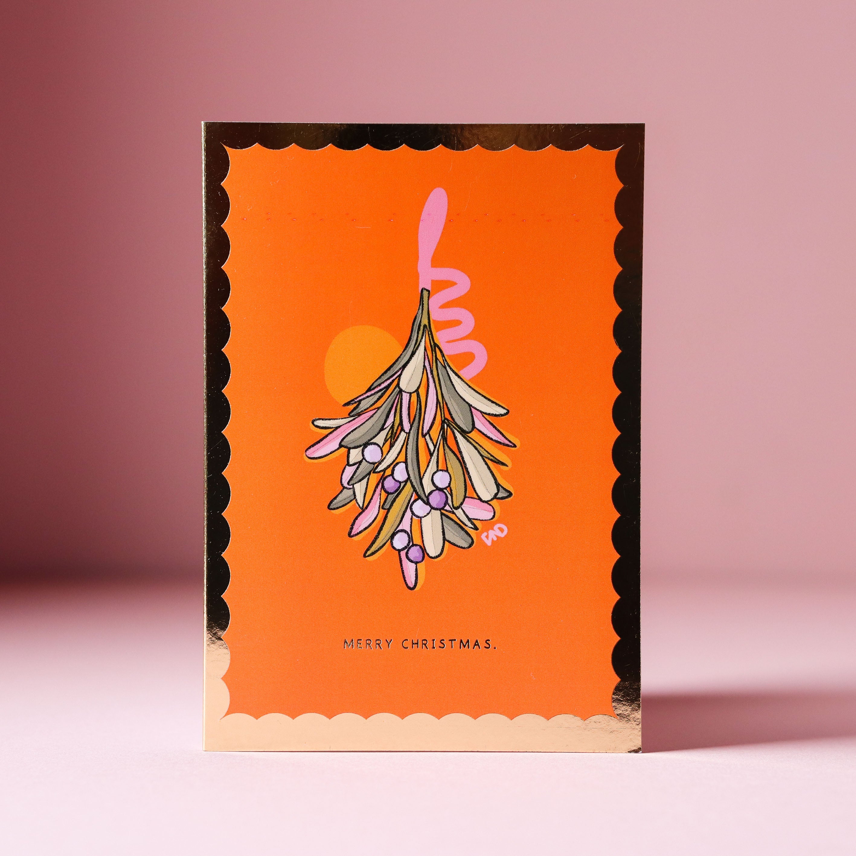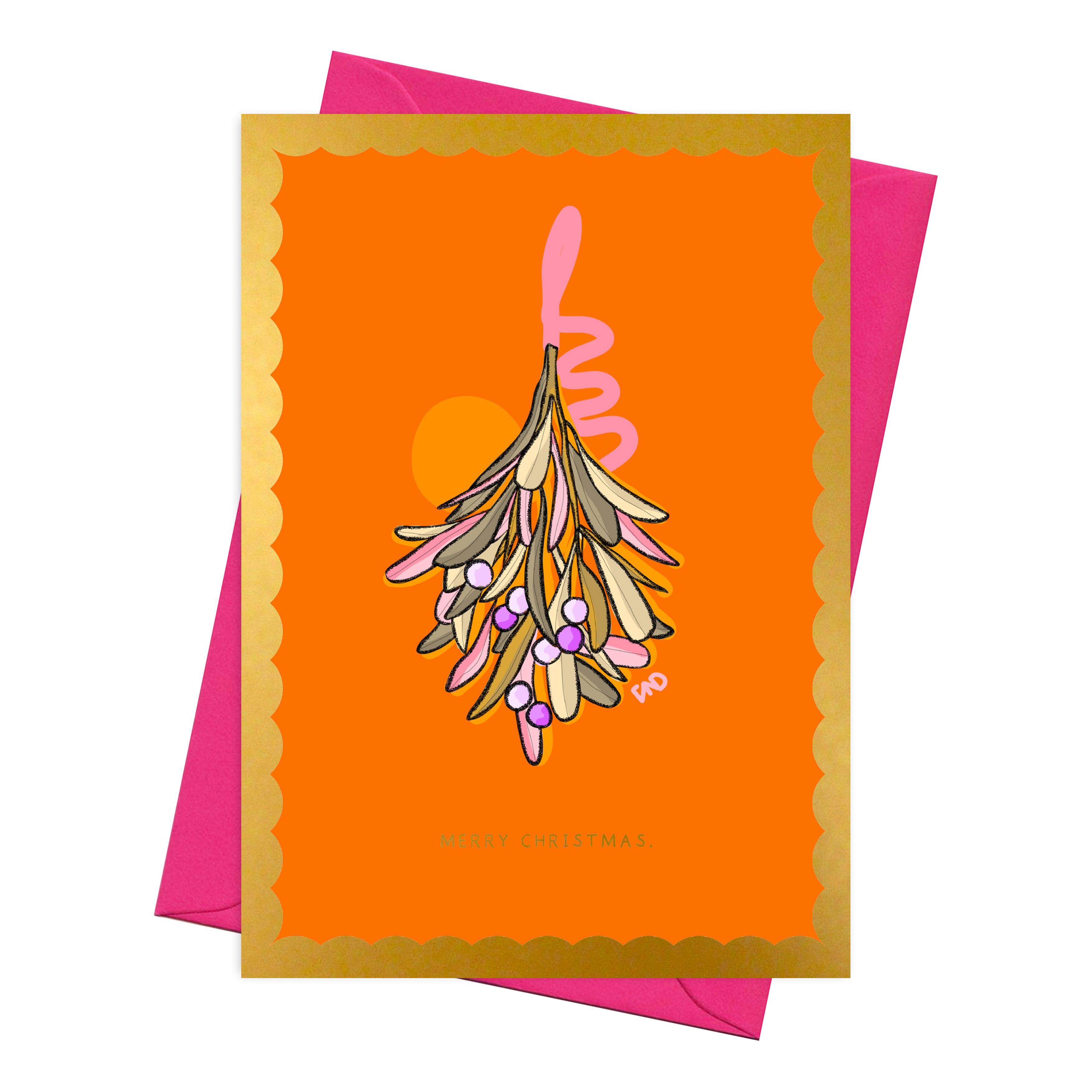 This colourful greeting card features my original artwork of mistletoe. Illustrated in orange and green with a gold foil scalloped border and text.