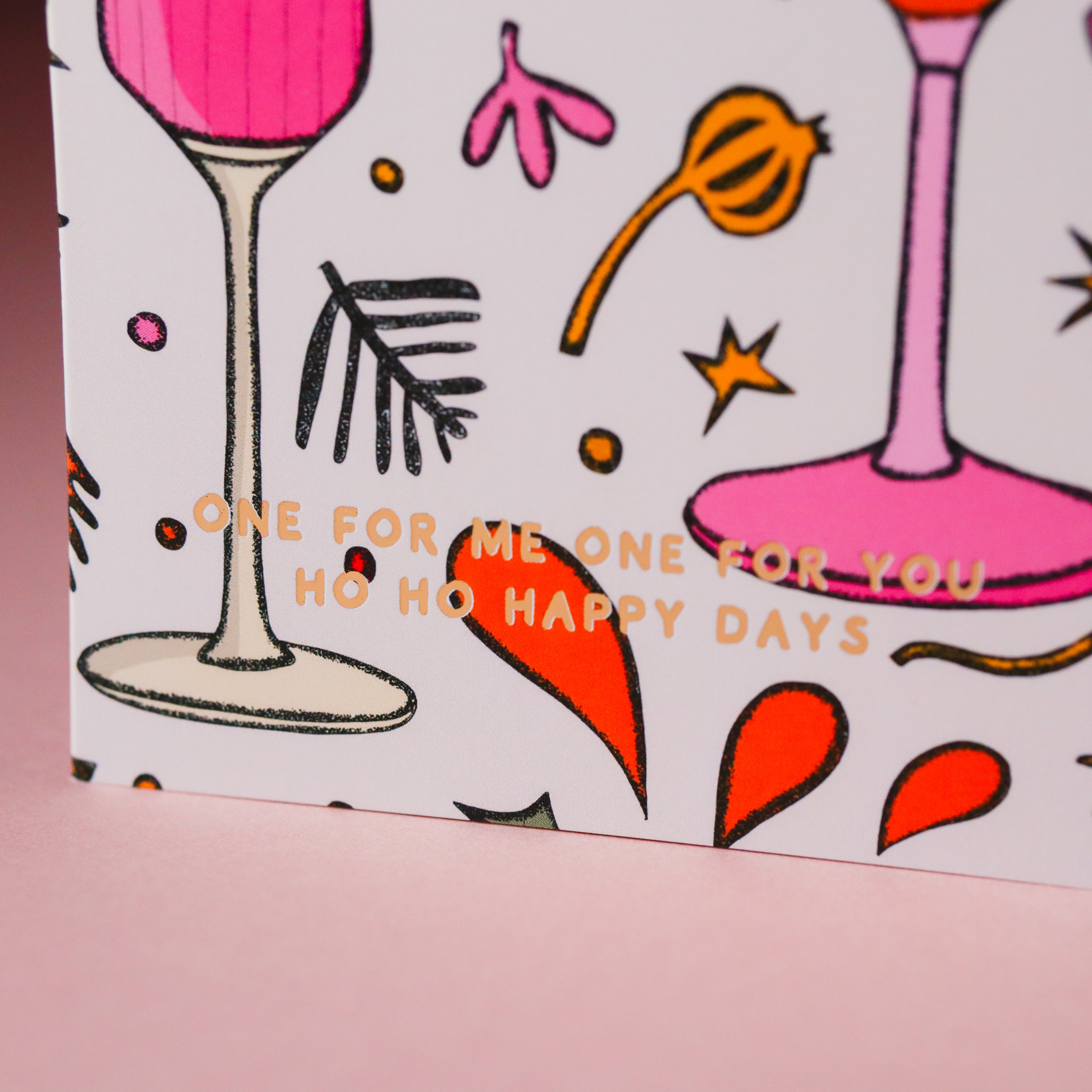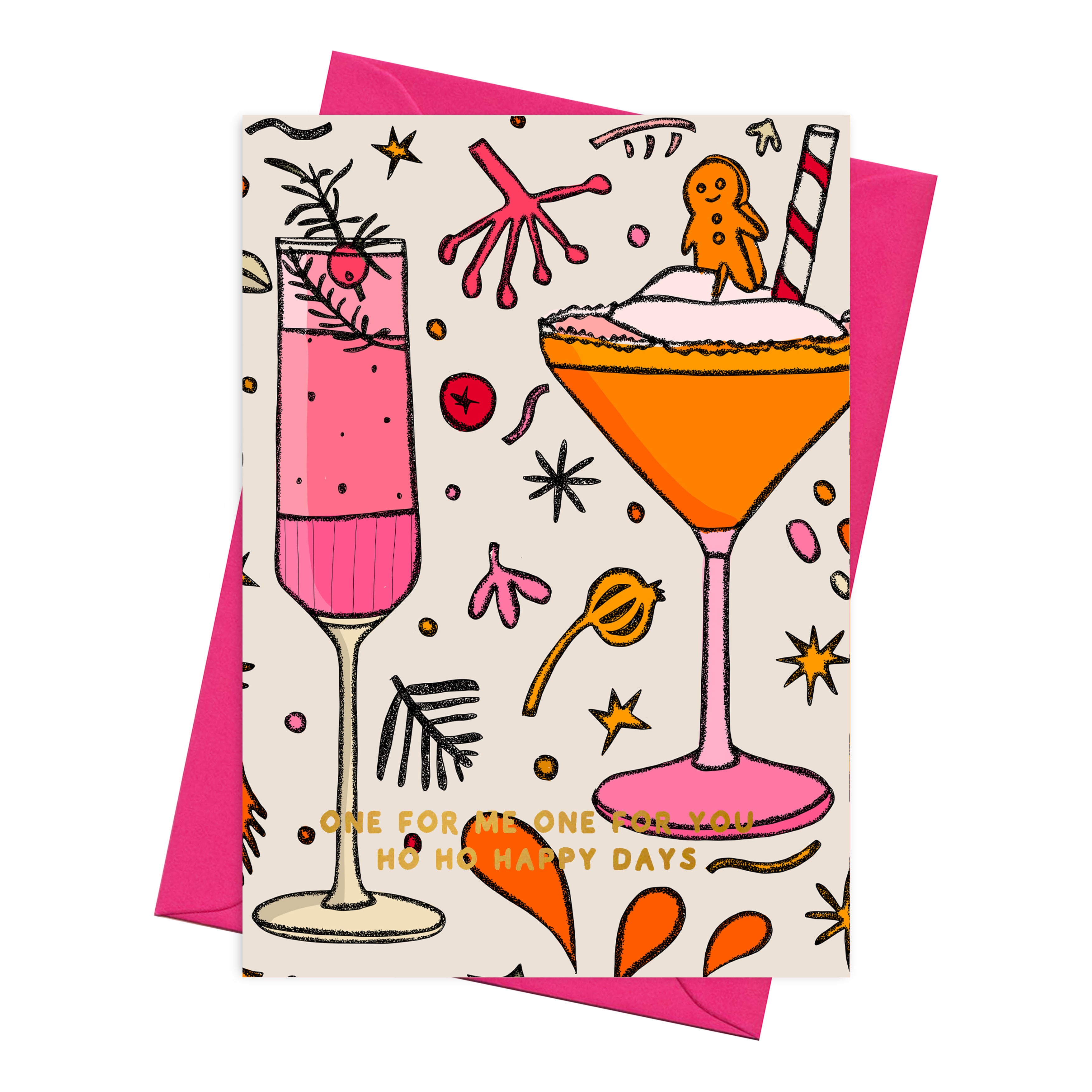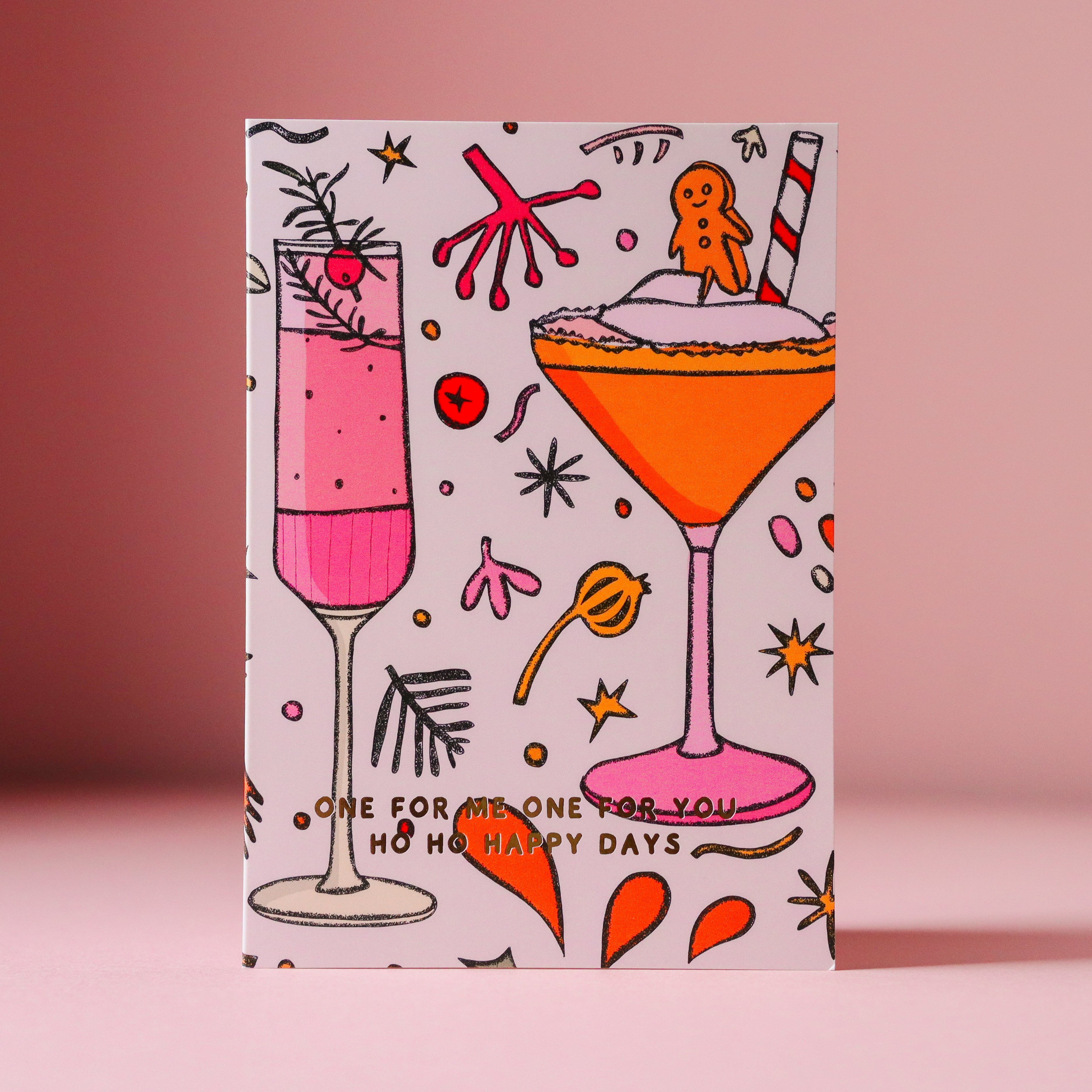 This stylish Christmas card features my original artwork of a candy cane cocktail with the text "One for me, one for you. Ho ho happy days' written in gold foil. Illustrated in beige, pink, green, and orange with gold foil text.