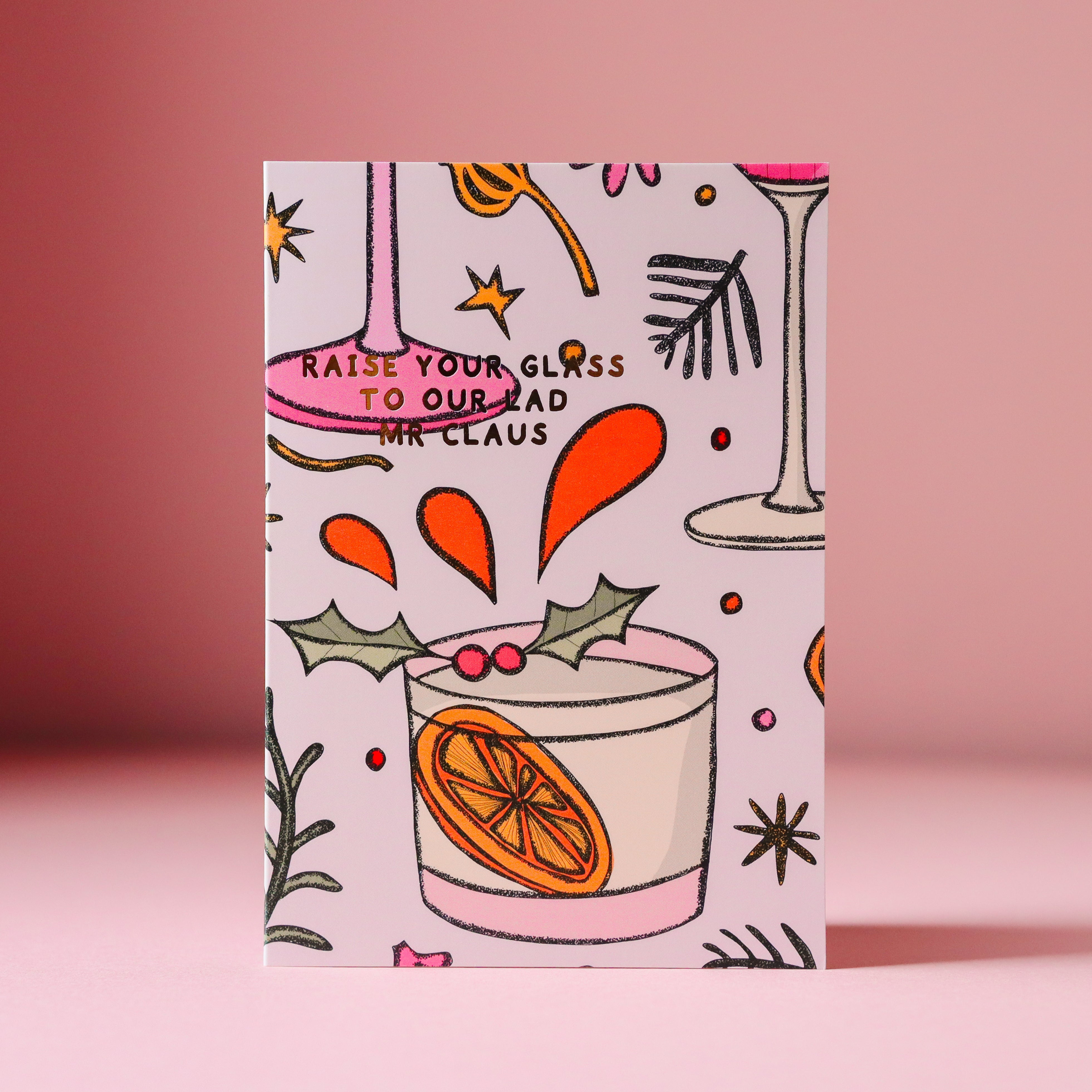 This stylish Christmas card features my original artwork of a holly whiskey cocktail with the text "Raise a glass to our lad Mr Claus' written in gold foil. Illustrated in beige, pink, green, and orange with gold foil text.