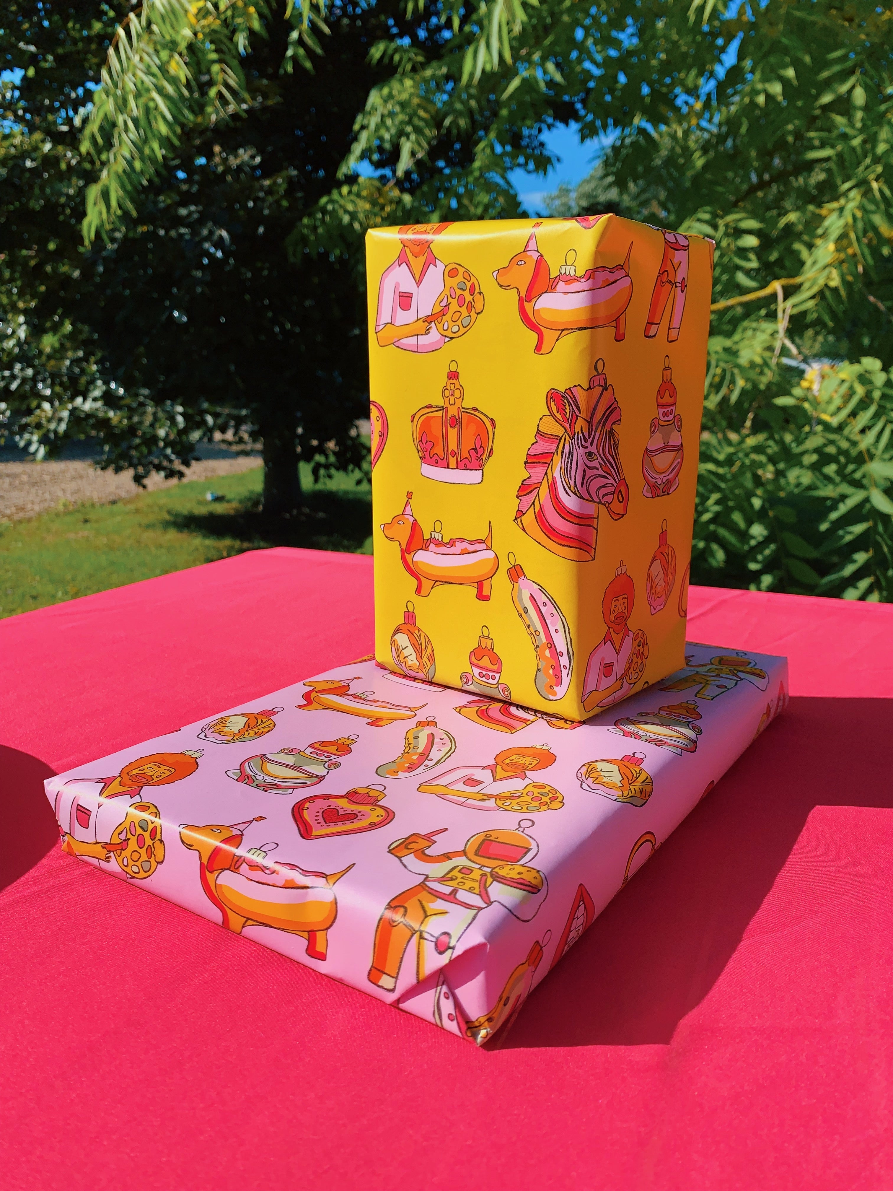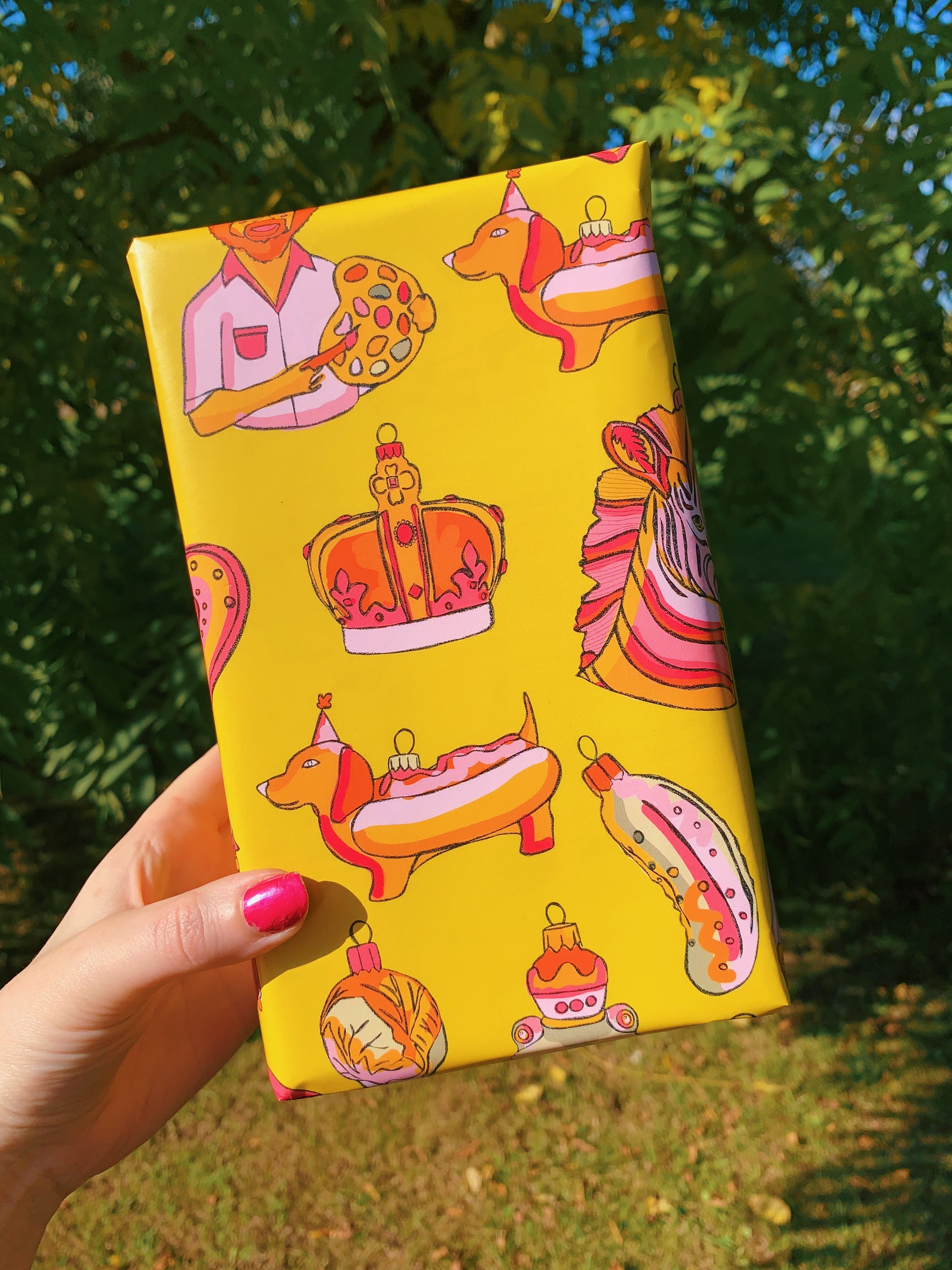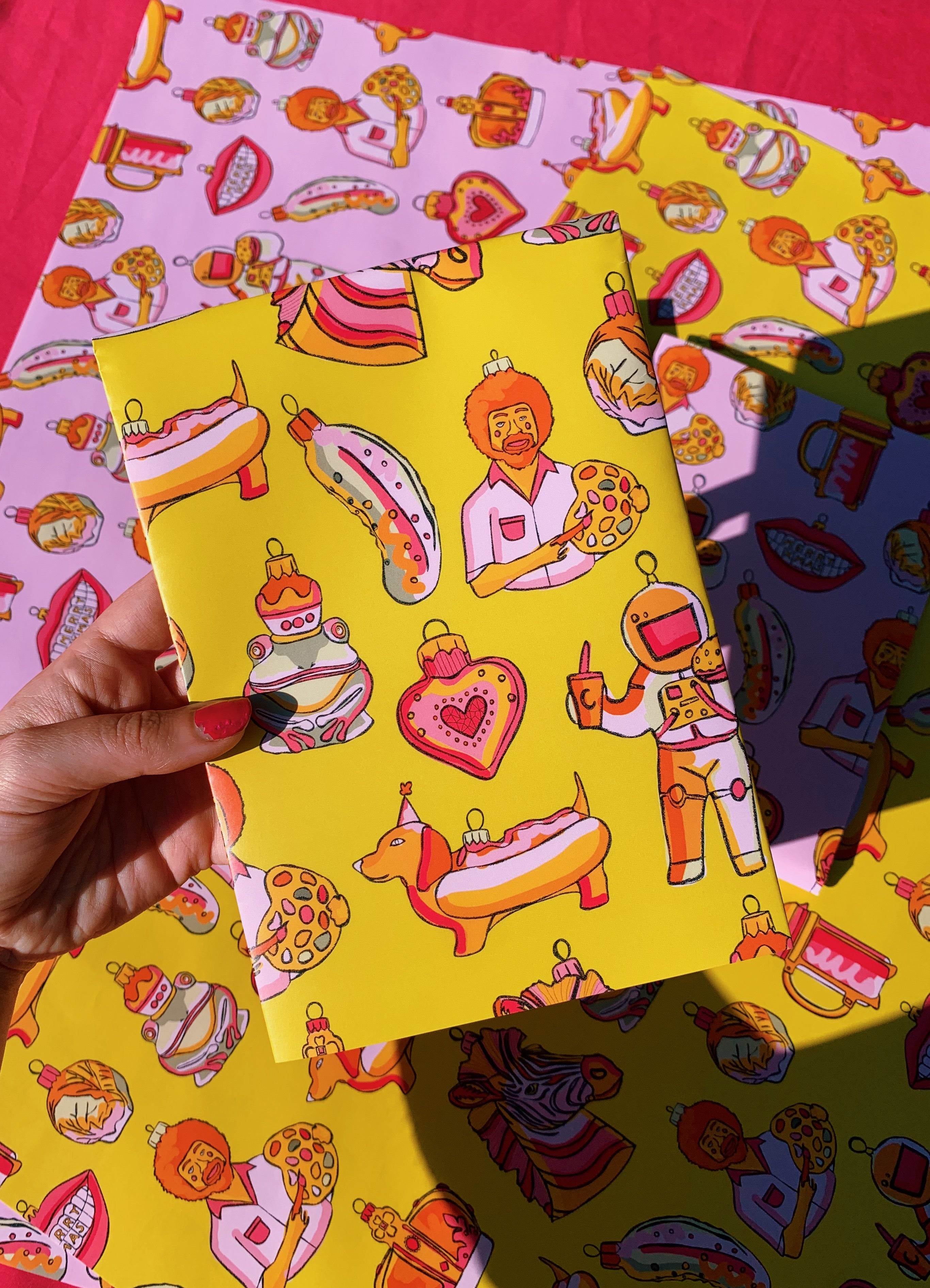 A lime green Christmas bauble wrapping paper for the coolest of gifts under the Christmas tree. The baubles include sausage dog hot dogs, Bob Ross, brussel sprouts, astronauts, pickles, crowns, zebras, frogs, lips, coffee cafetières and, hearts.