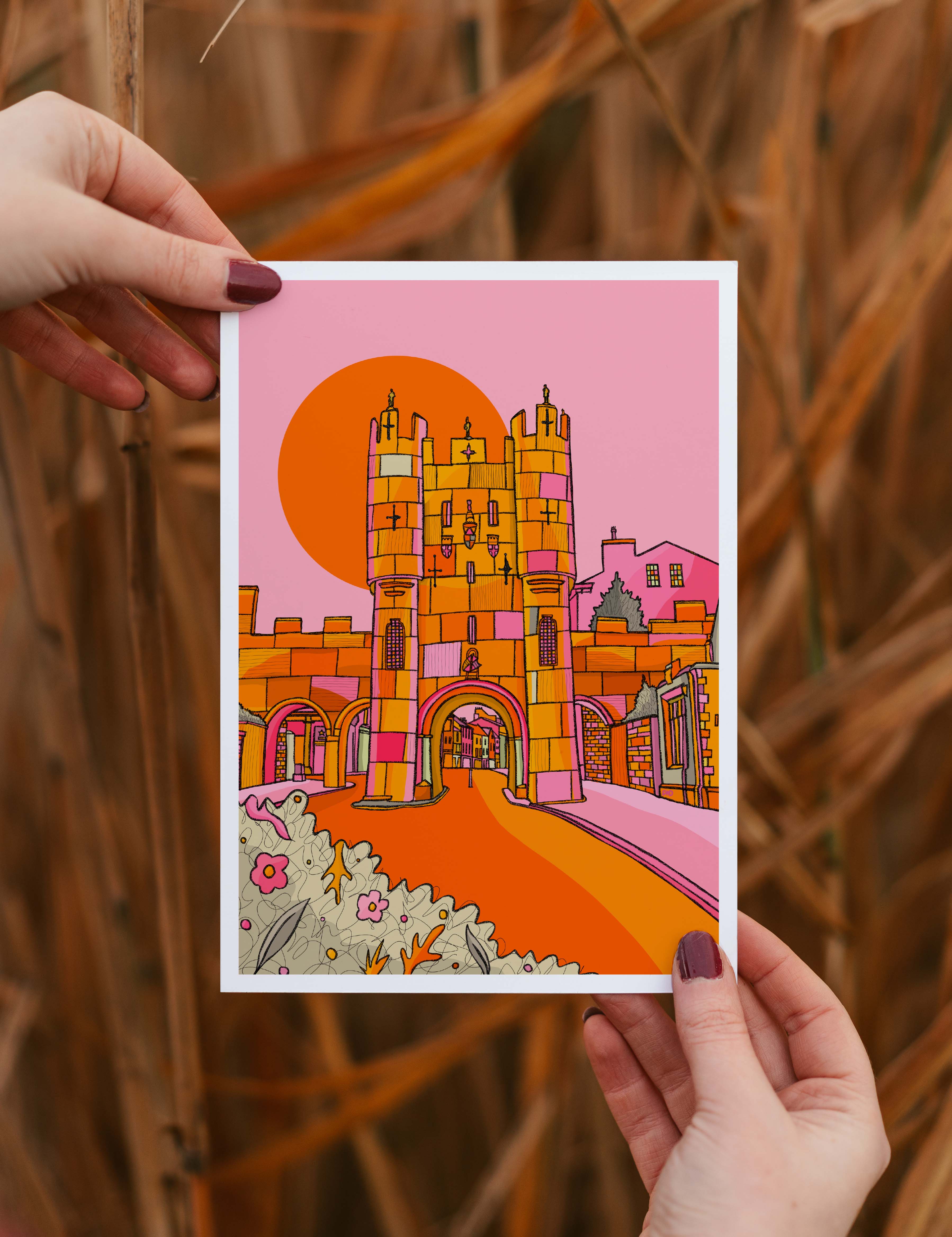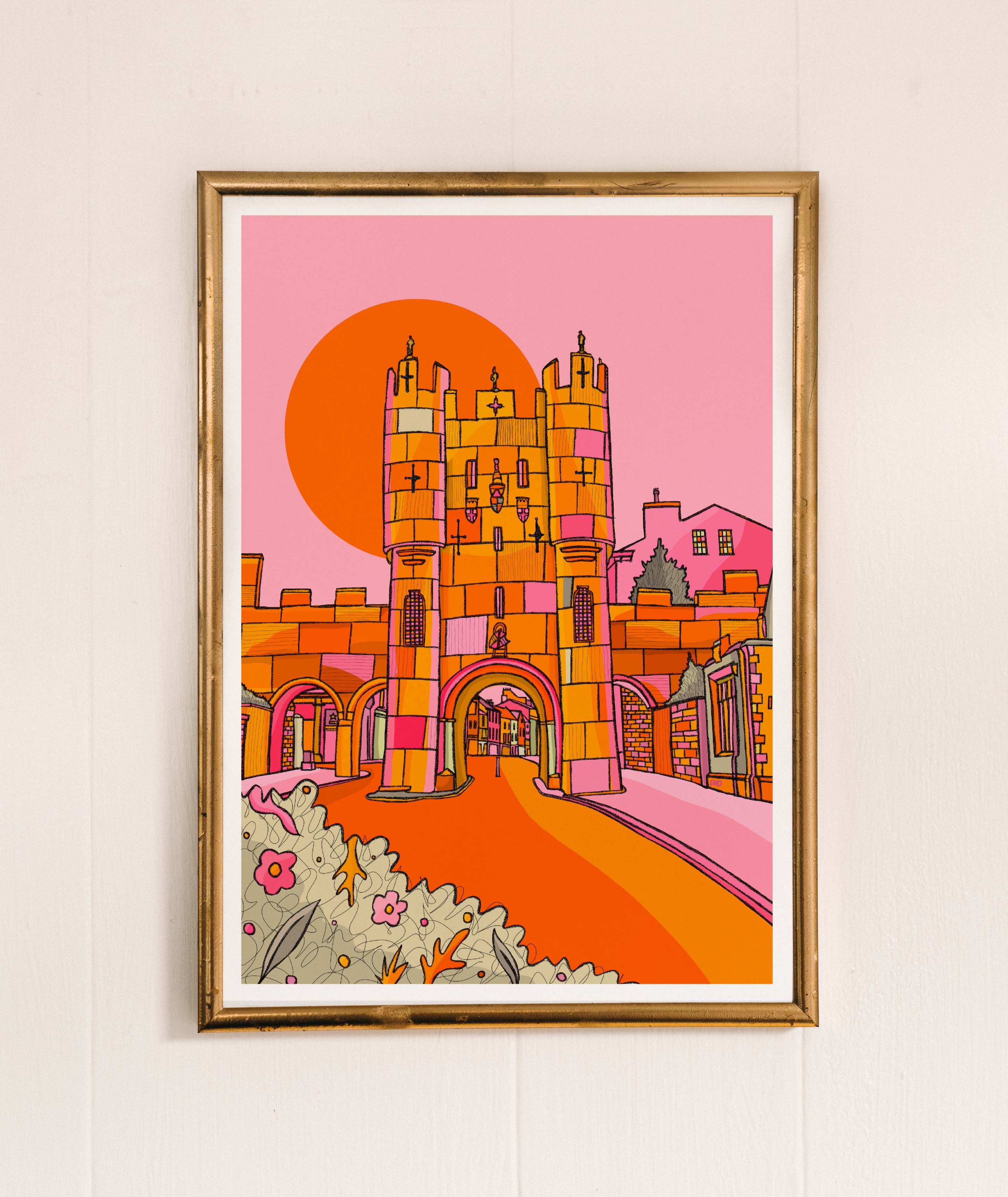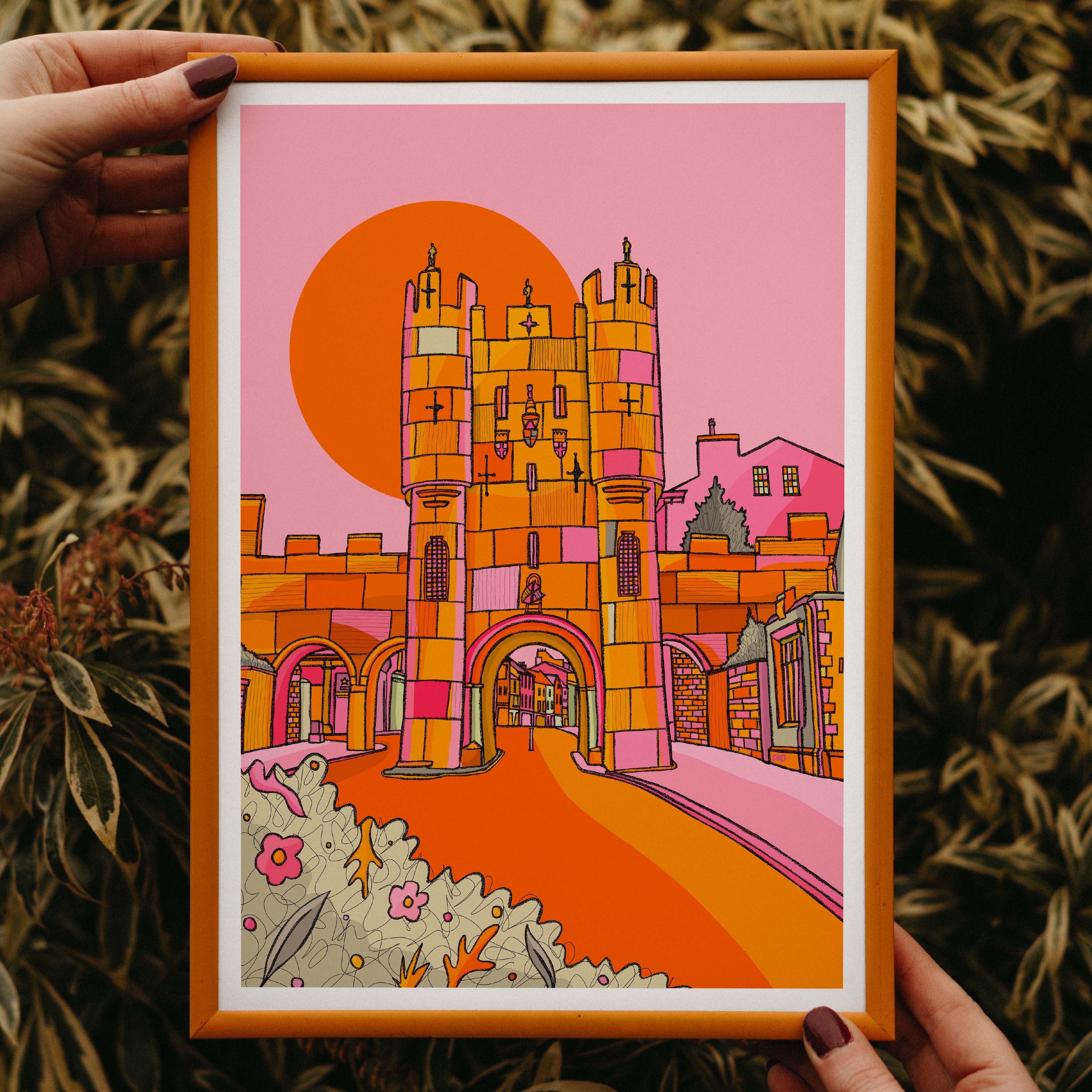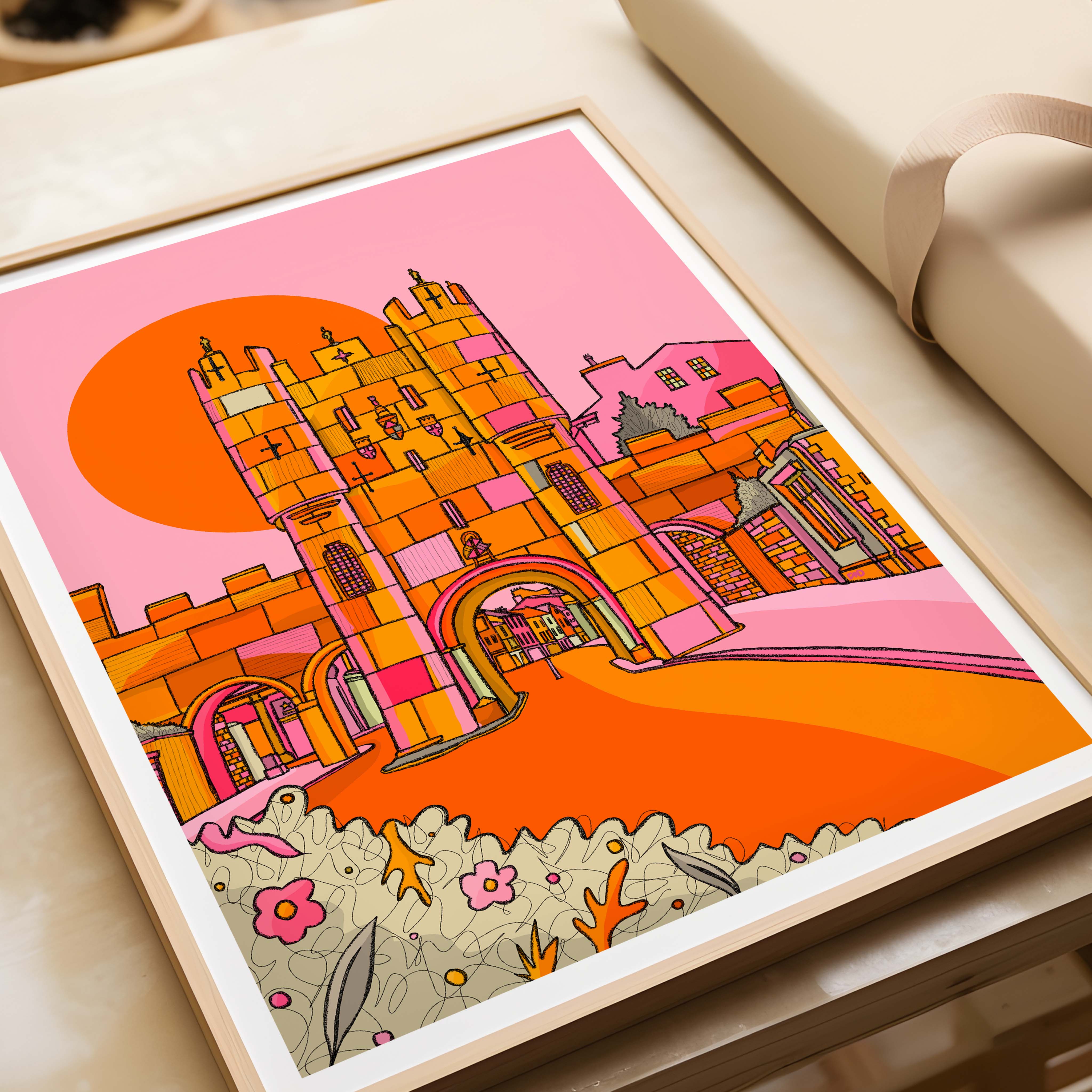 A vibrant art print of Micklegate Bar in York illustrated in bright pinks and oranges.
