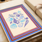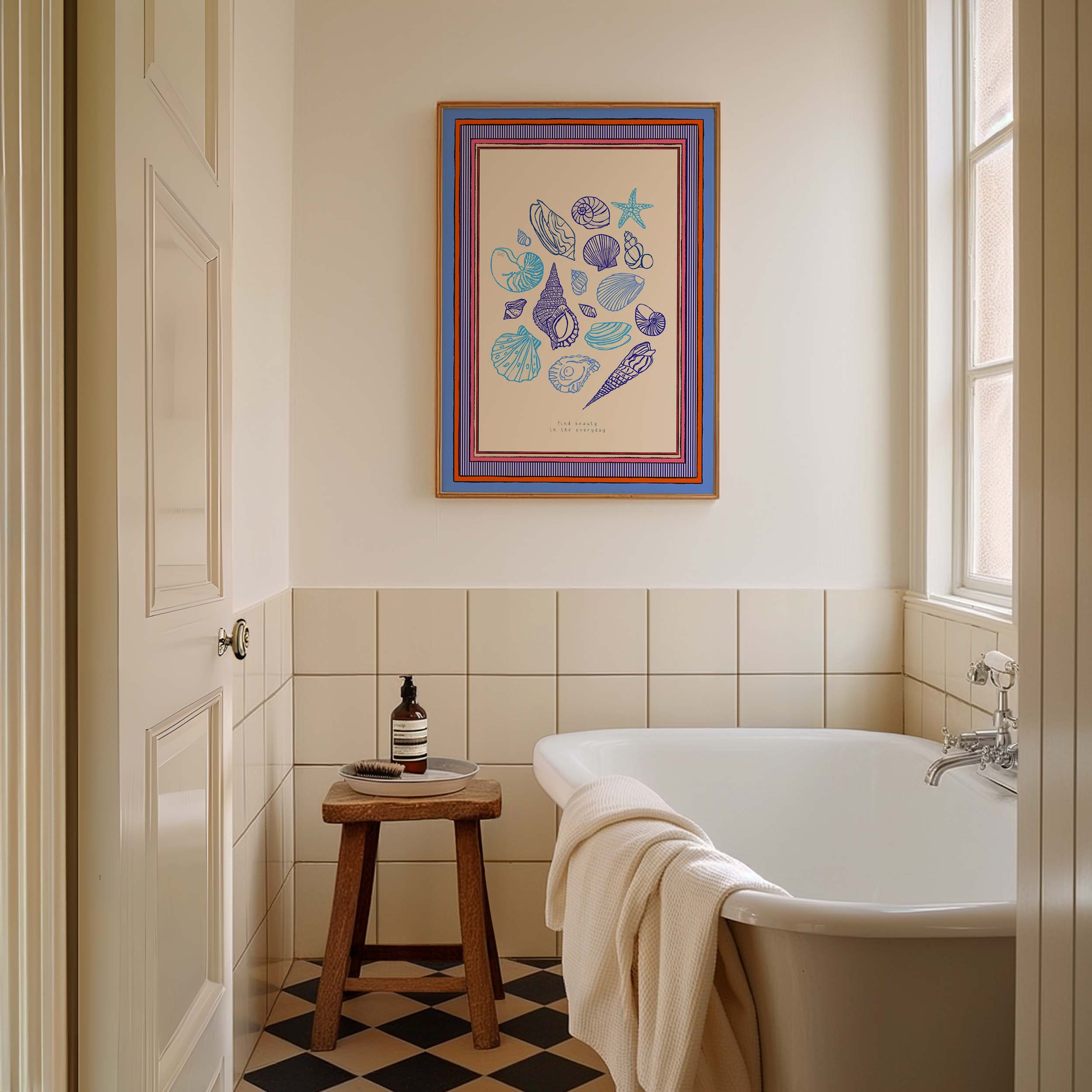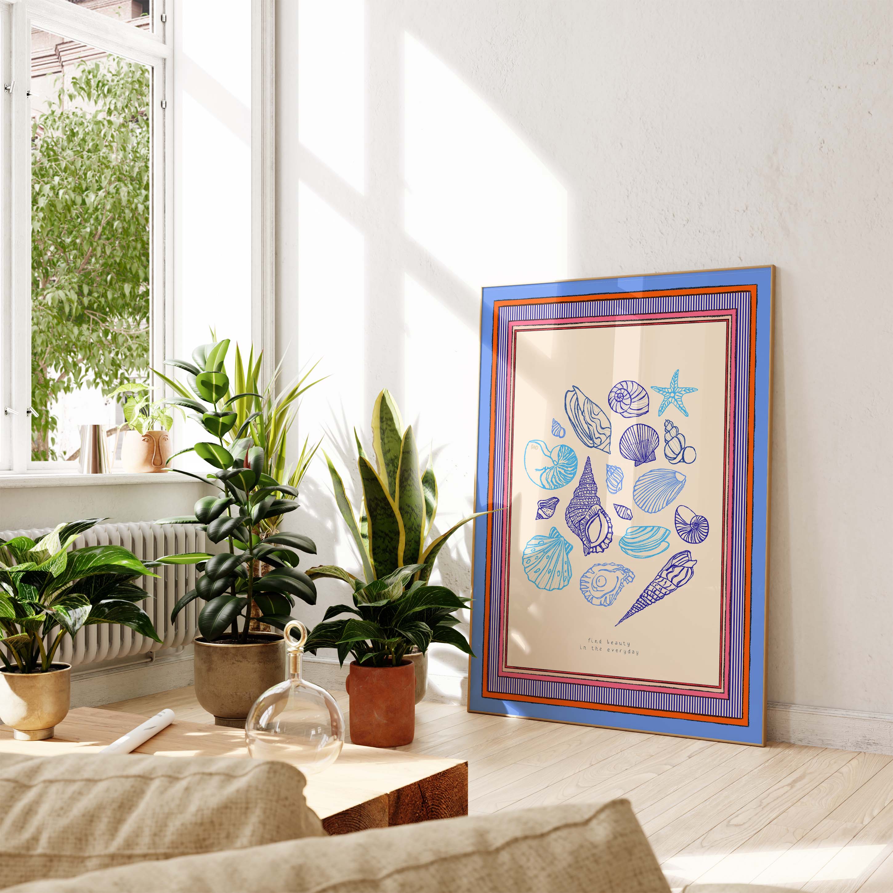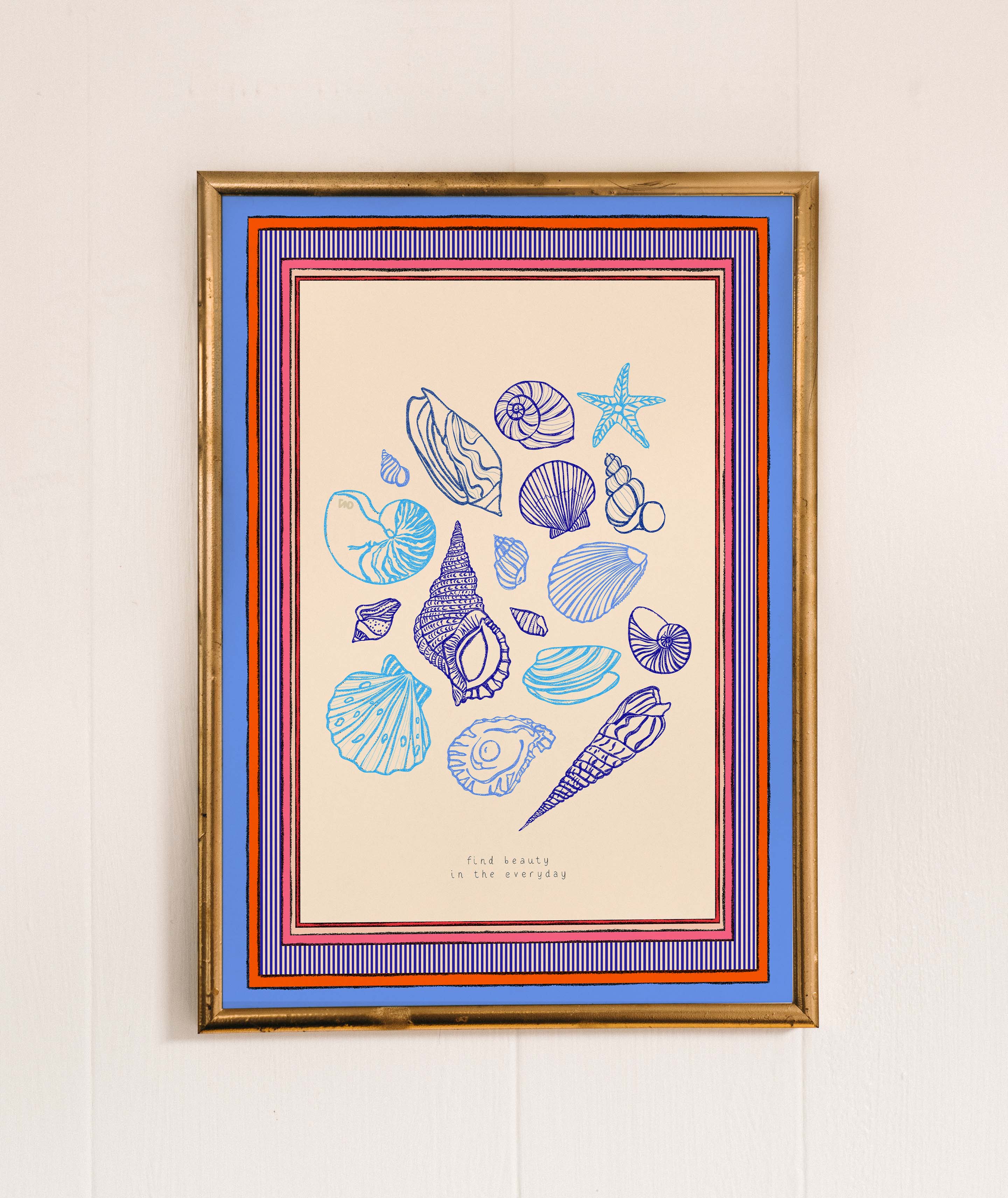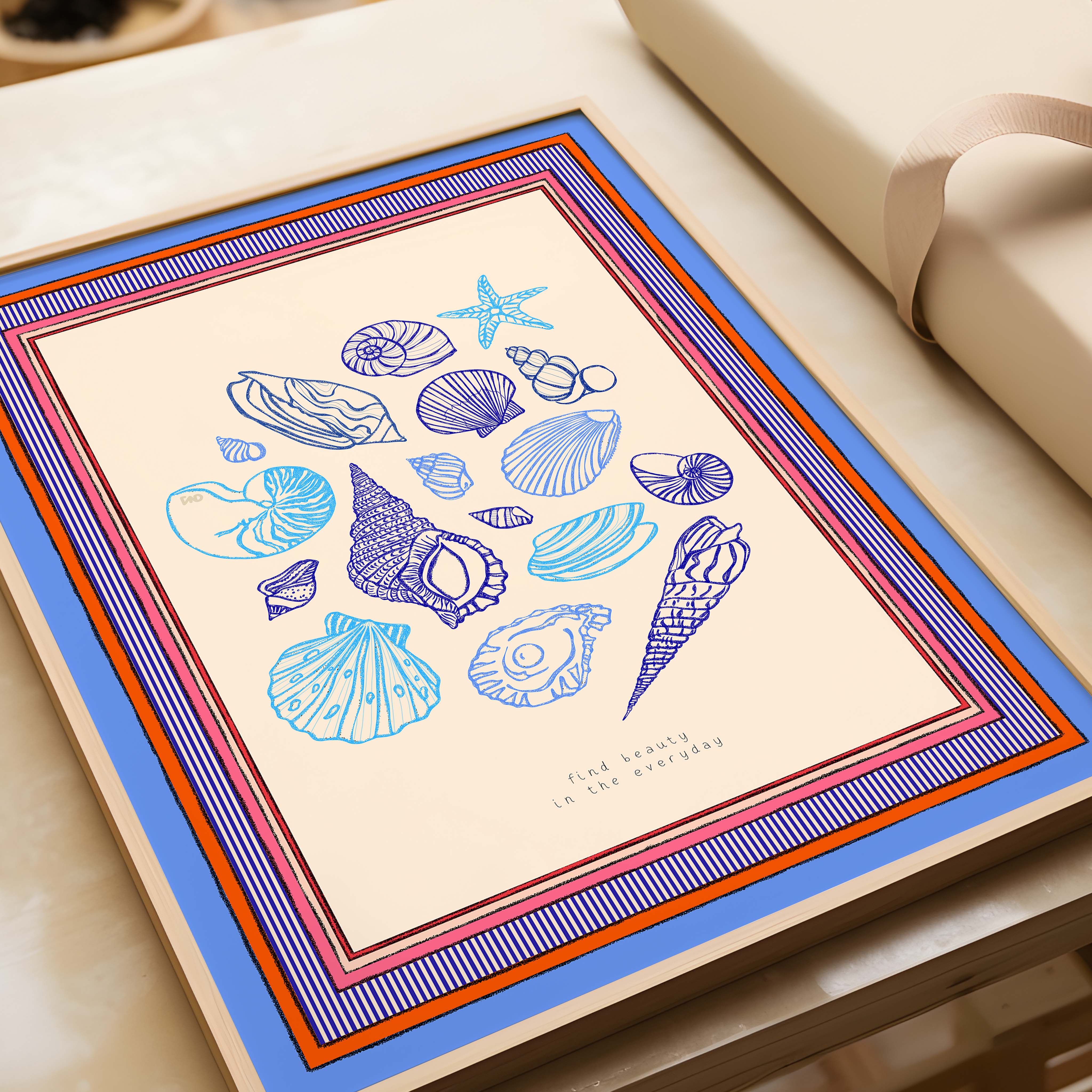 A blue line art print of shells with the hand-written quote 'find beauty in the everyday' surrounded by an illustrated border.
