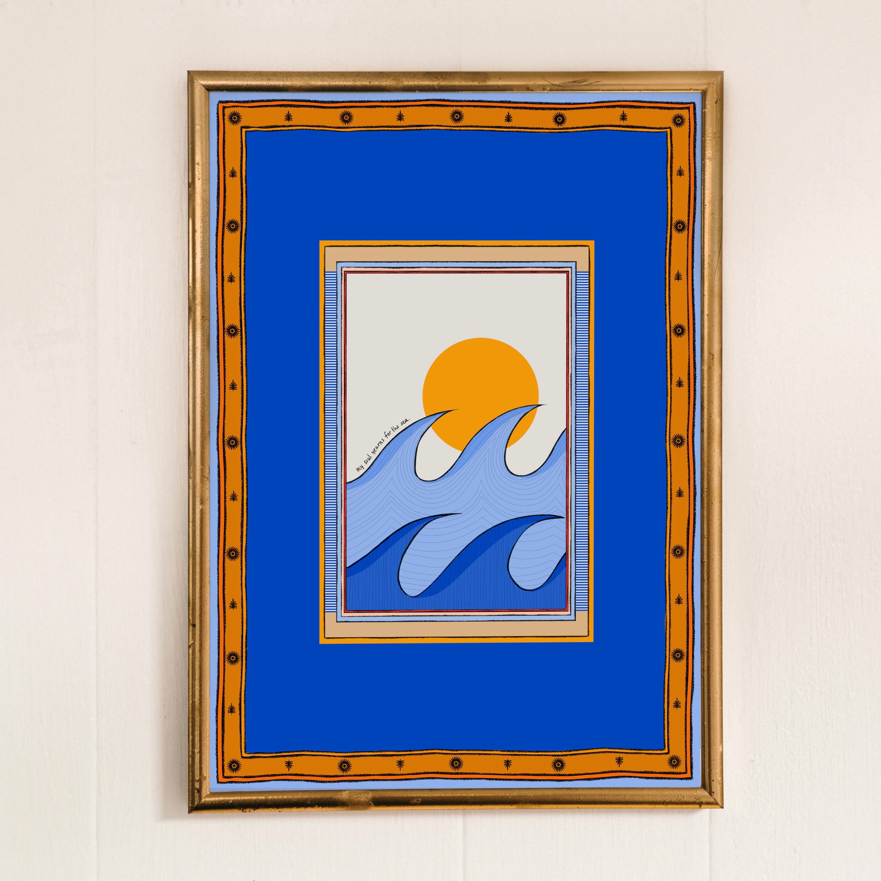 A vibrant art print of waves in a variety of shades of blue with the quote 'my soul yearns for the sea' hand-written in the water.