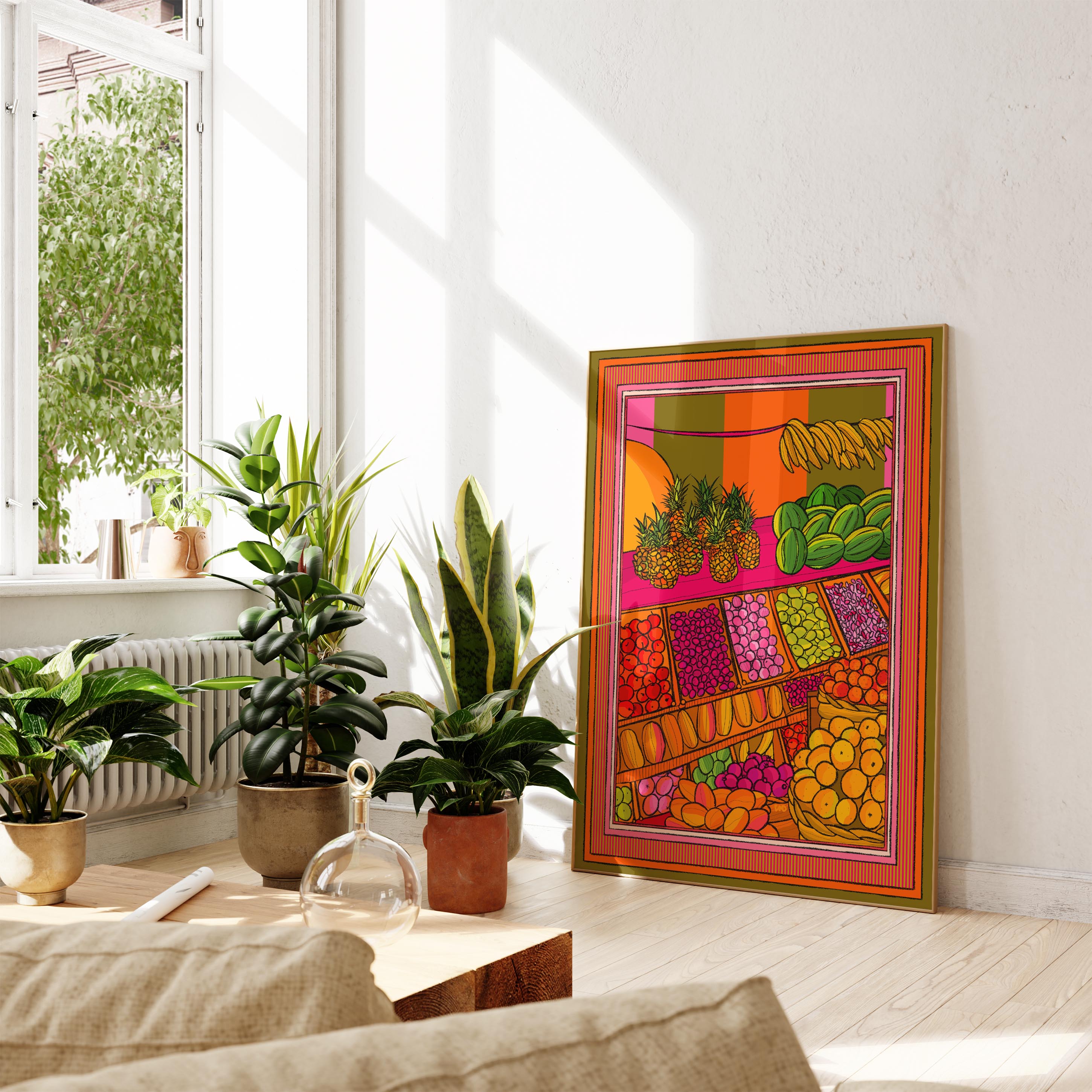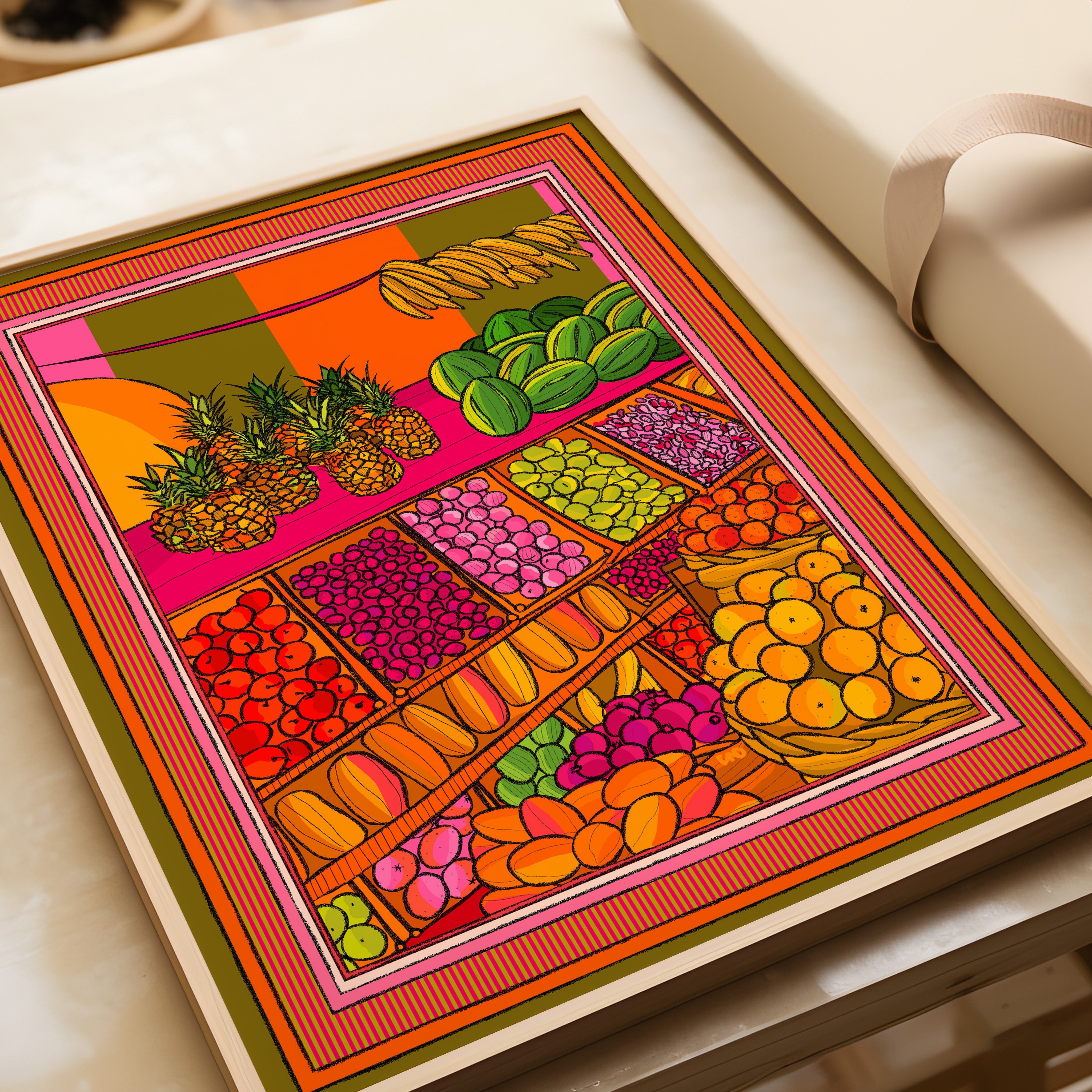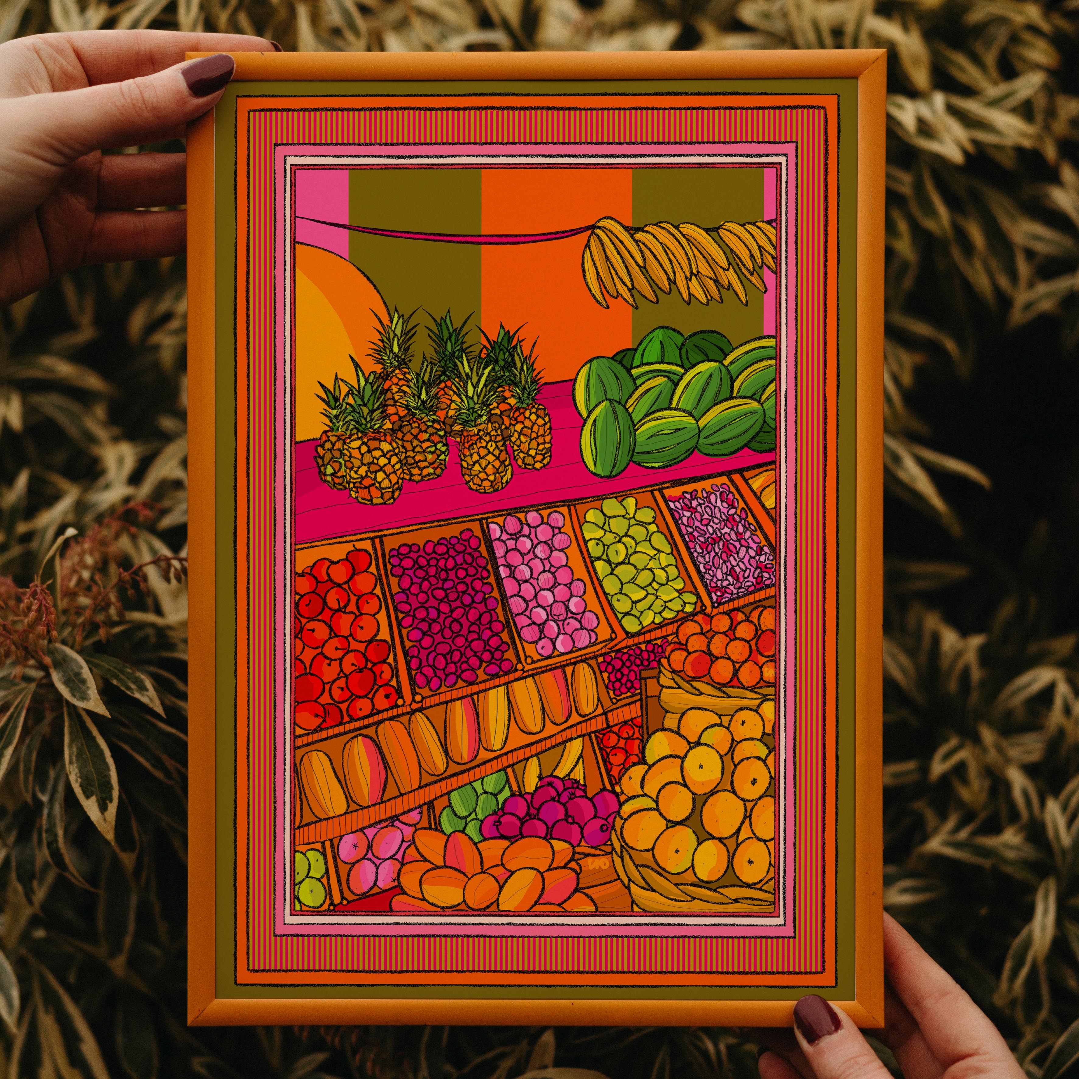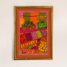A vibrant art print of a fruit market with an illustrated border.