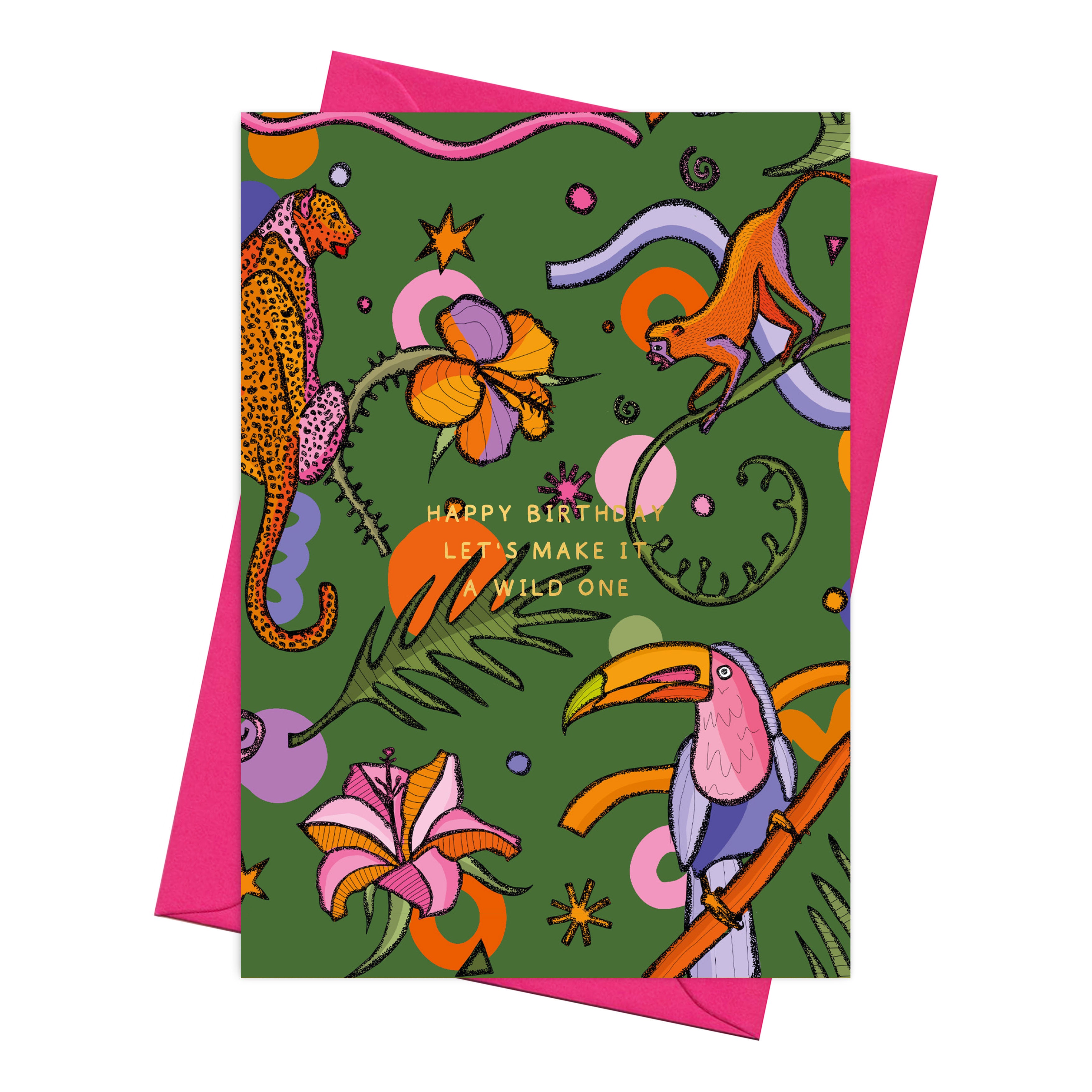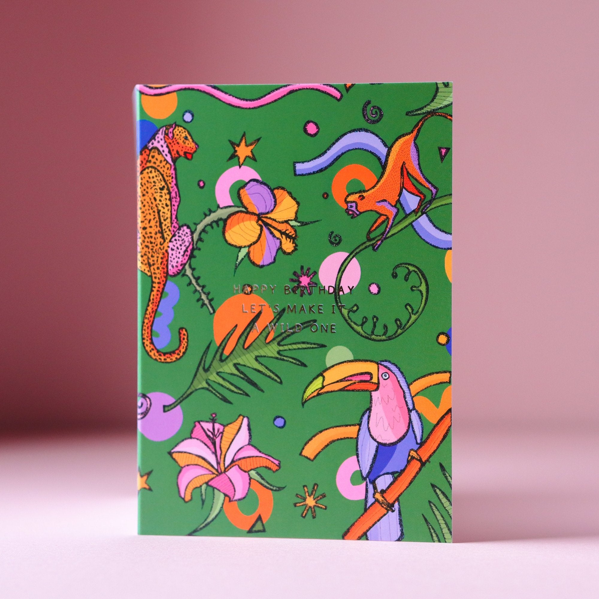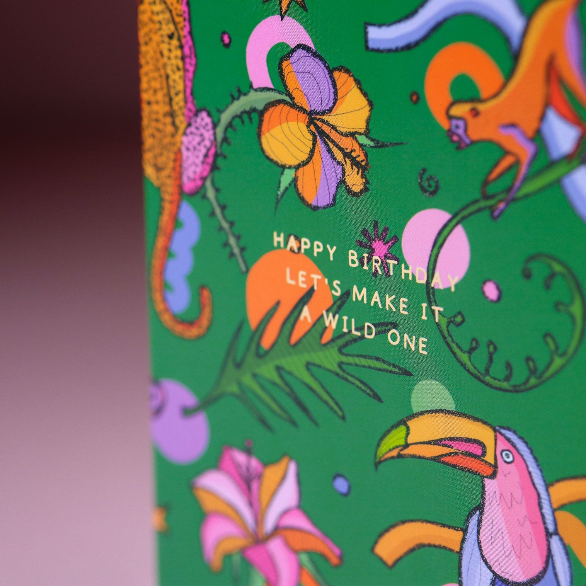 This colourful greeting card features my original artwork of a jungle with a toucan, leopard, and monkey, with the text 'HAPPY BIRTHDAY LET'S MAKE IT A WILD ONE' written in gold foil.