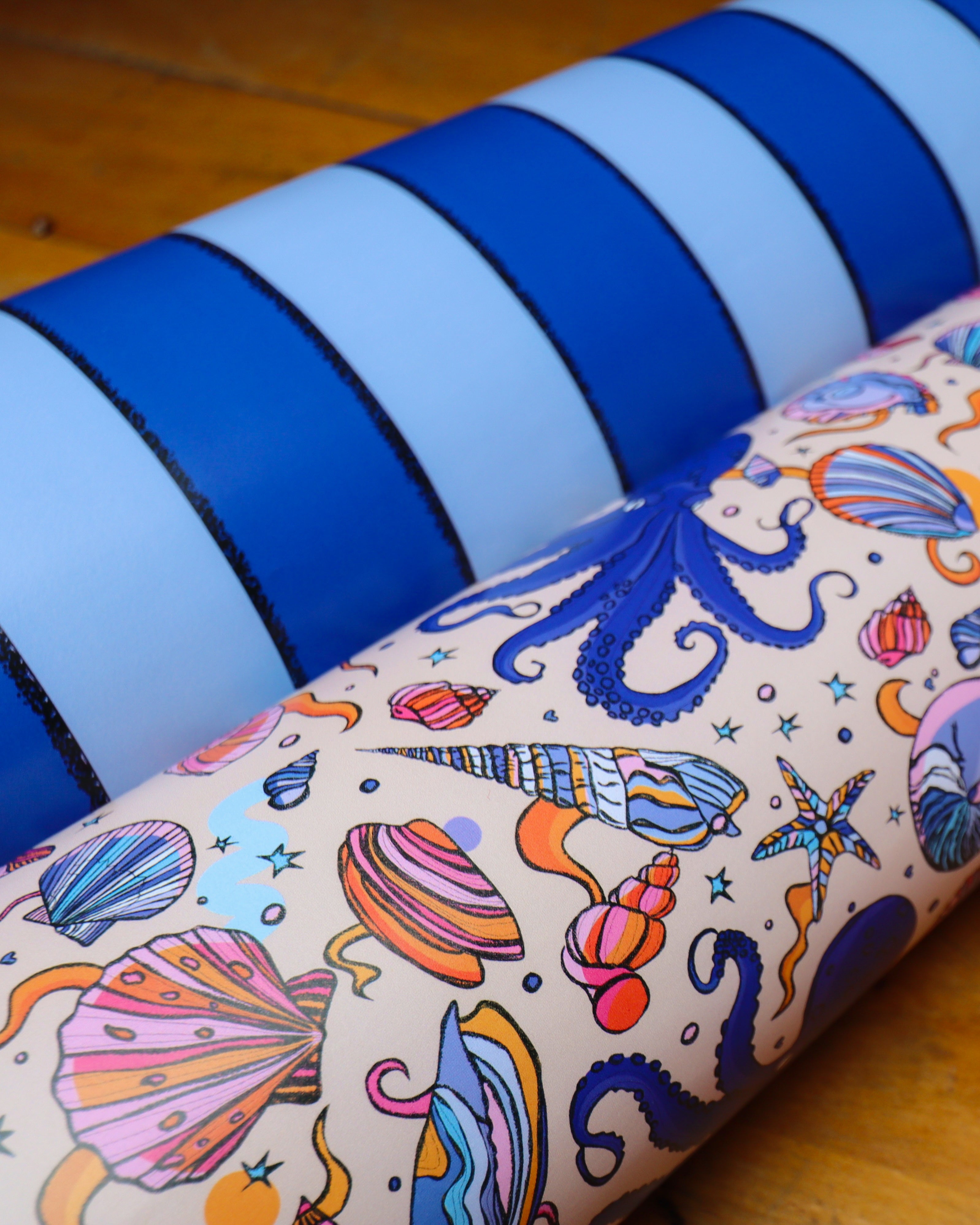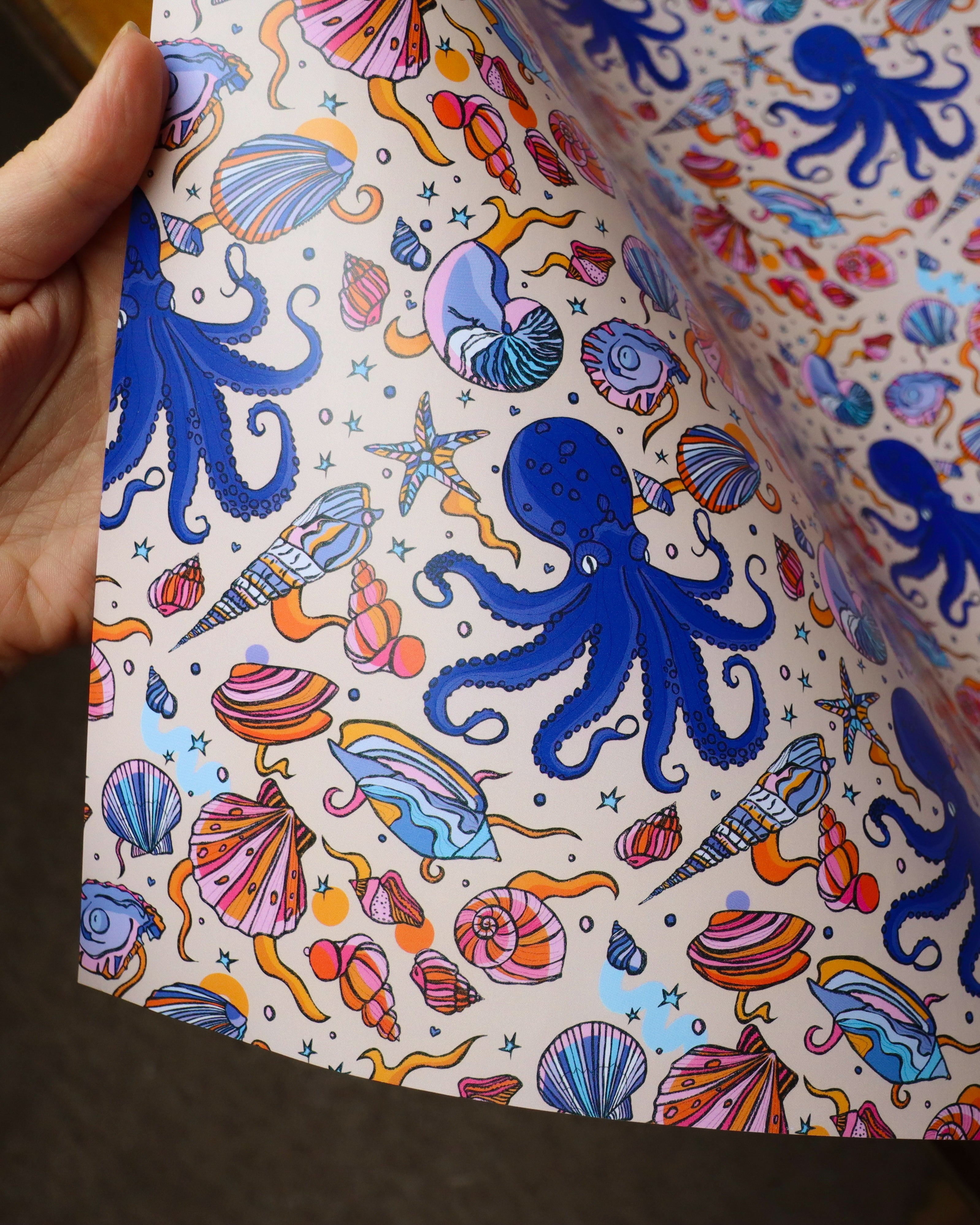 This colourful wrapping paper features my original pattern of shells and octopus. Illustrated in blue, pink, and beige.