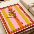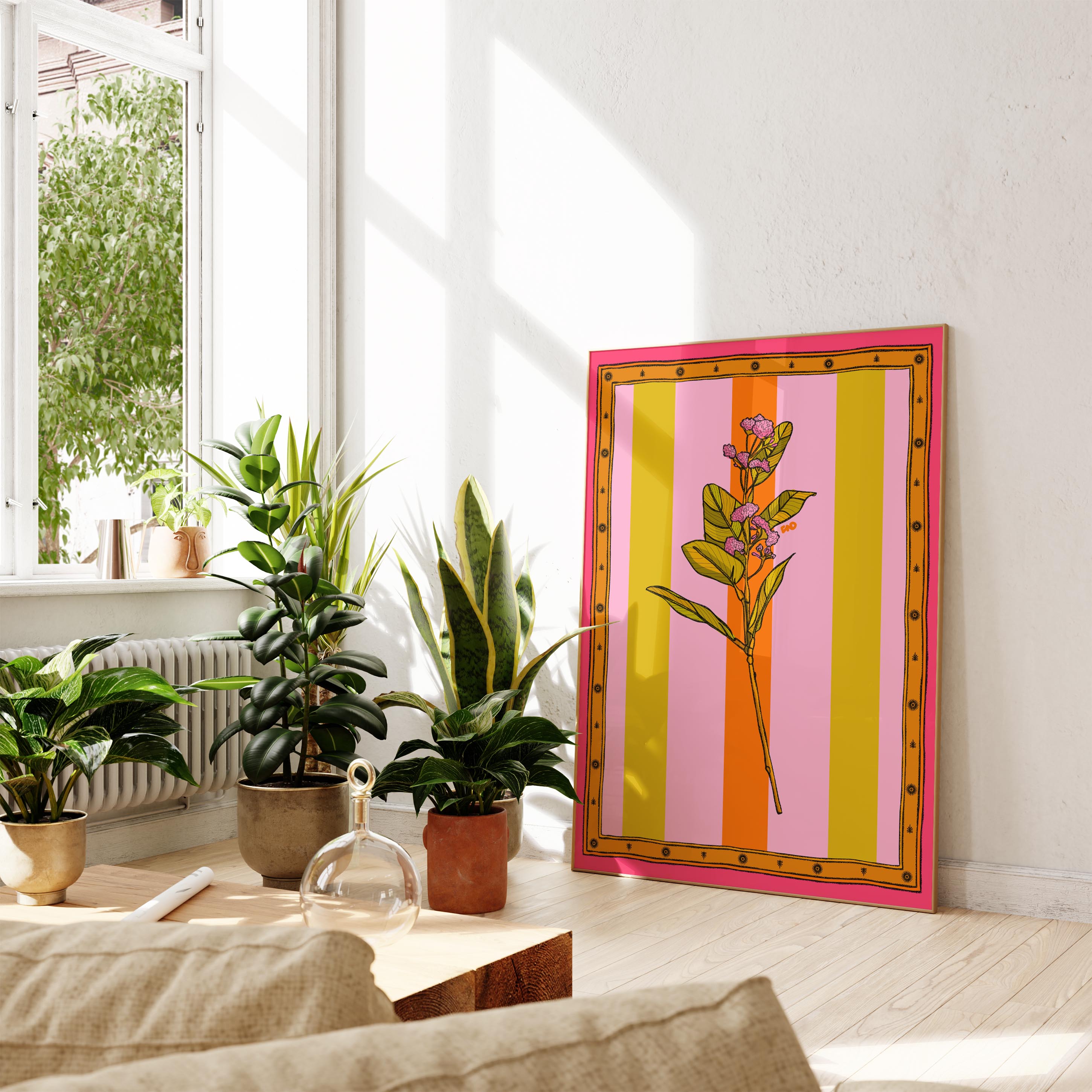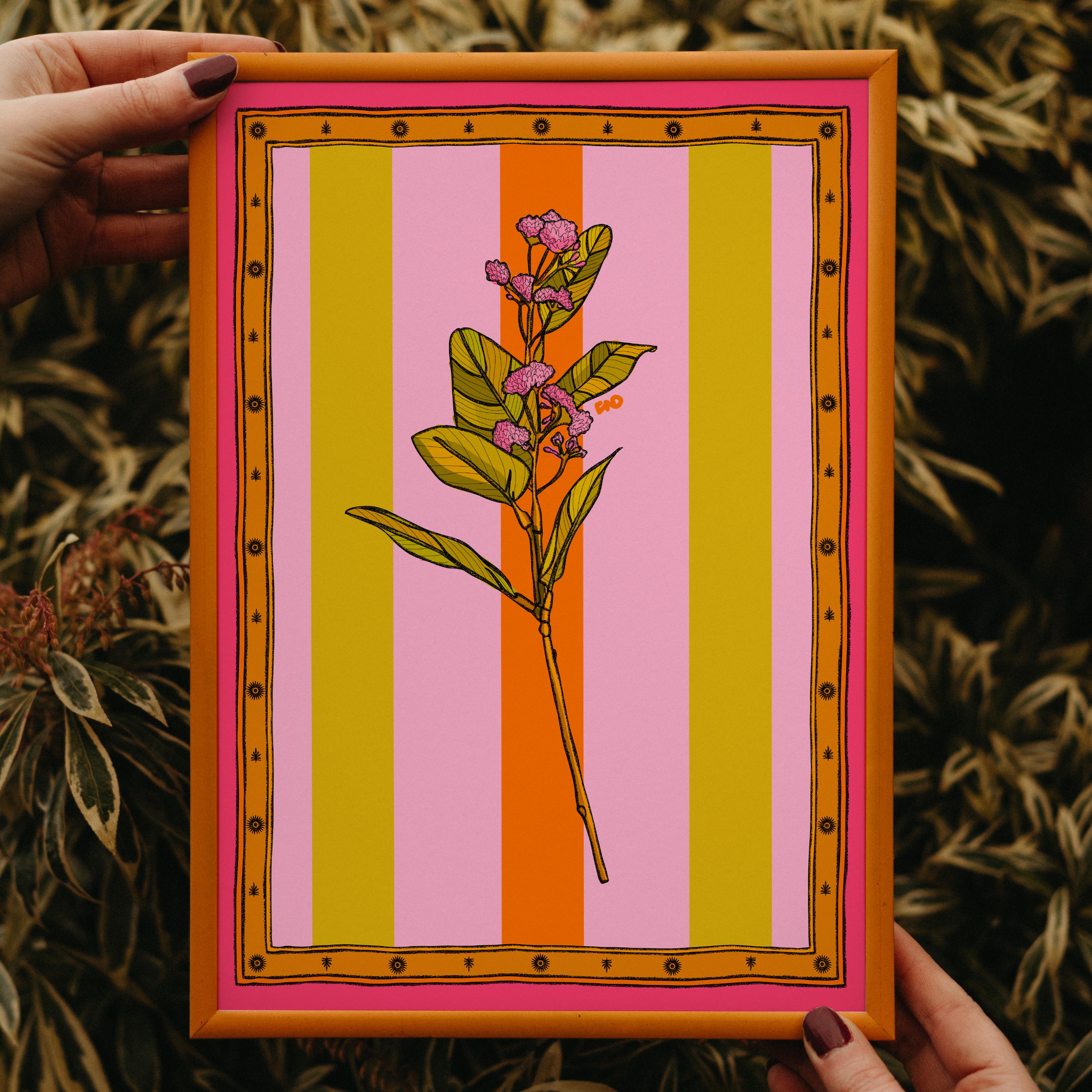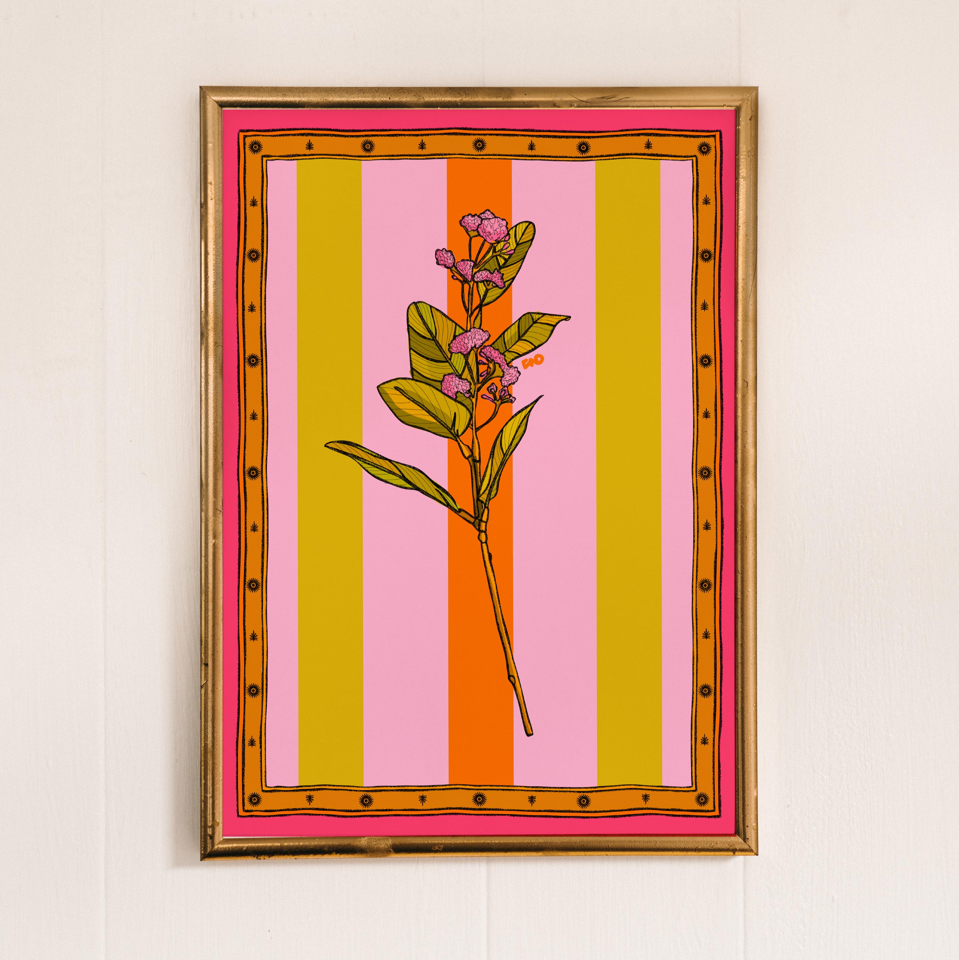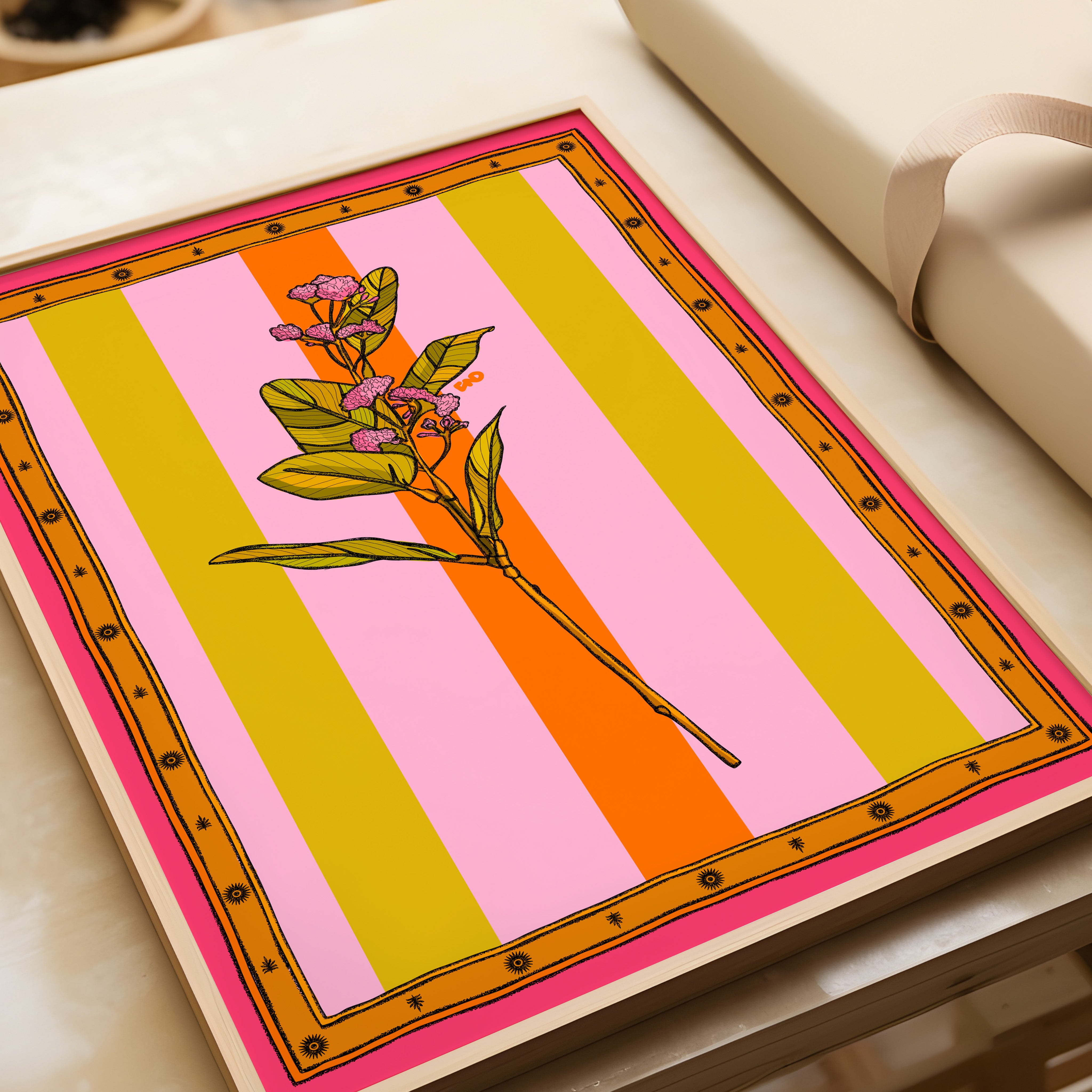 A vibrant stripey art print of a tropical flower with an illustrated border.