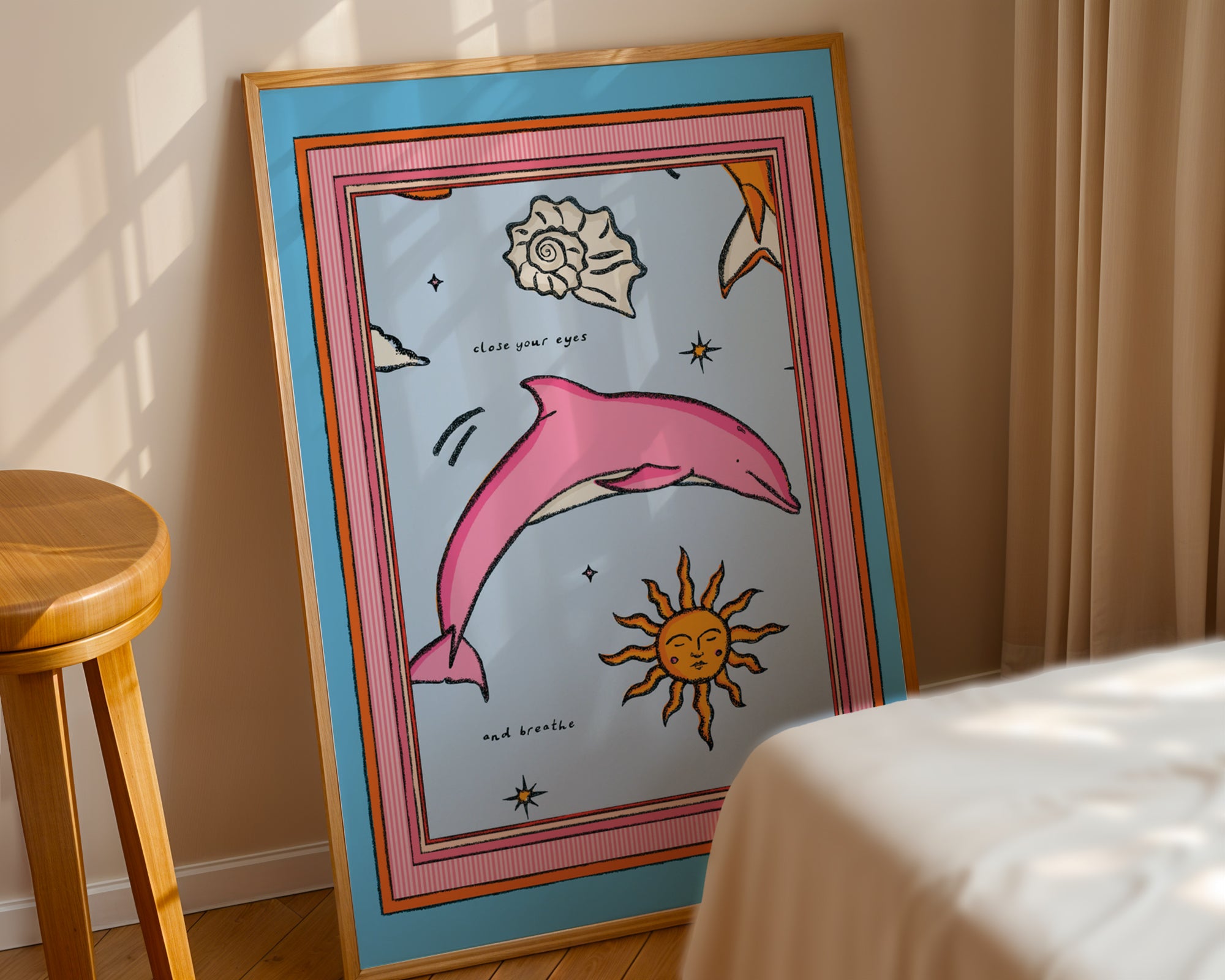 Close Your Eyes and Breathe- a blue and pink print featuring a dolphin surrounded by a striped border.