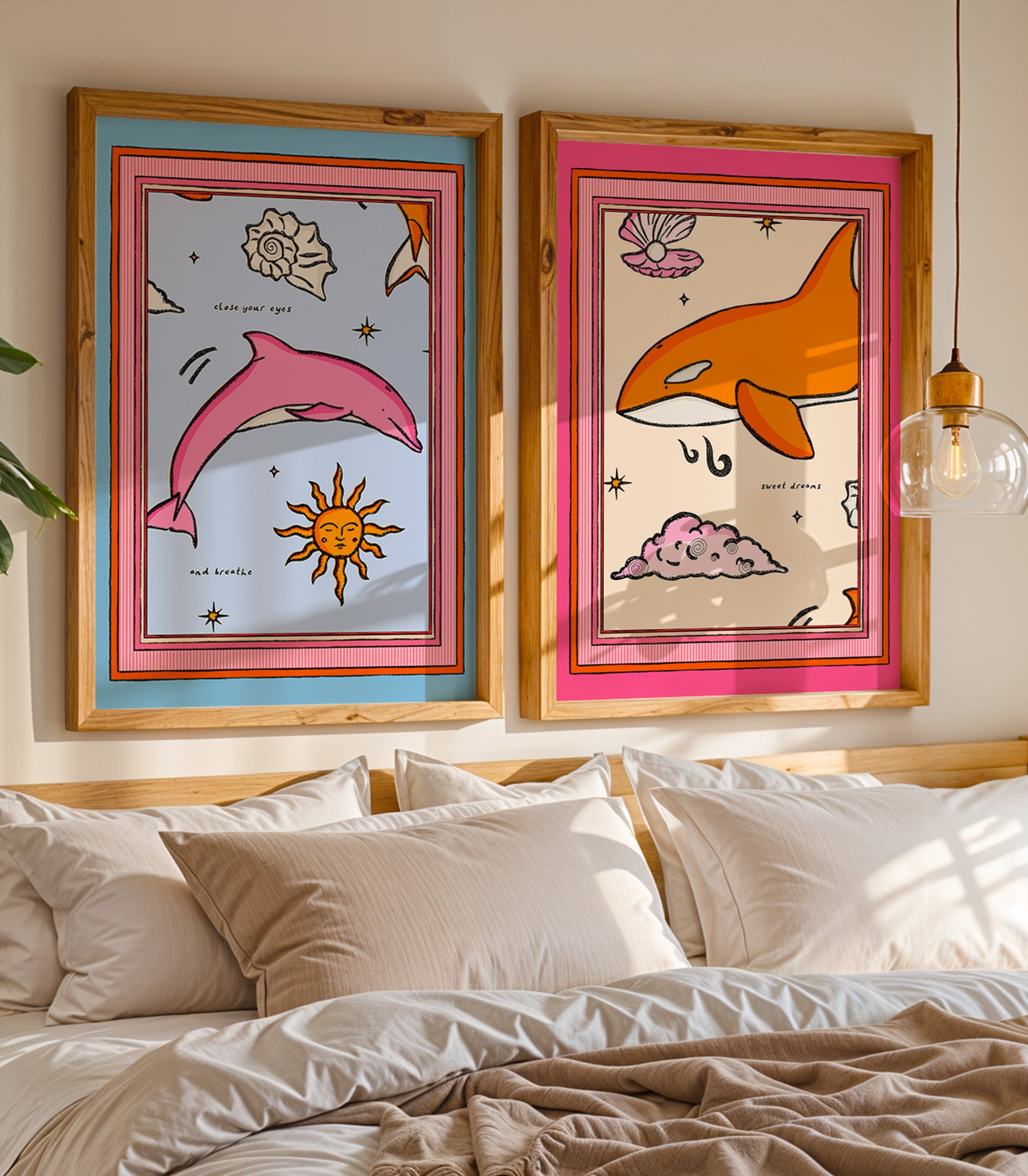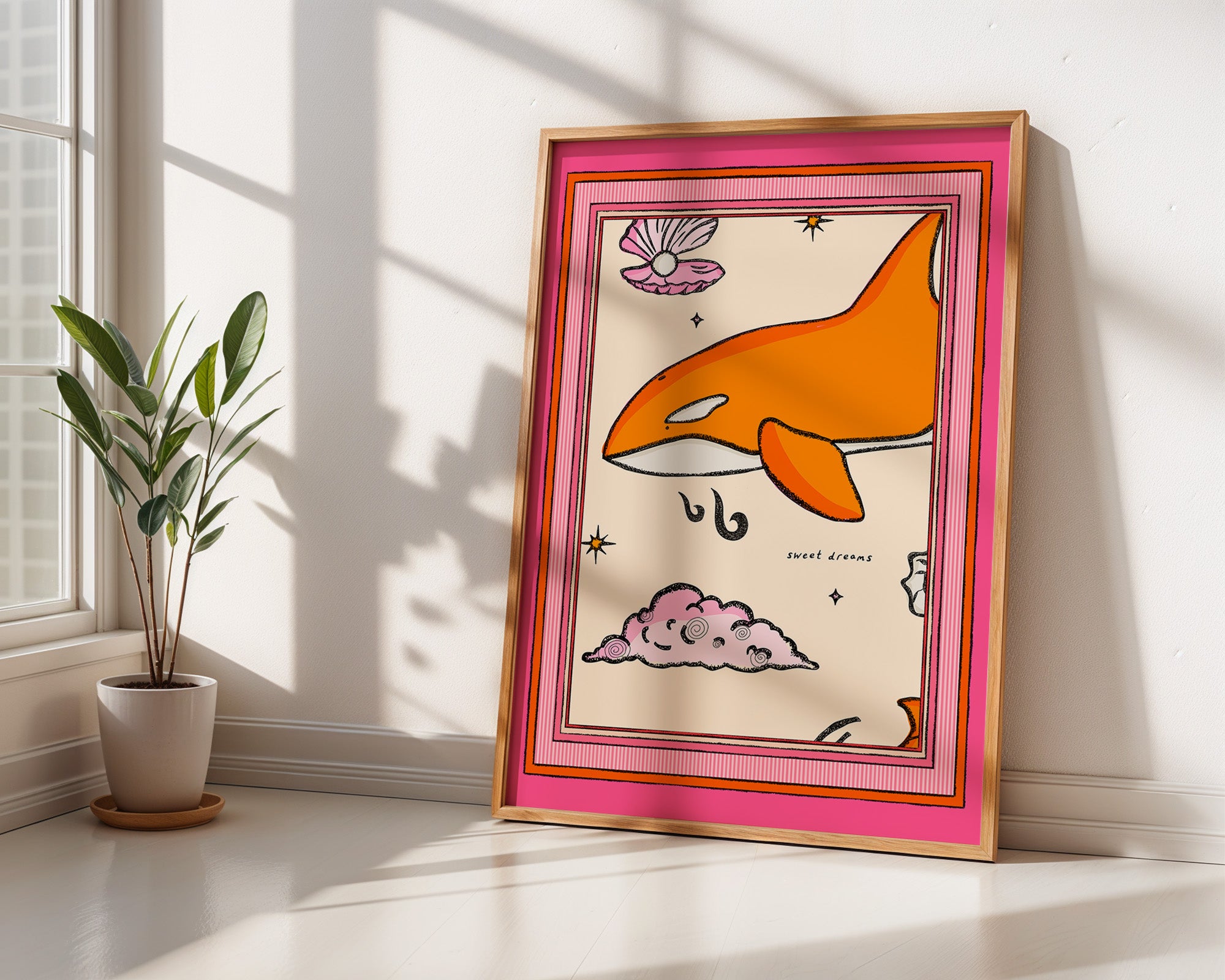 Sweet Dreams- a pink and orange print featuring an orca surrounded by a striped border.