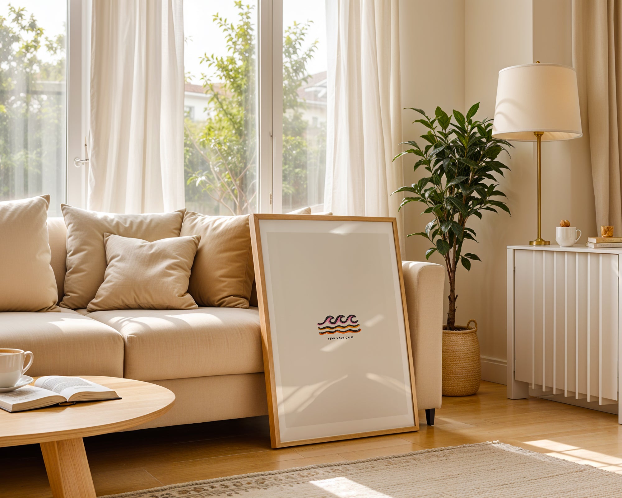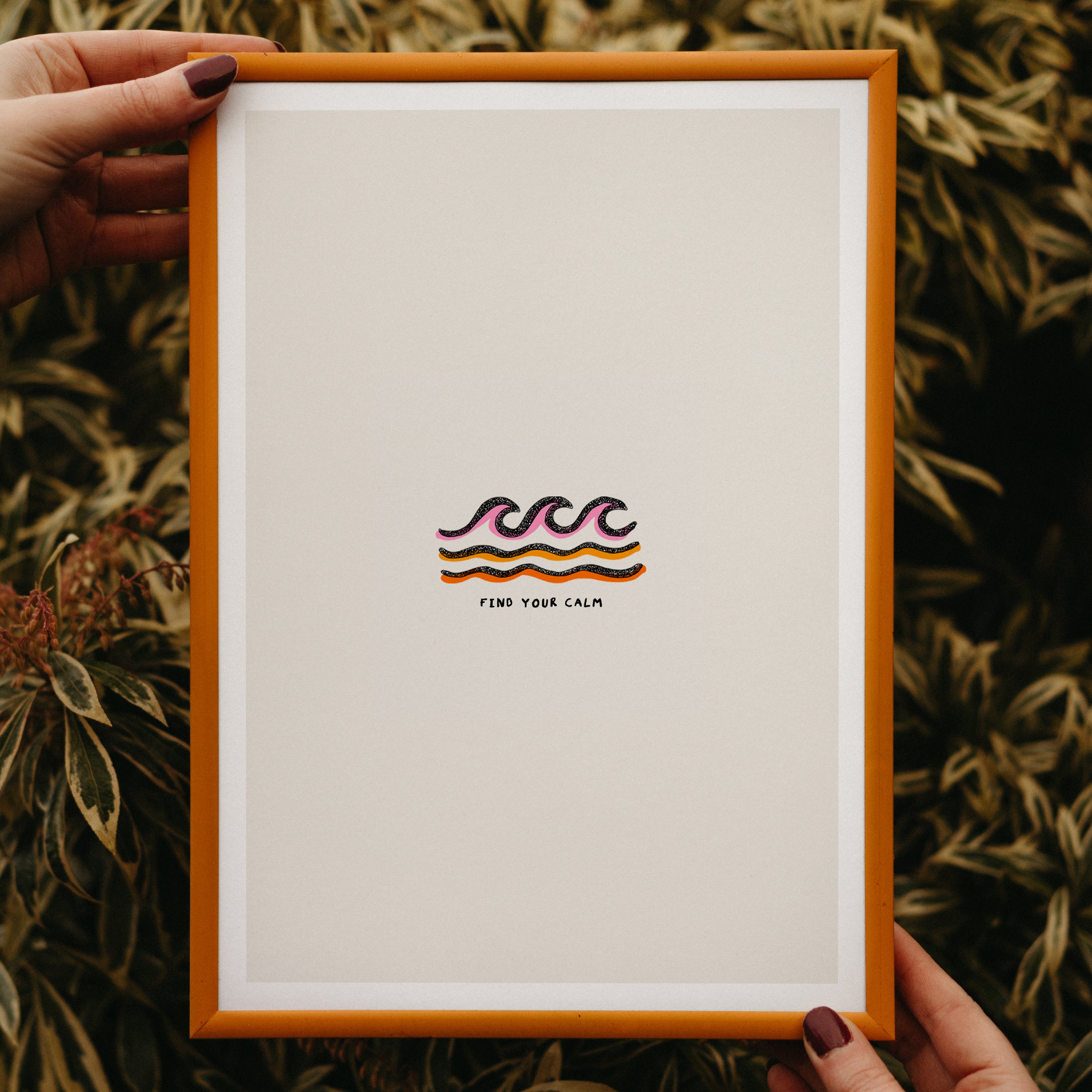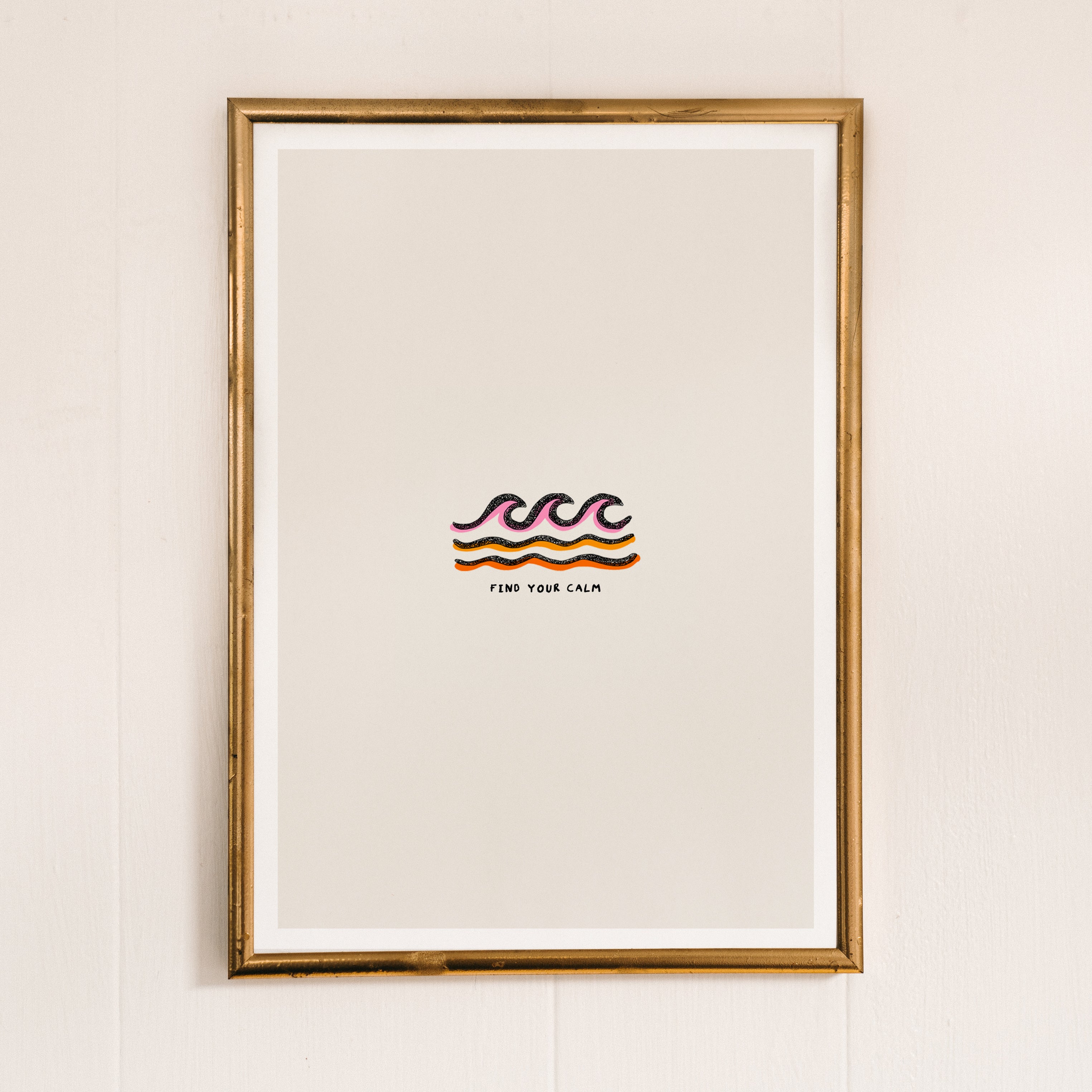 A minimal art print of waves with the quote 'find your calm'. Illustrated in beige, black, pink, orange, and yellow.