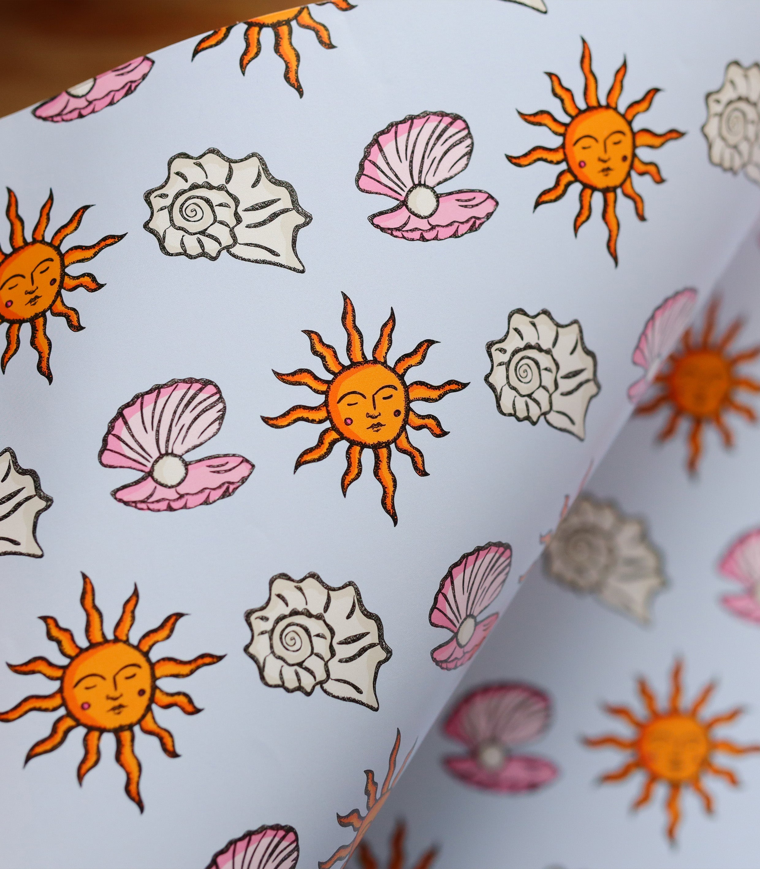 This colourful wrapping paper features suns, shells, and pearls.