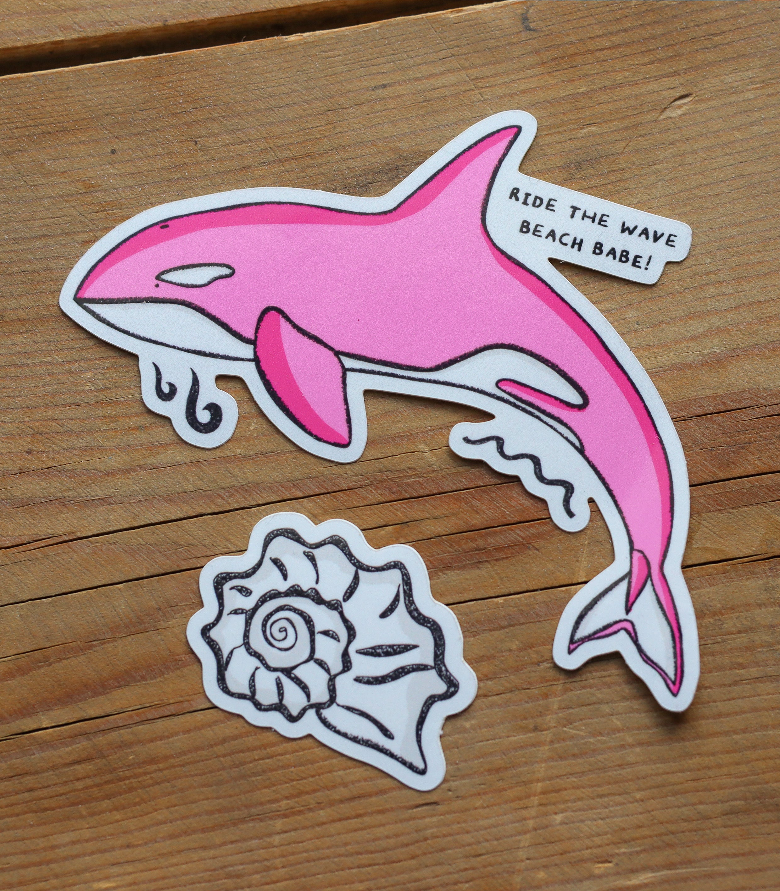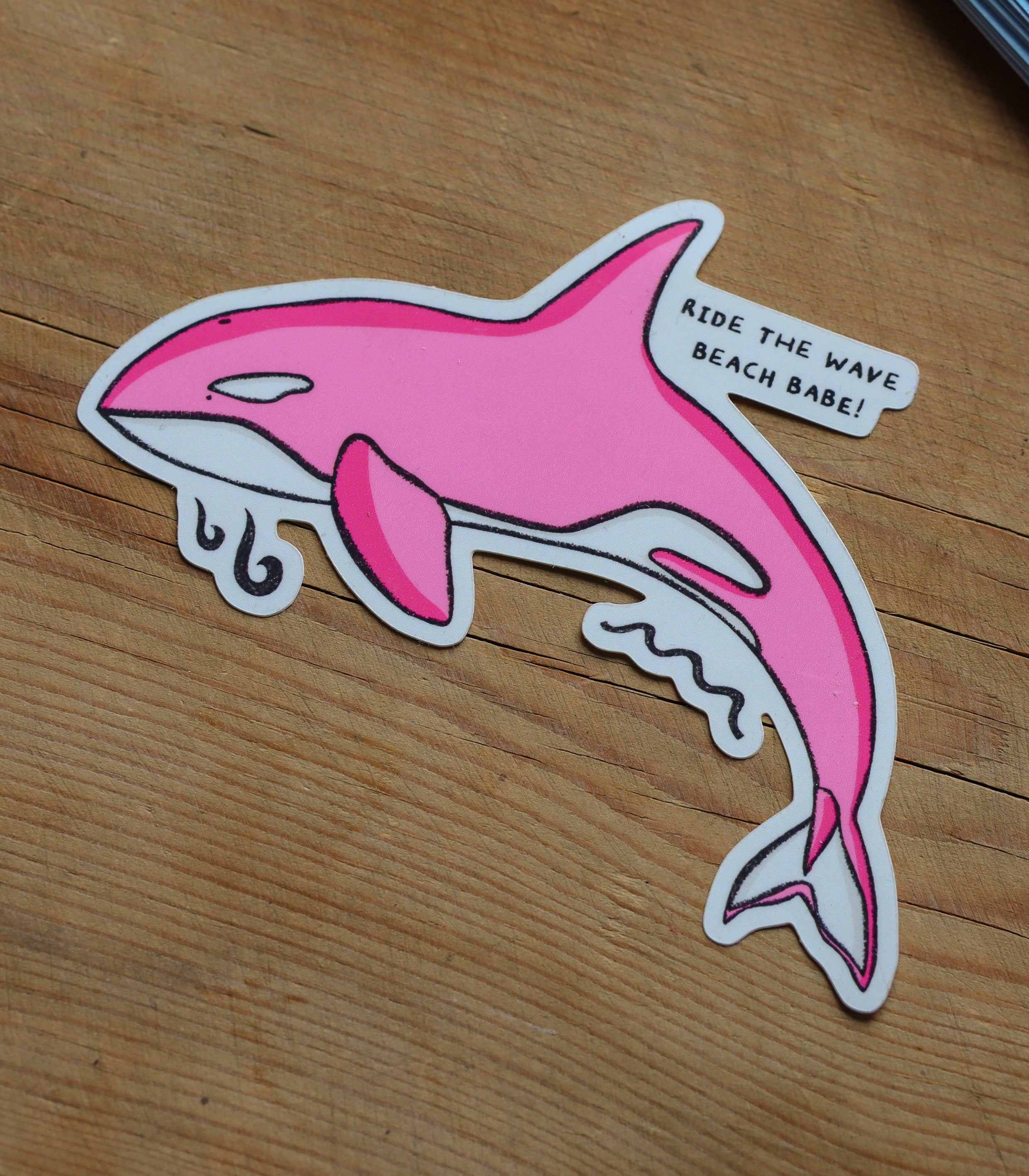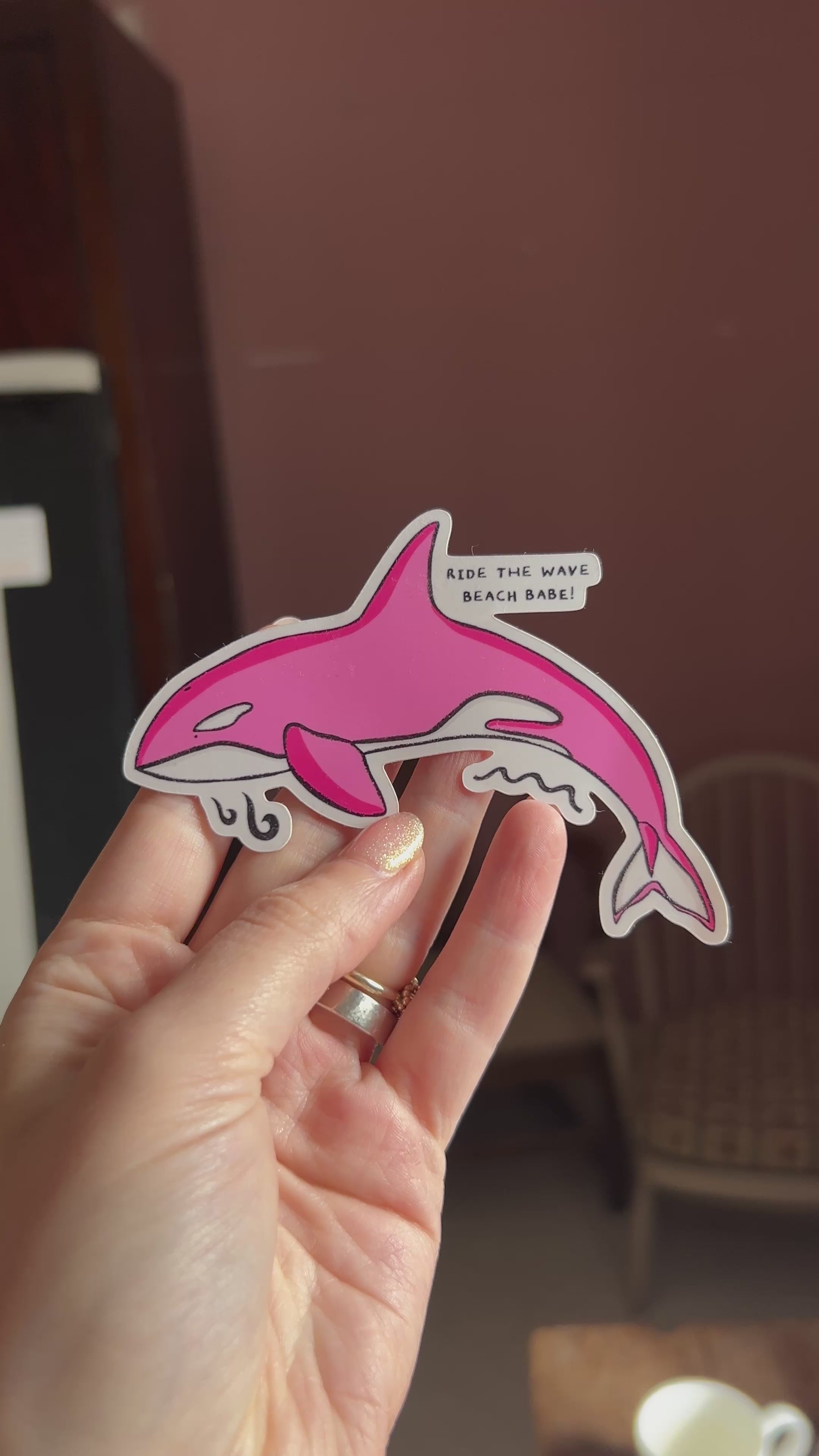A glossy die-cut shell and whale sticker with the quote 'Ride The Wave Beach Babe!' illustrated in pink.
