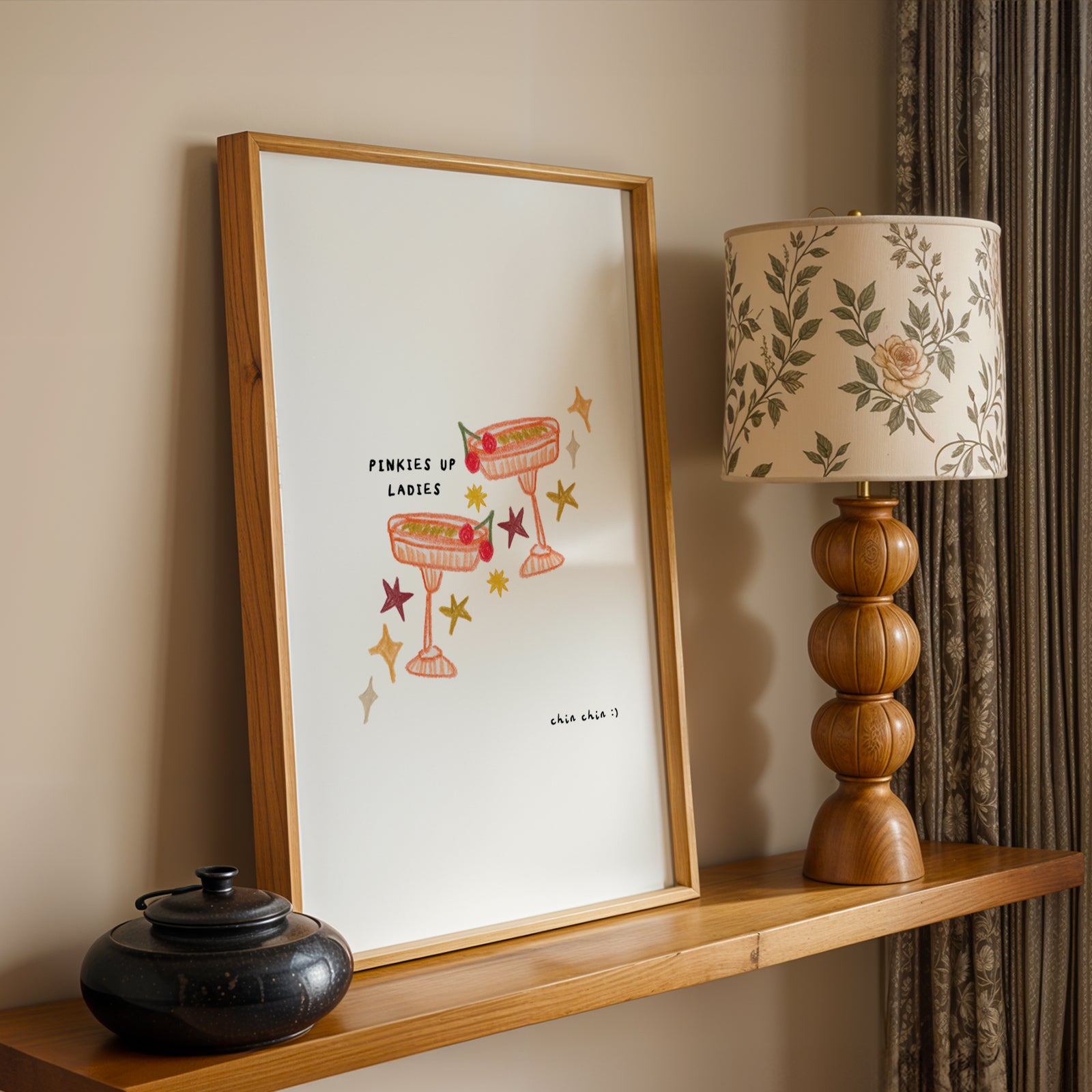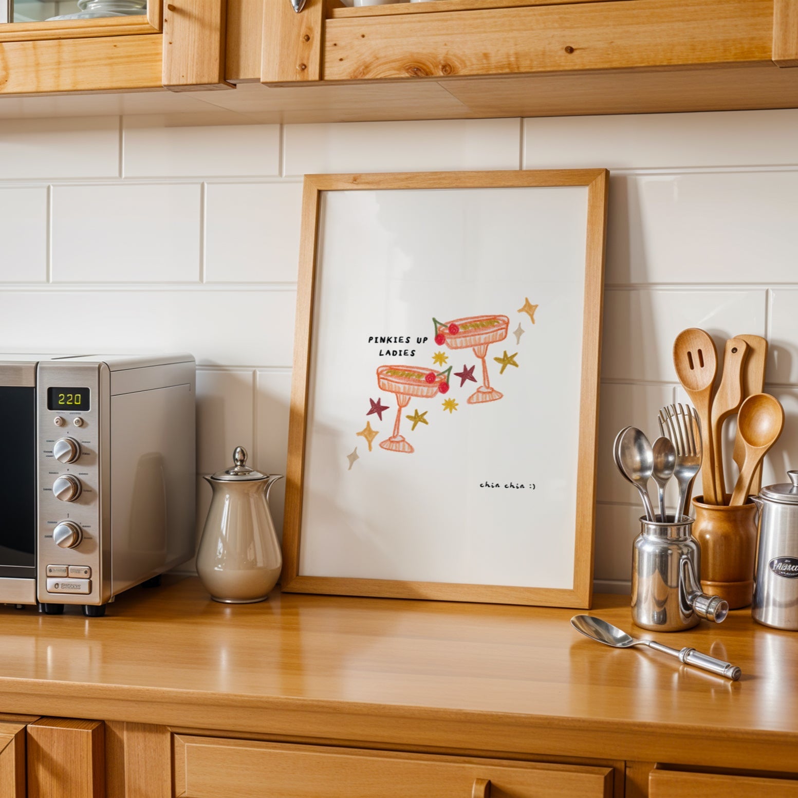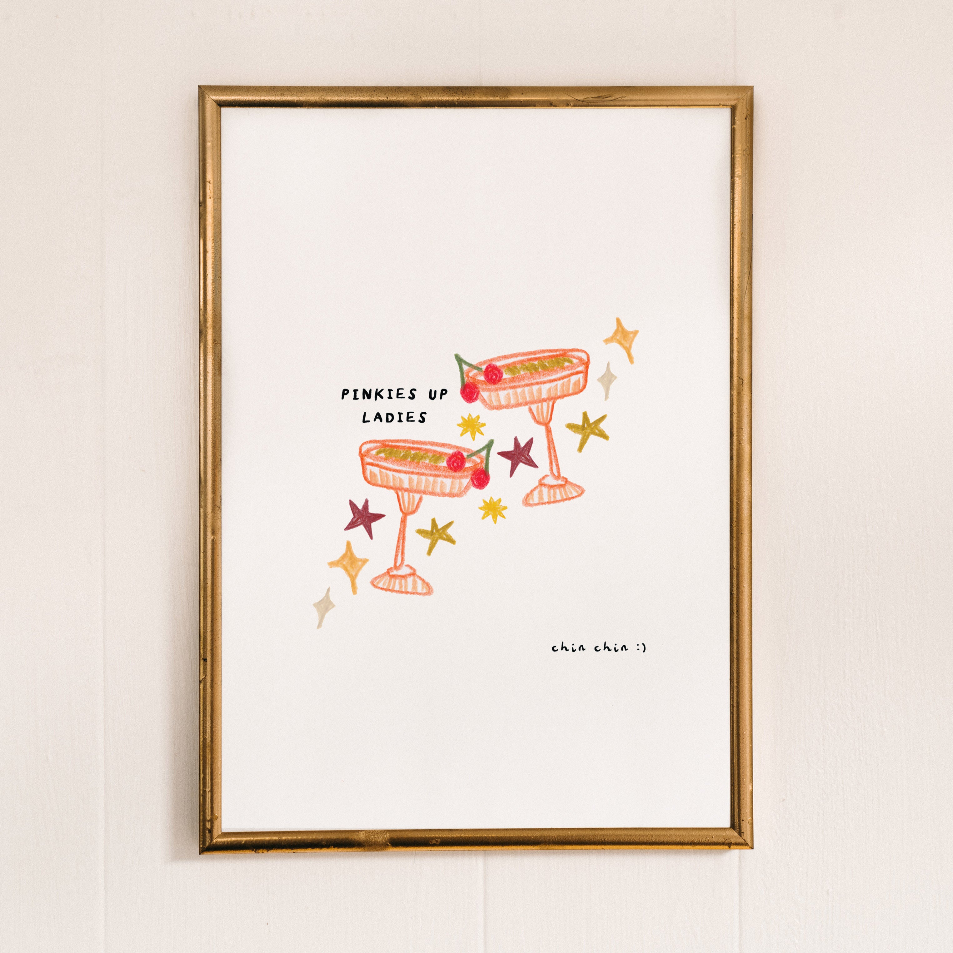 Cheers to fabulous cocktail art! This hand-drawn print features two clinking glasses, surrounded by stars, with playful phrases 'pinkies up ladies' and 'chin chin.' The perfect addition to any bar or kitchen illustrated in neutral tones.
