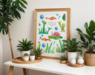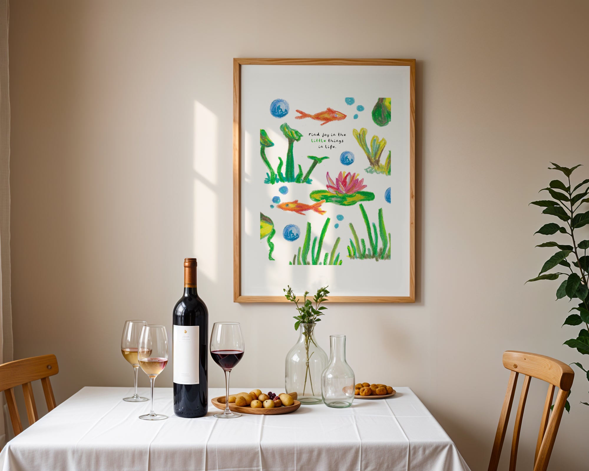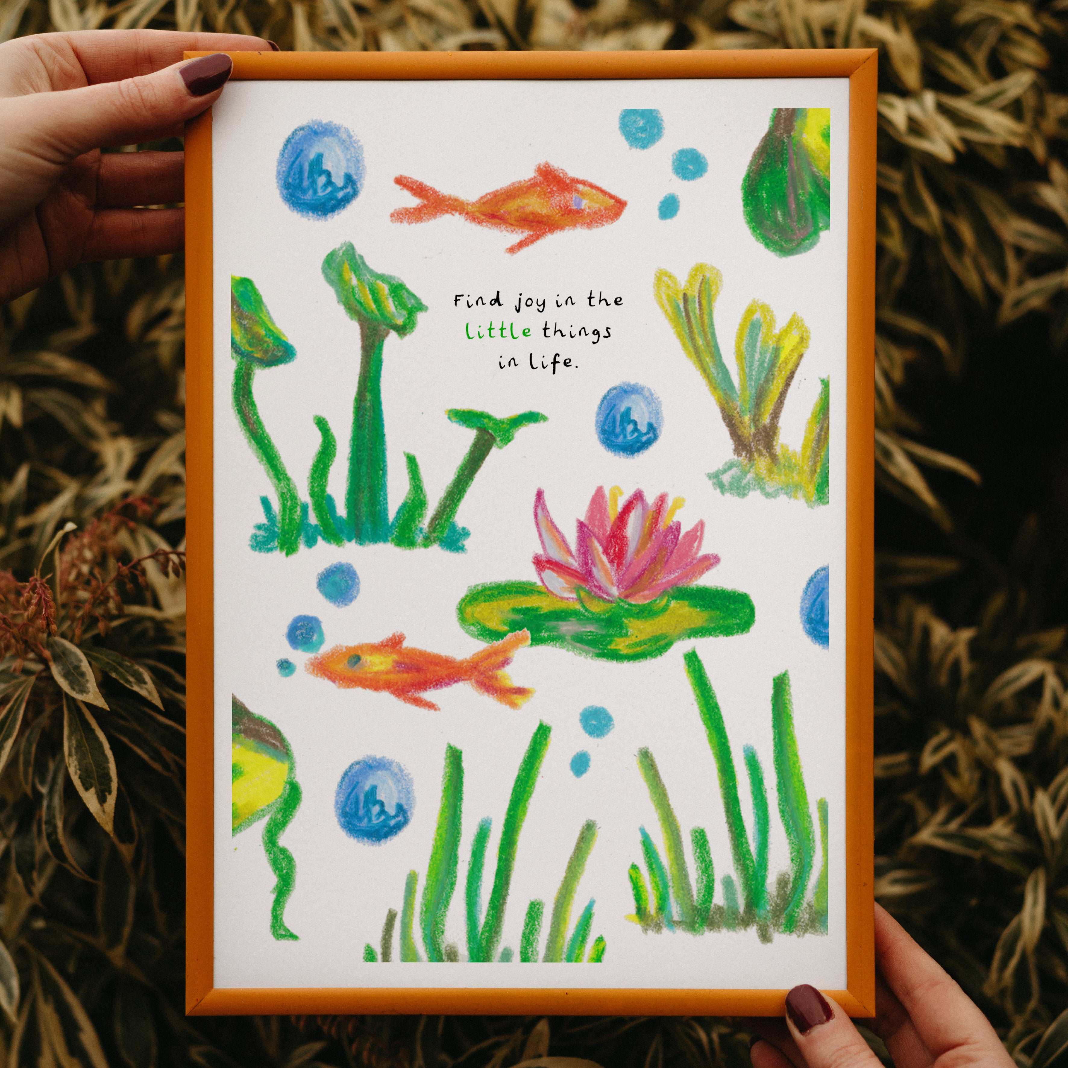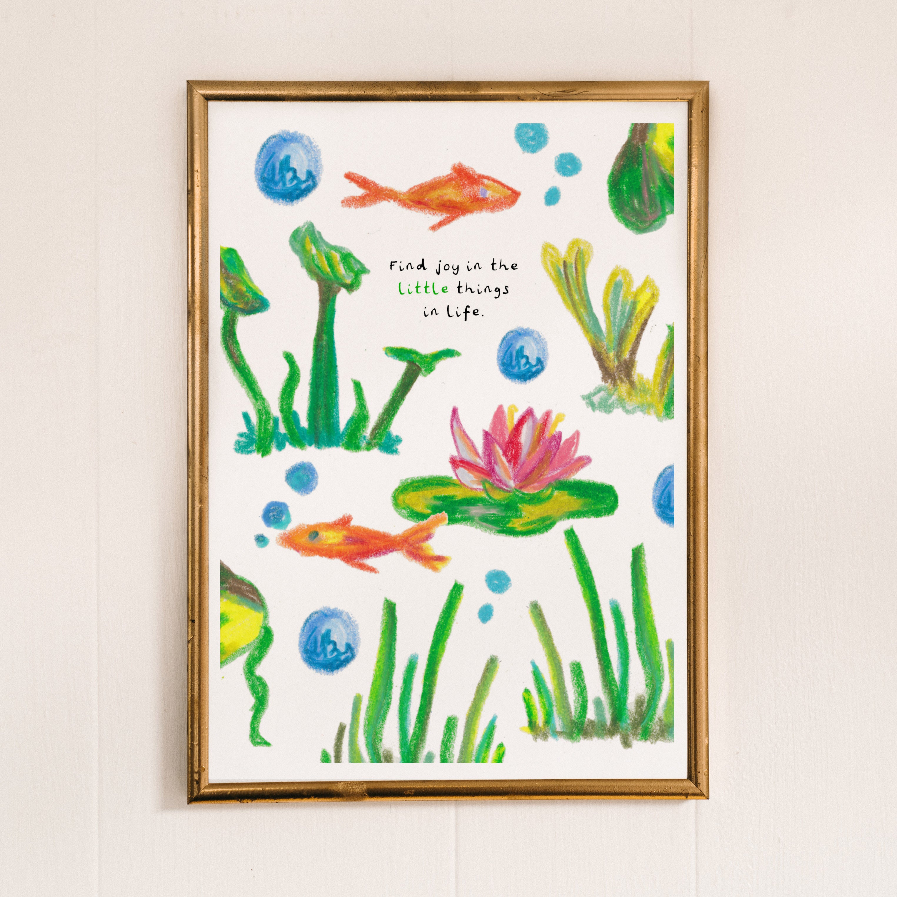A hand-drawn art print of a fish pond with the text 'Find joy in the little things in life'. Illustrated in green, orange, blue, and pink.