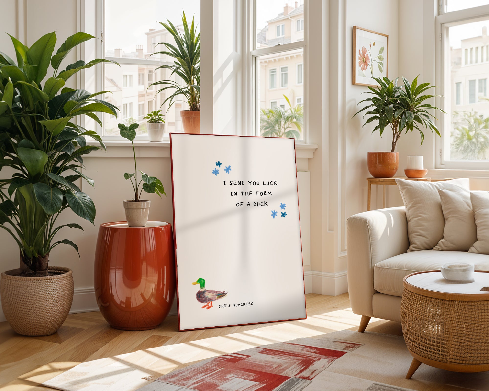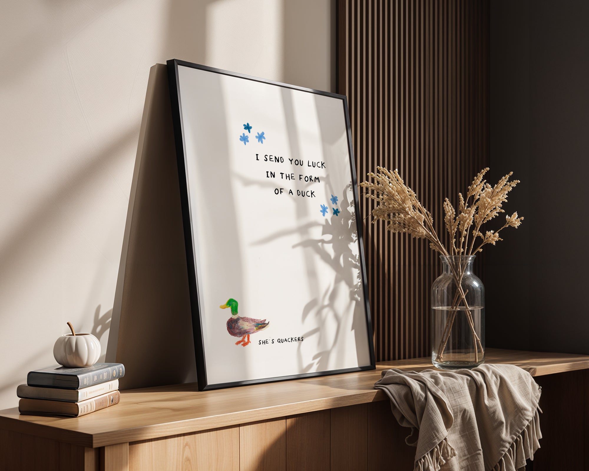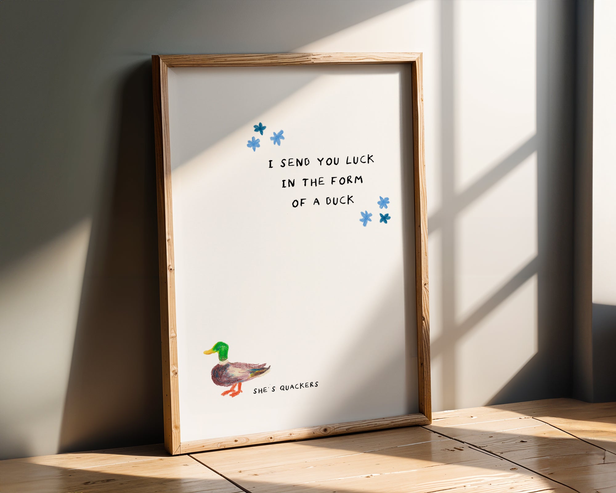 A cute hand-drawn art print of a duck with the text 'I send you luck in the form of a duck' with the text 'she's quackers' handwritten underneath.