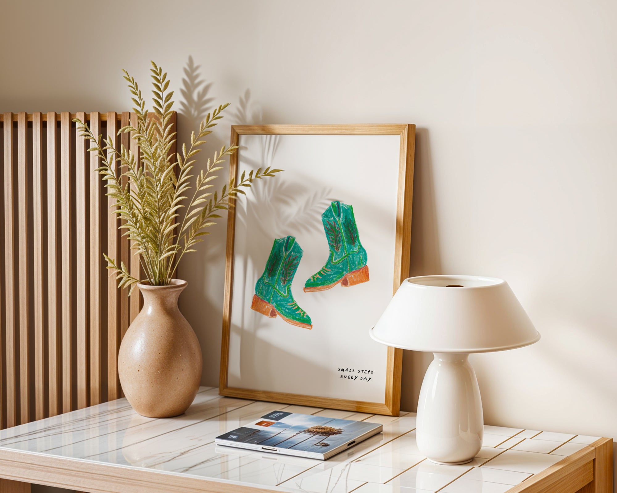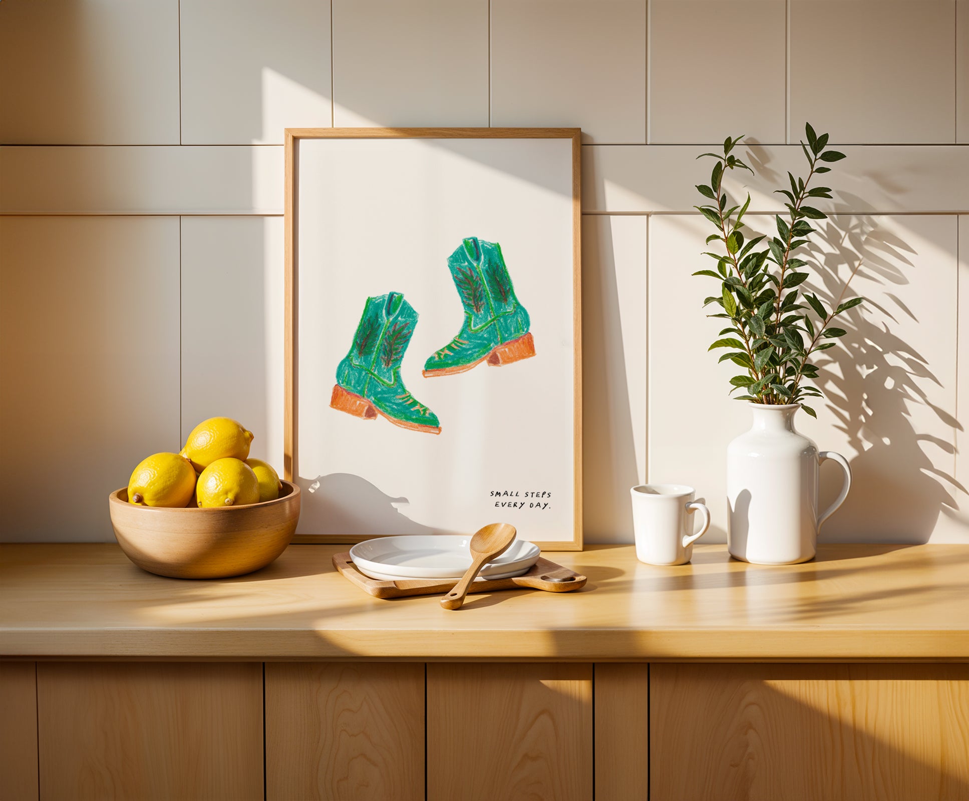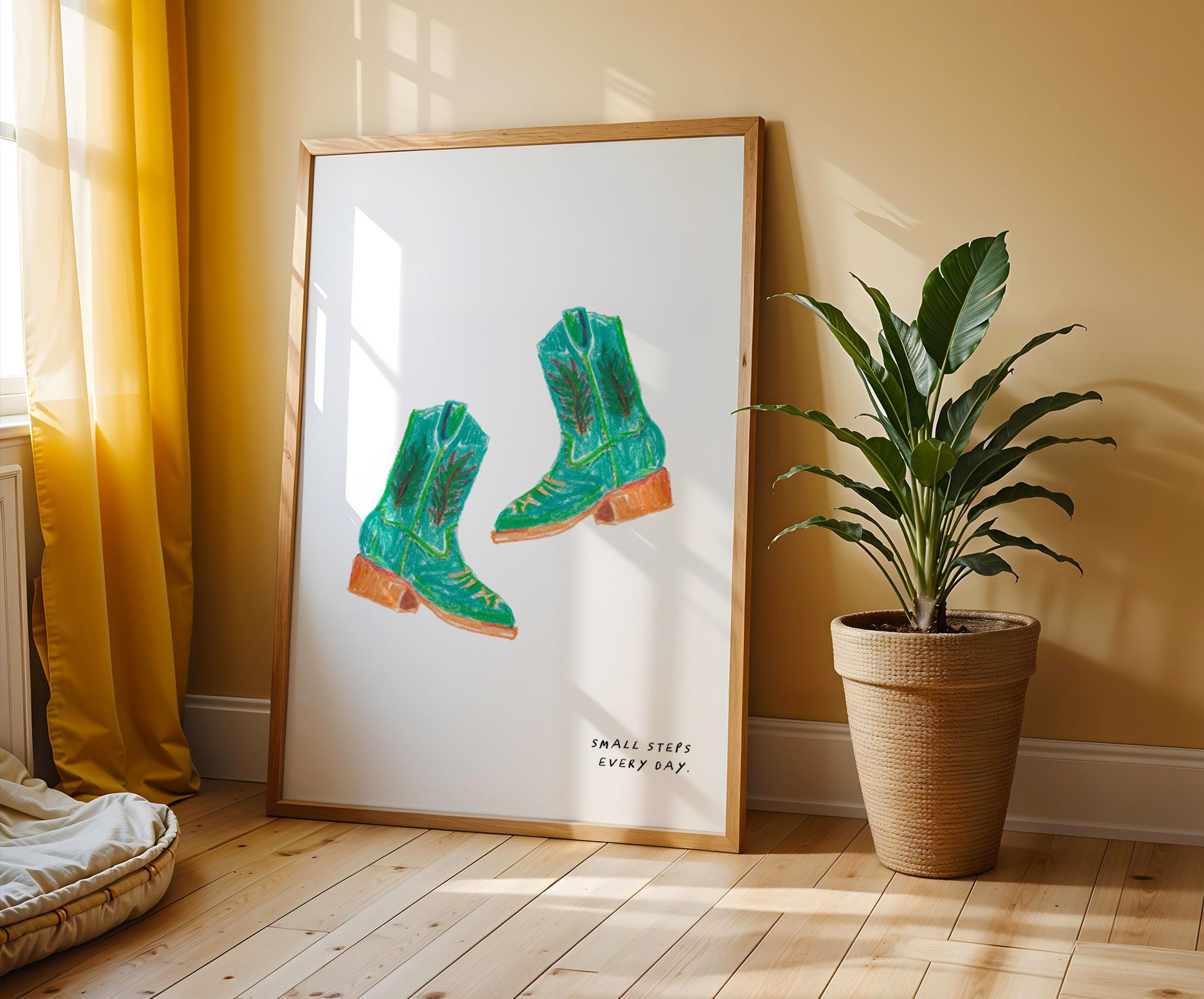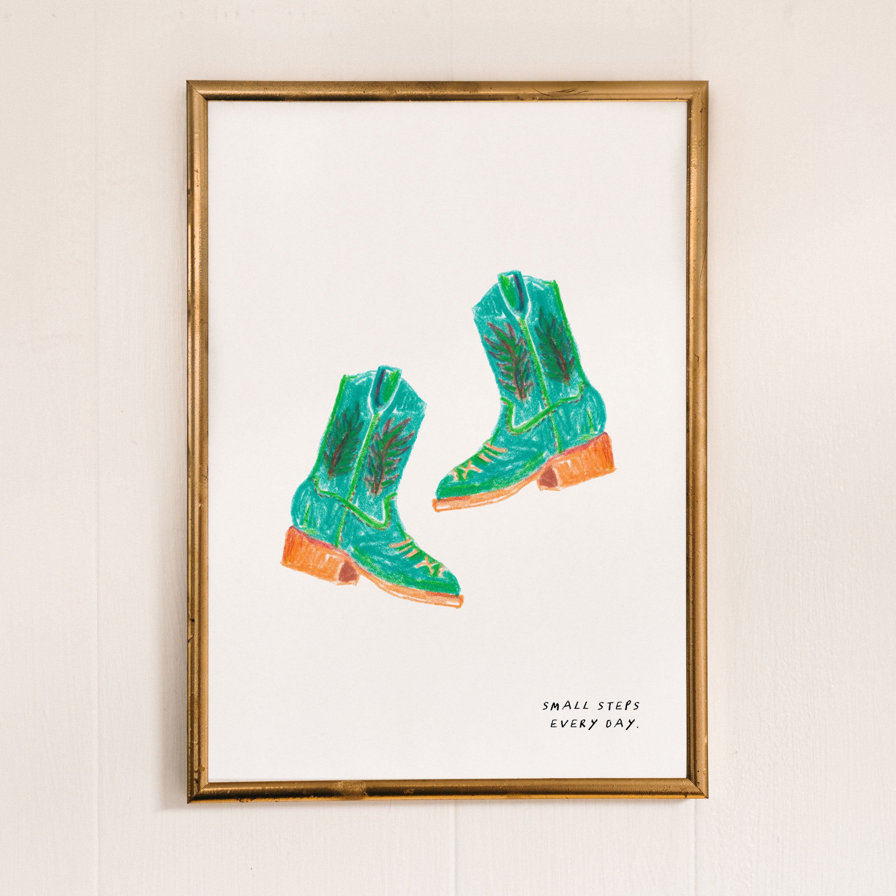 A hand-drawn art print of a pair of green cowgirl boots with the text 'Small steps everyday'.