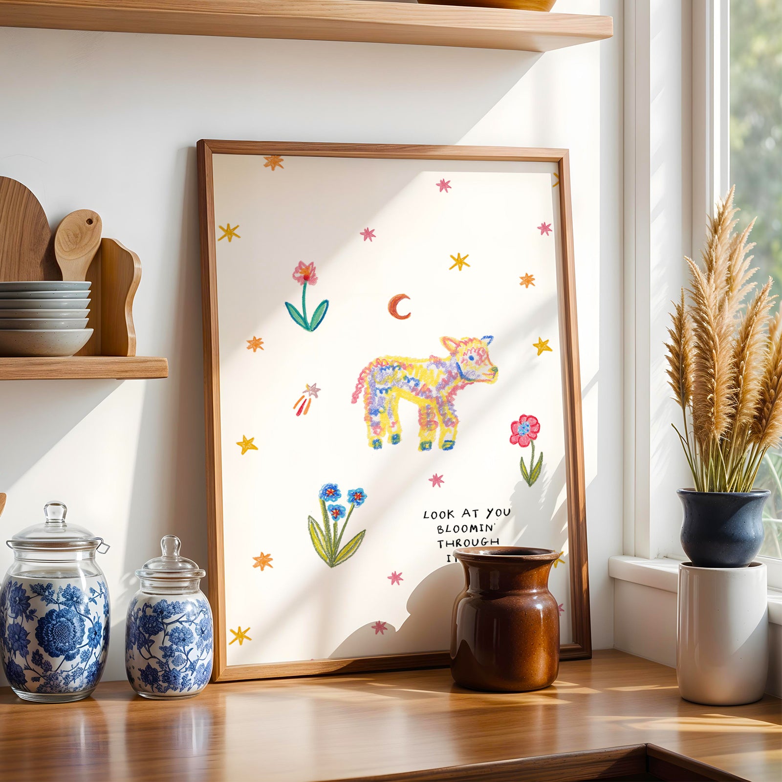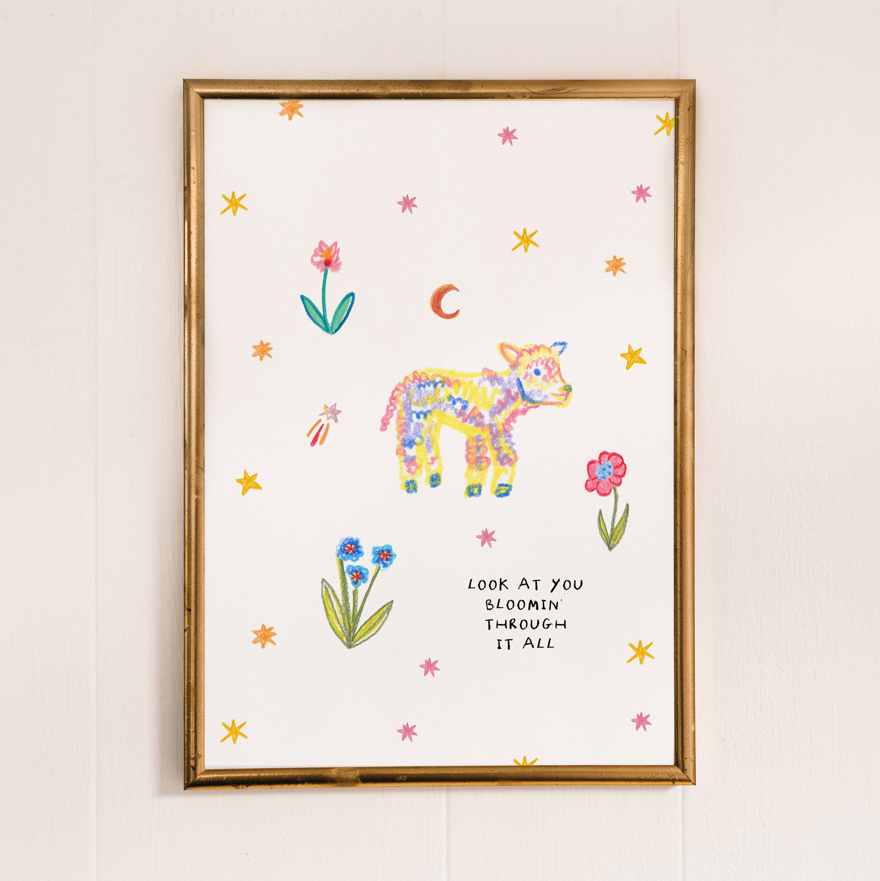 A hand-drawn art print of a lamb surrounded by flowers, stars, and moons with the text 'Look at you bloomin' through it all.' Illustrated in bright blue, yellow, green and pink.