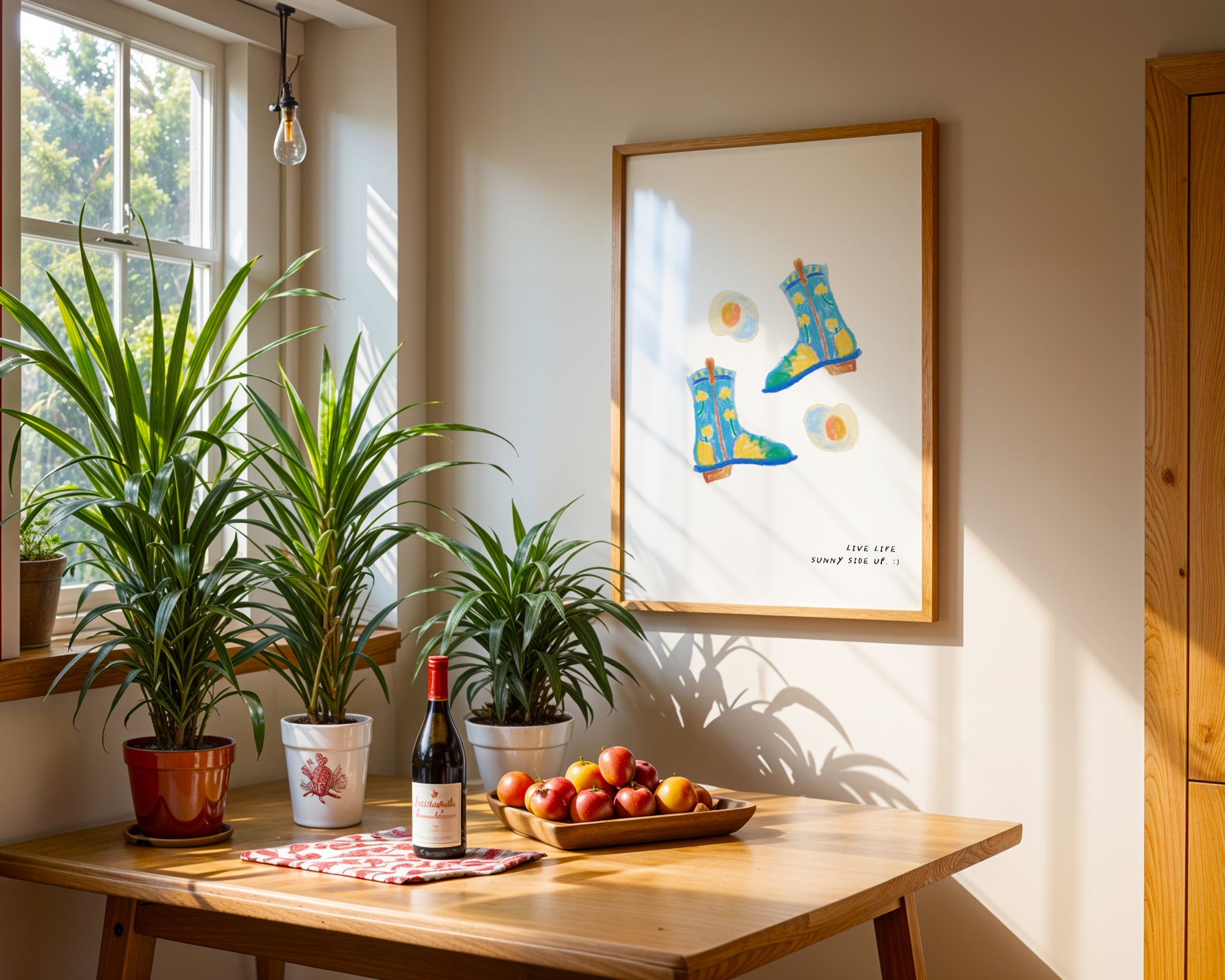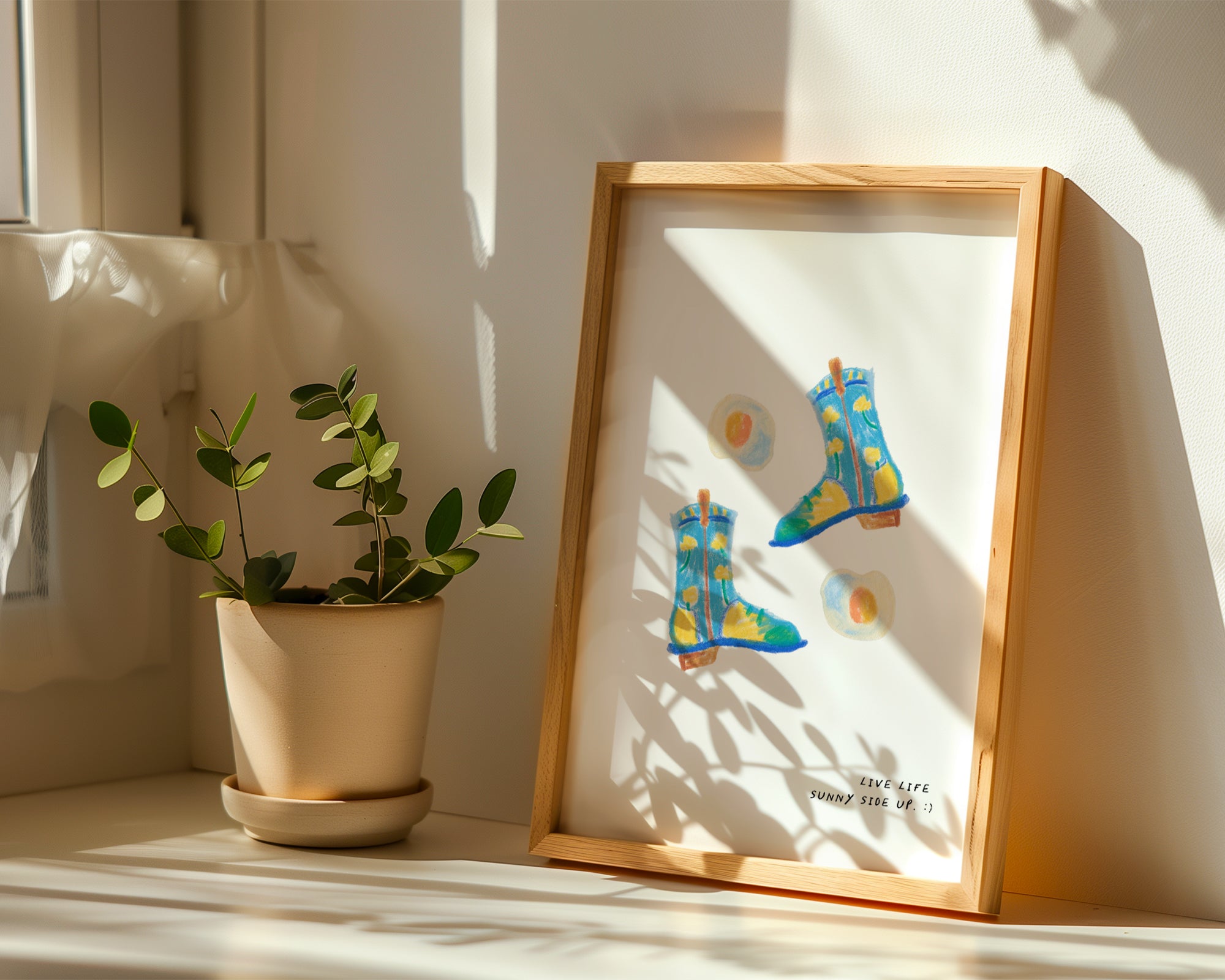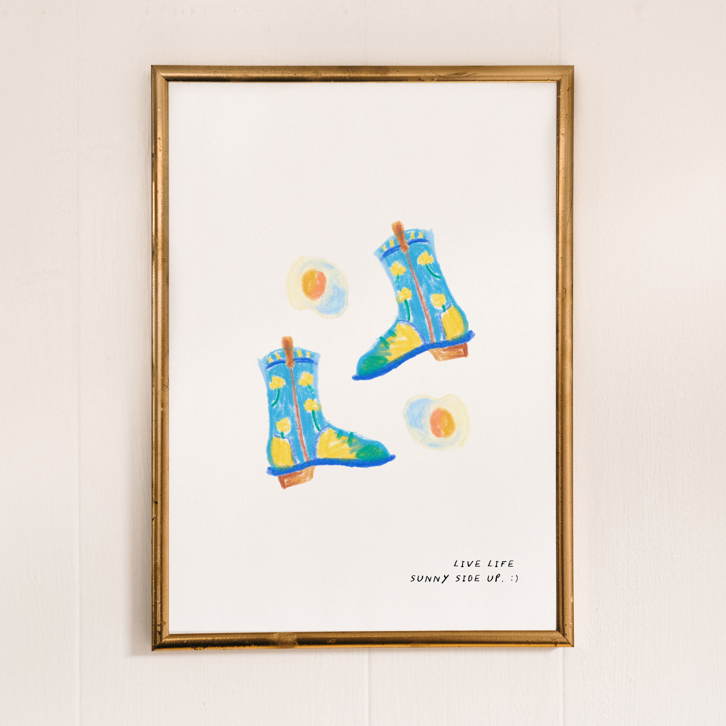 A hand-drawn art print of a pair of blue floral cowgirl boots surrounded by fried eggs with the text 'Live life sunny side up'. Illustrated in blue, yellow, and cream.
