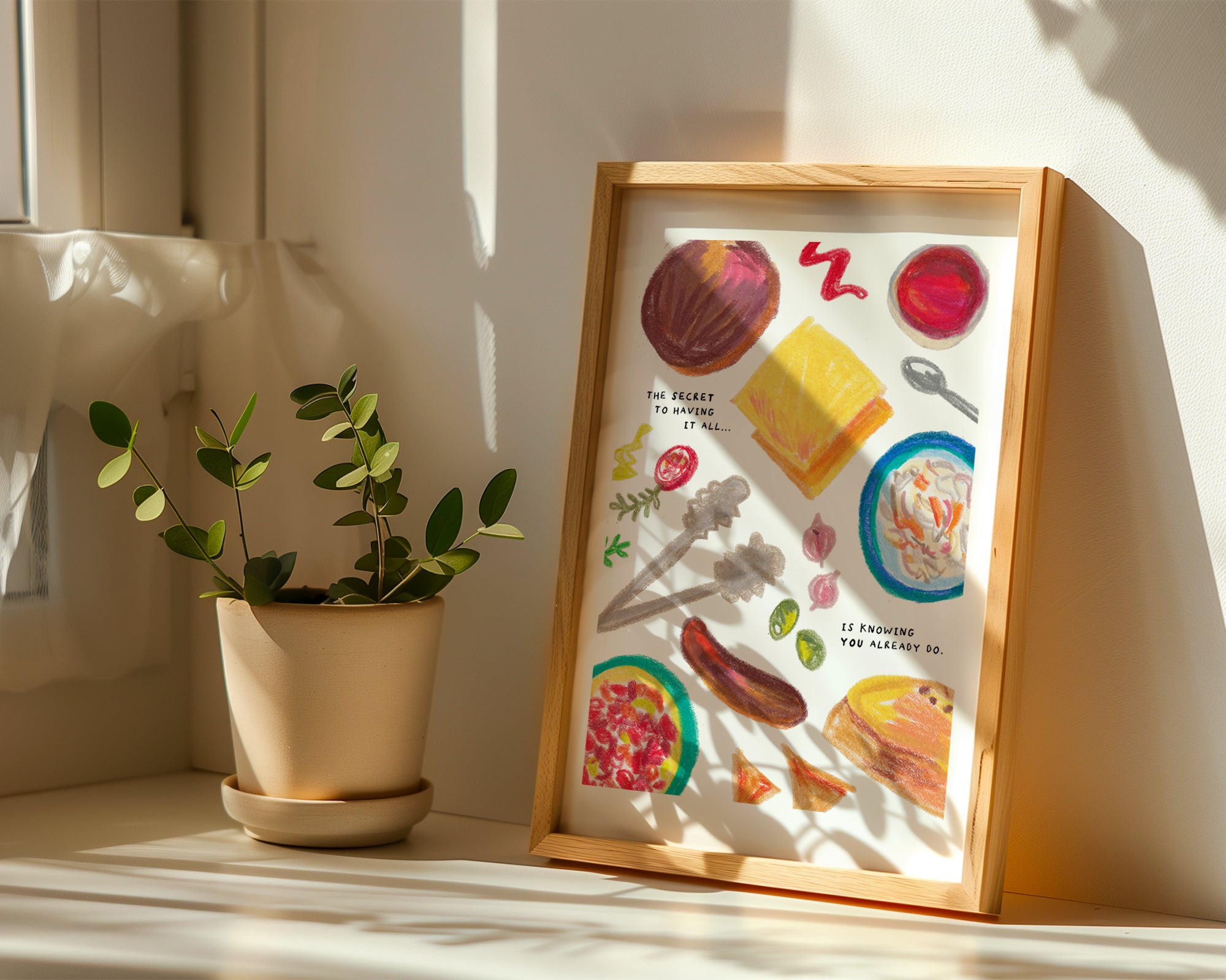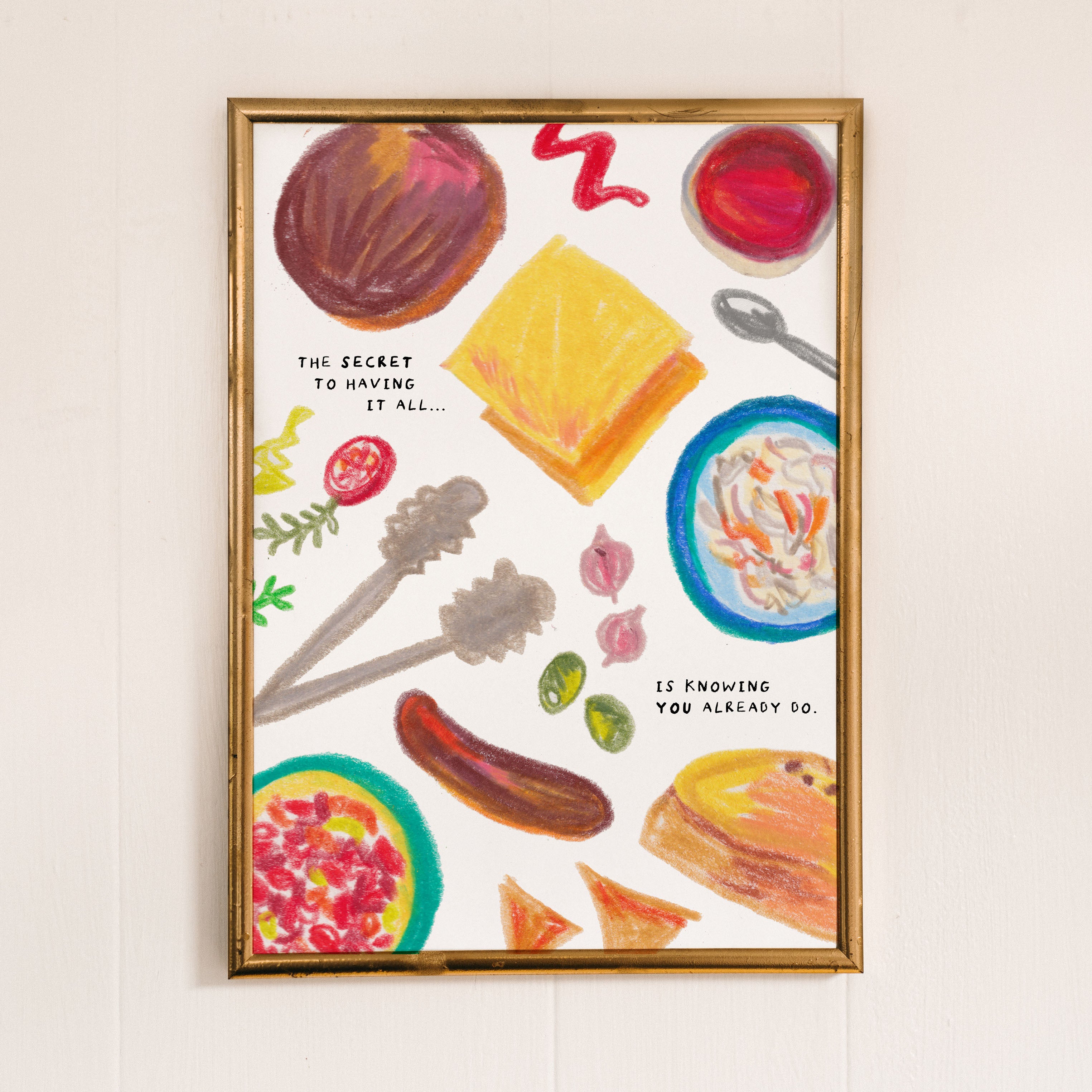 A hand-drawn art print of a summer bbq with the text 'The secret to having it all is knowing you already do.' Illustrated in bright pink, yellow, orange, brown, and blue.
