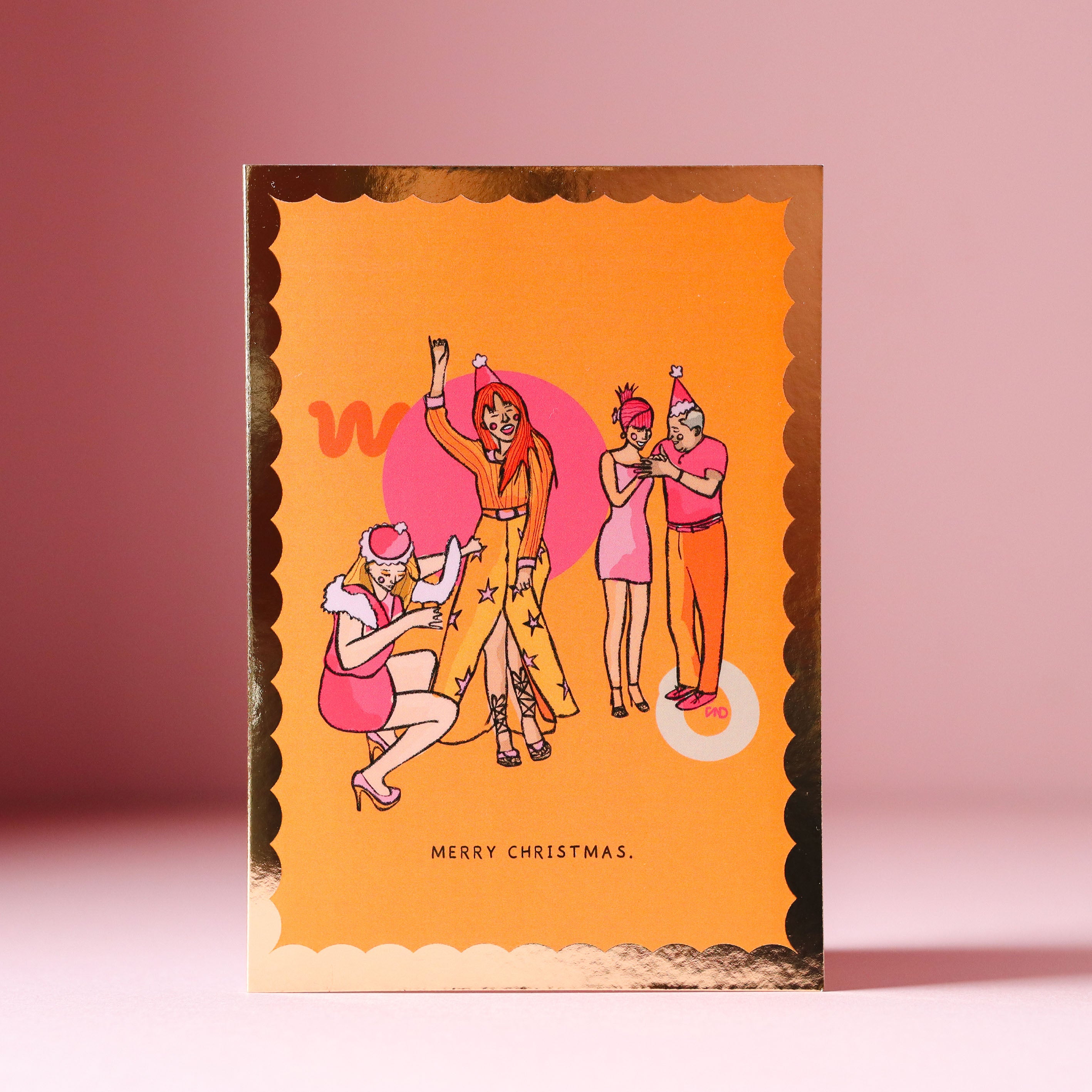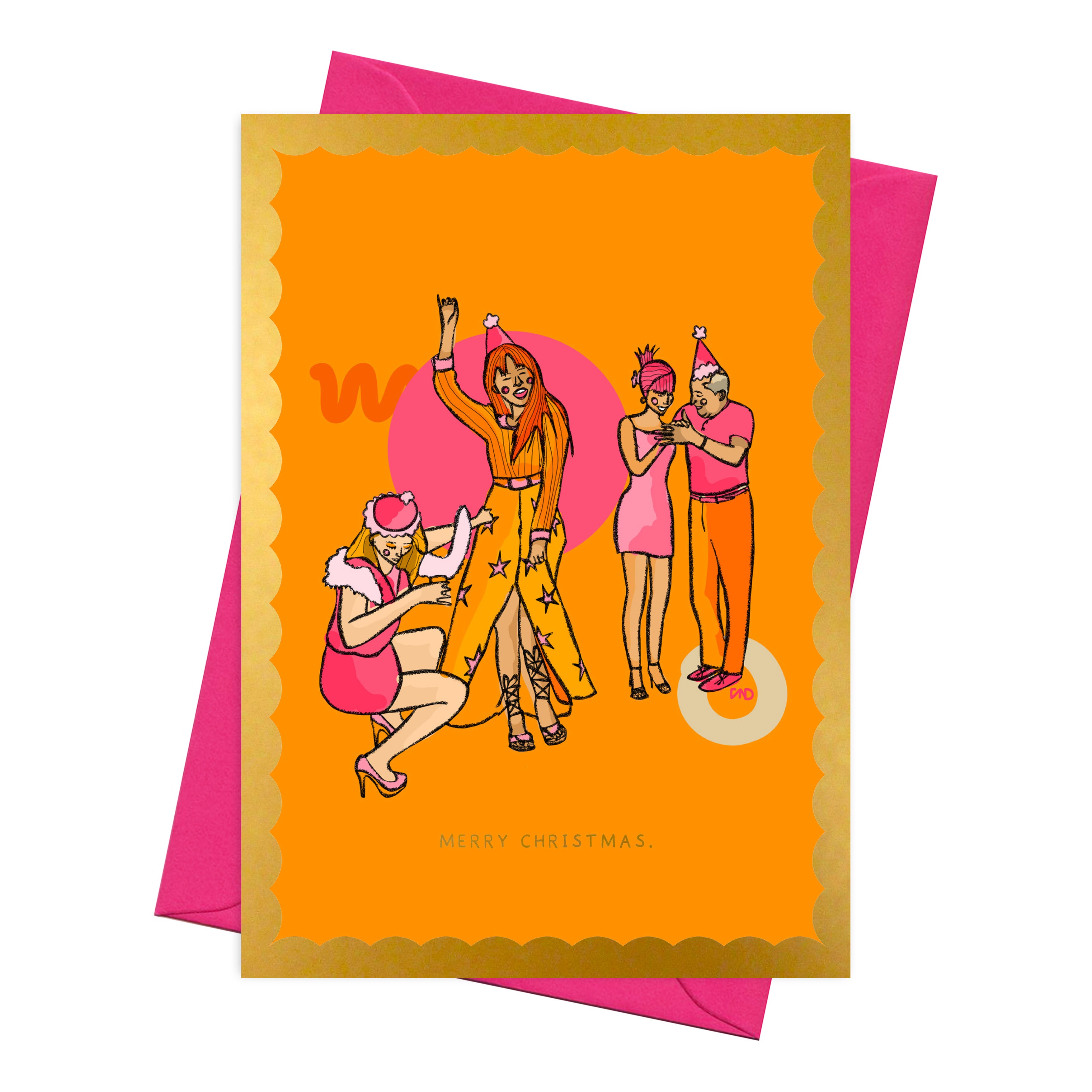 This colourful greeting card features my original artwork of a Christmas party. Illustrated in orange, pink, and yellow with a gold foil scalloped border and text.