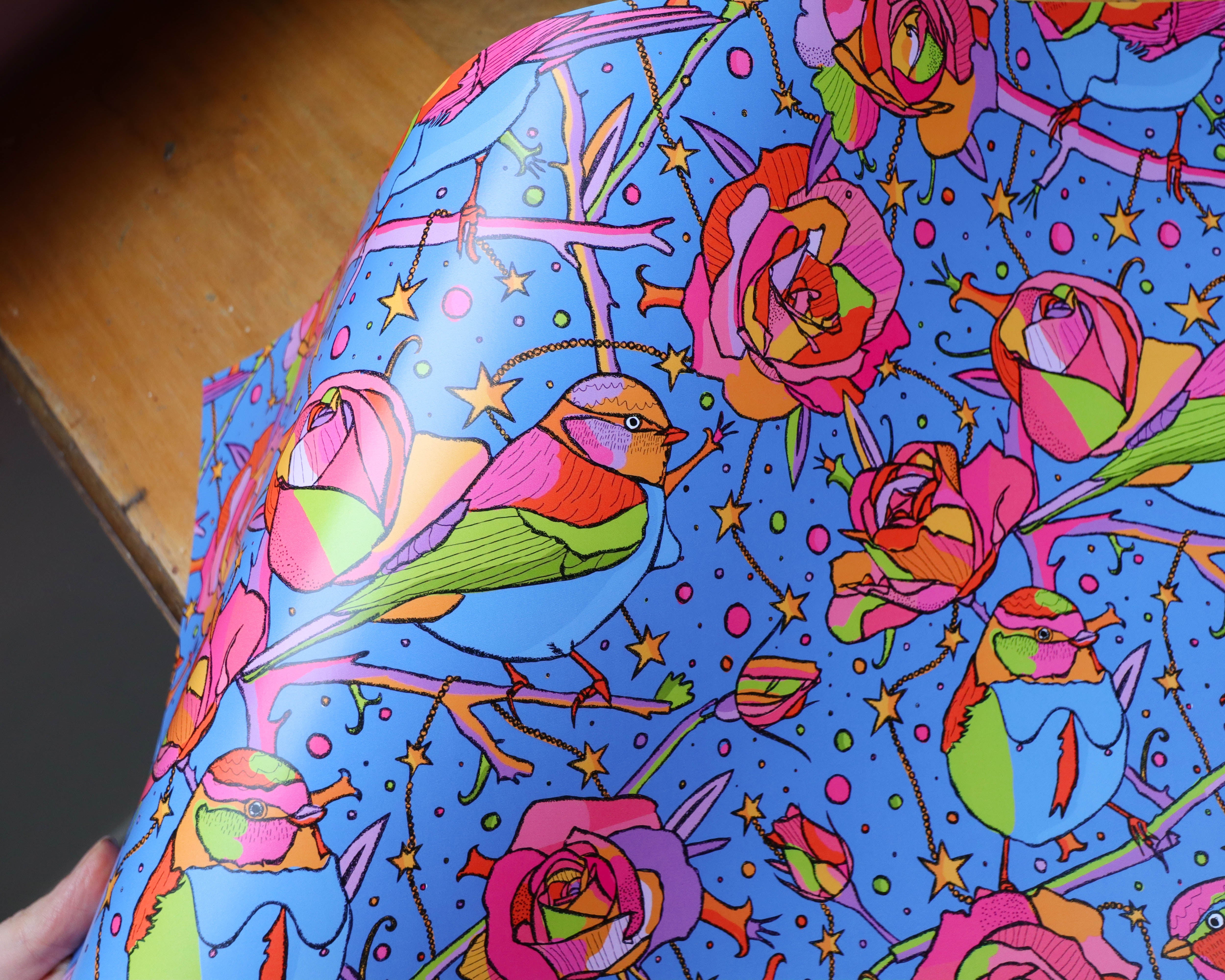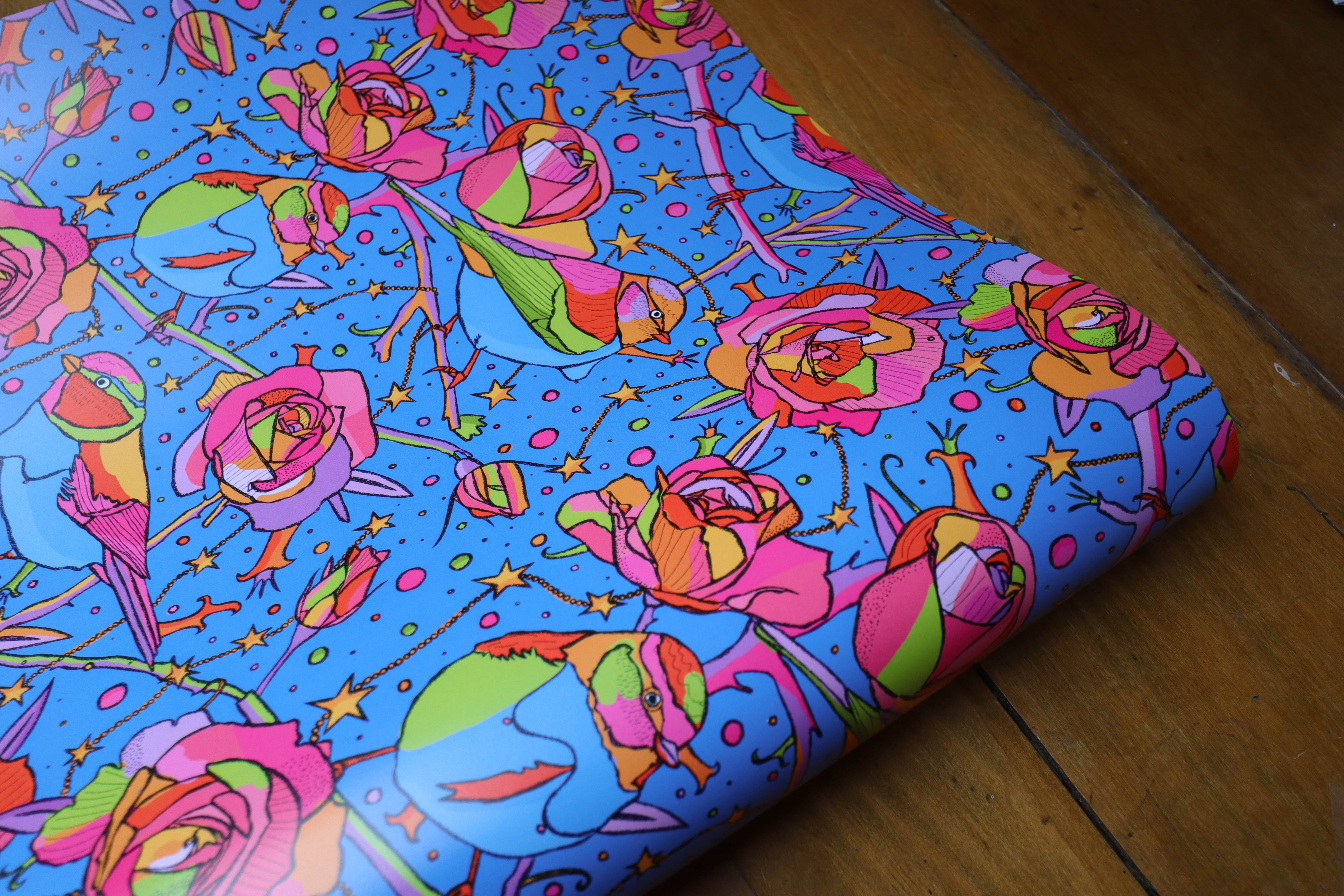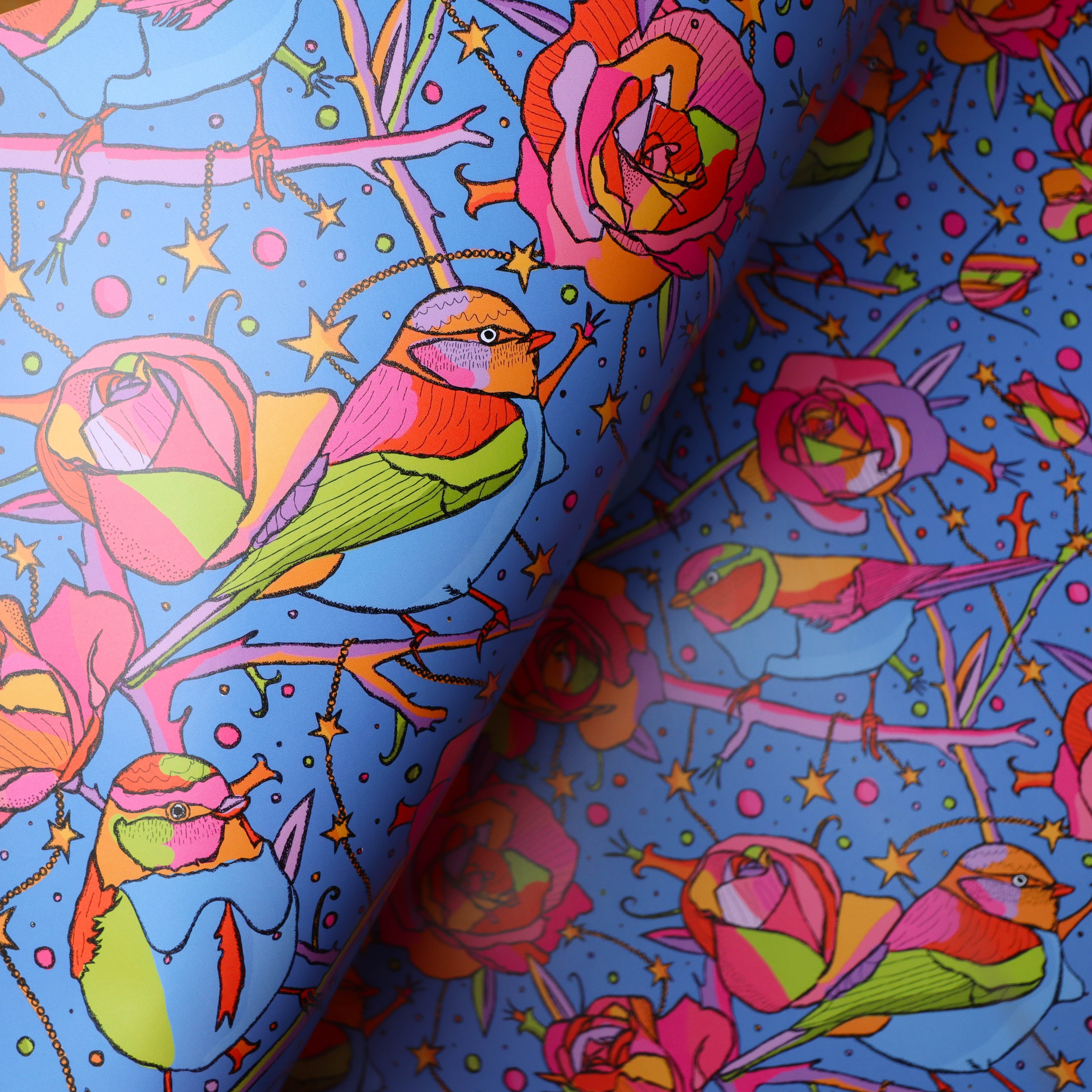 This colourful wrapping paper features my original pattern of some cheeky blue tit birds with their boobies out surrounded by rainbow roses. Illustrated in a rich blue, orange, green, pink, purple, and green.